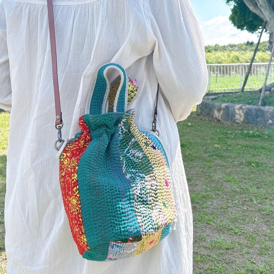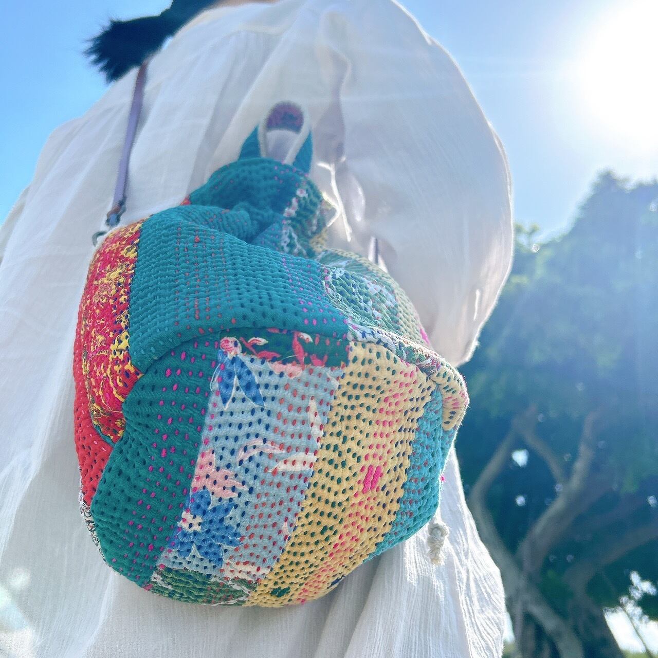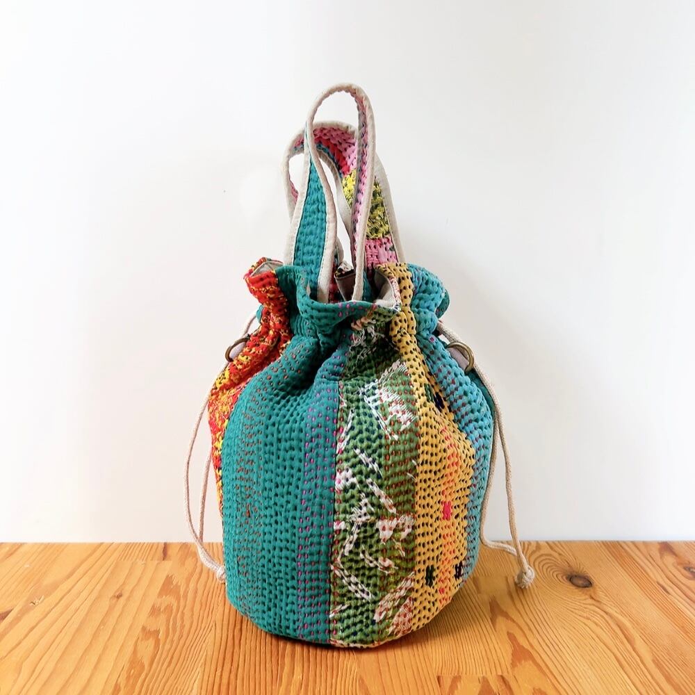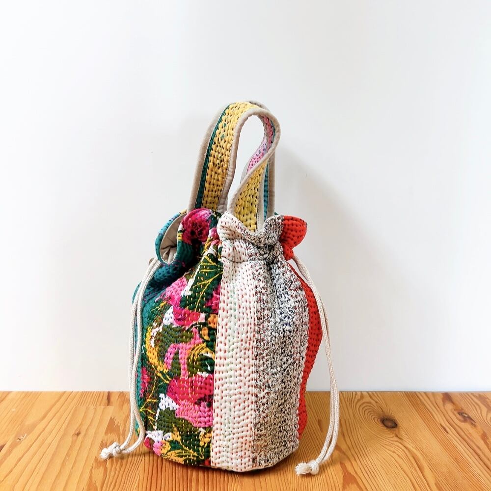 一点もののヴィンテージラリーキルトの巾着バッグ。カラフルなパッチワーク柄と可愛らしいサイズ感が魅力です。