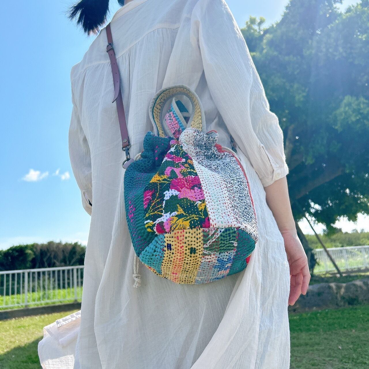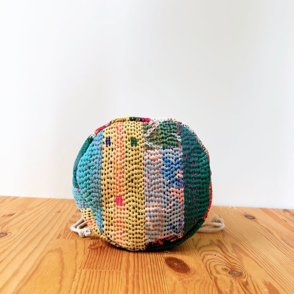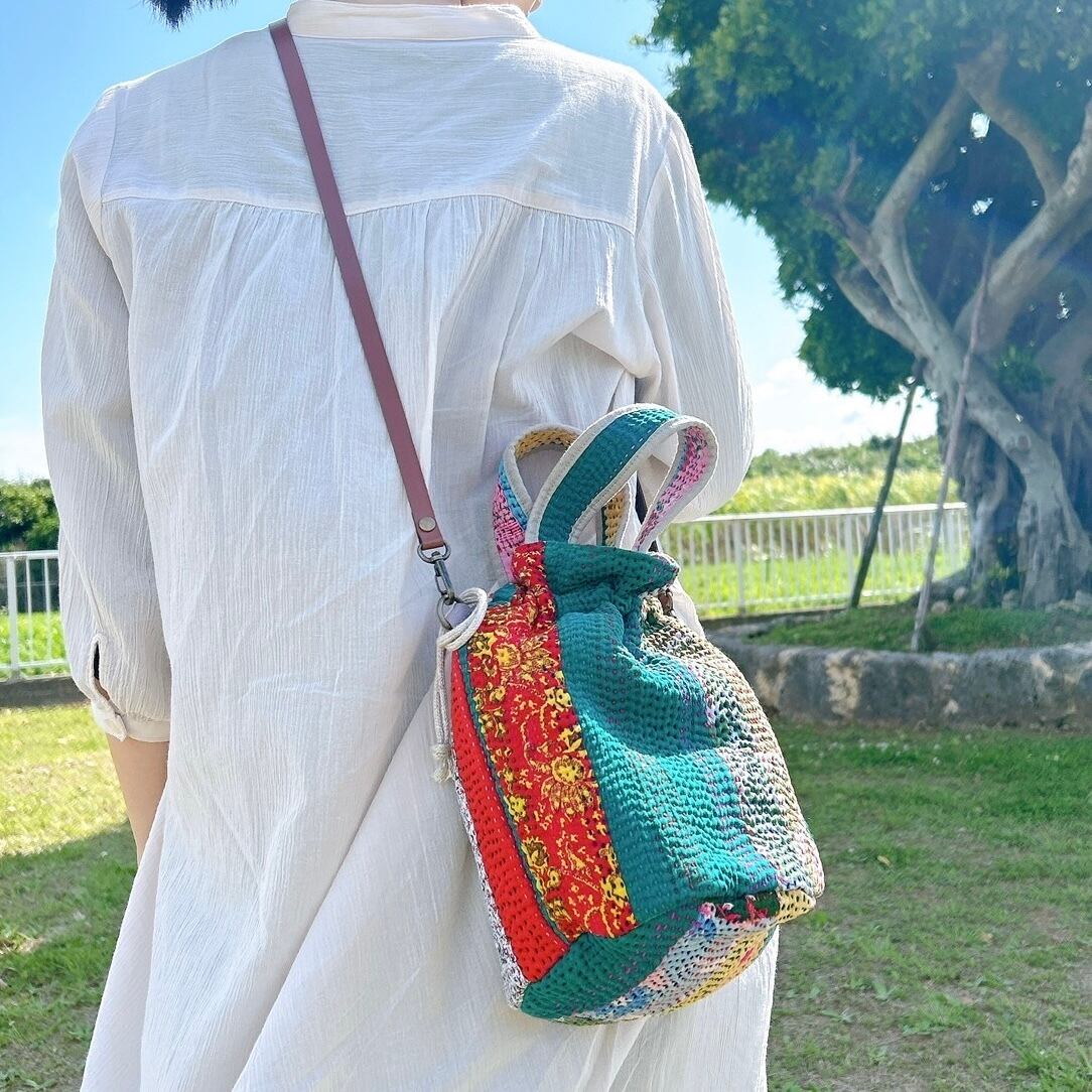 一点もののヴィンテージラリーキルトの巾着バッグ。カラフルなパッチワーク柄と可愛らしいサイズ感が魅力です。
