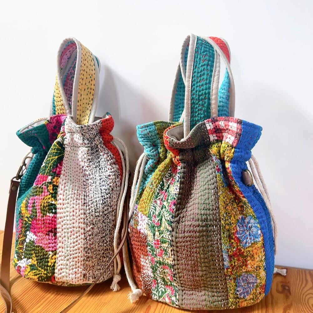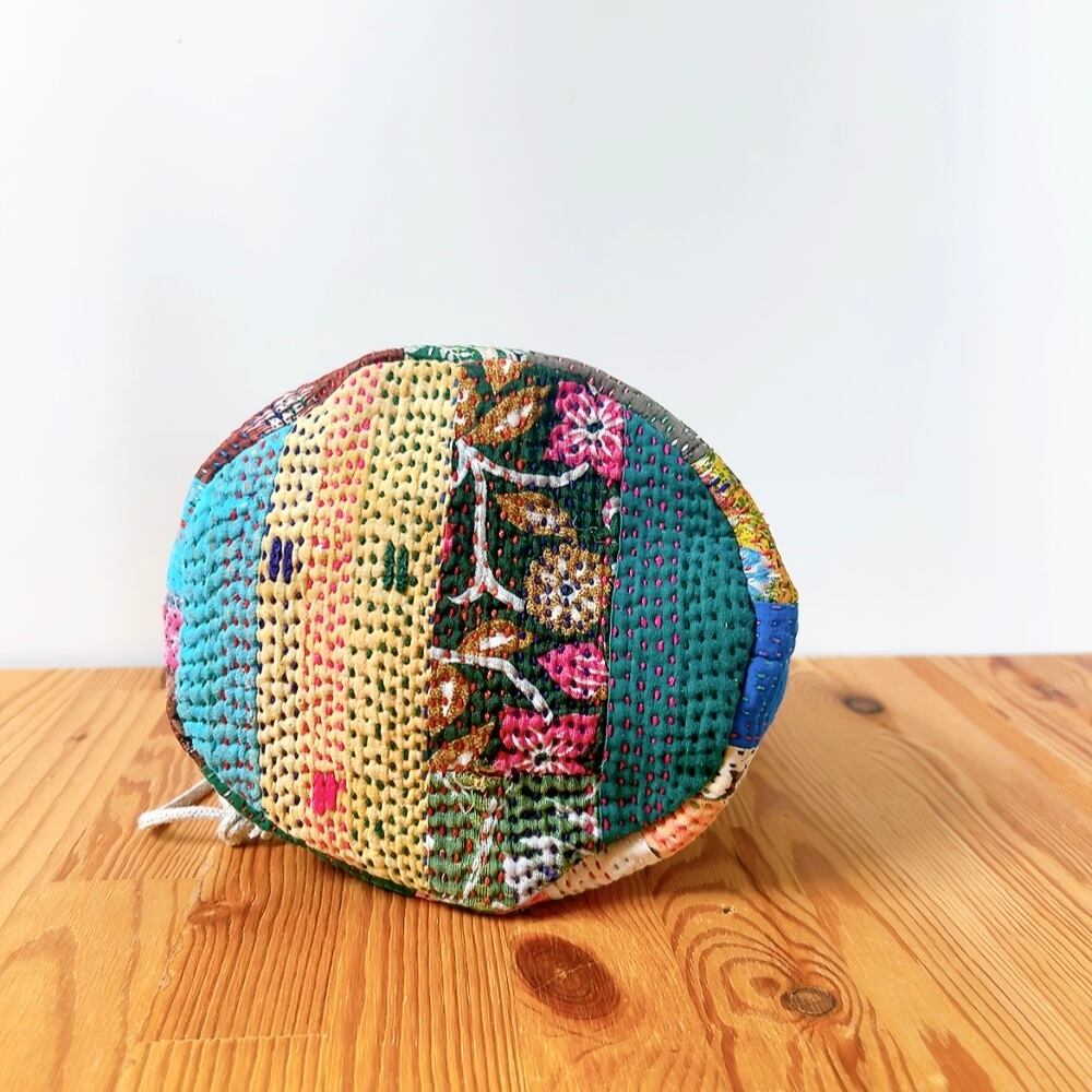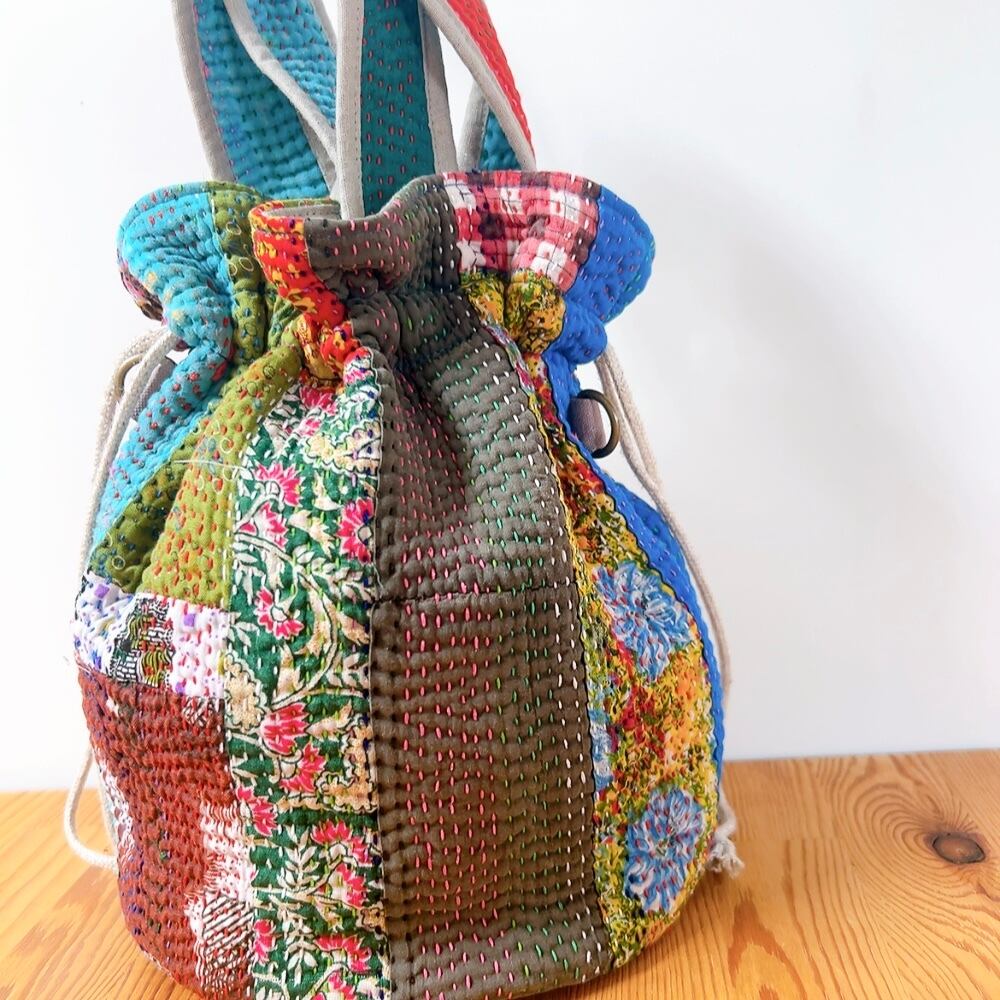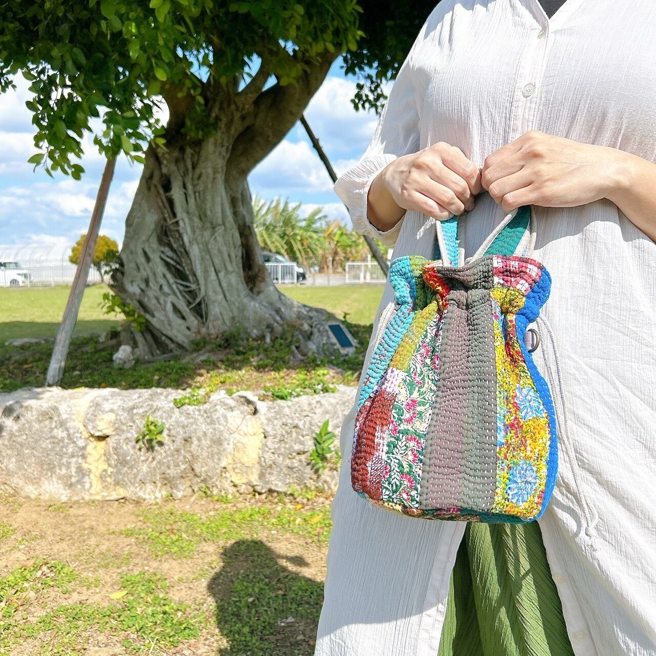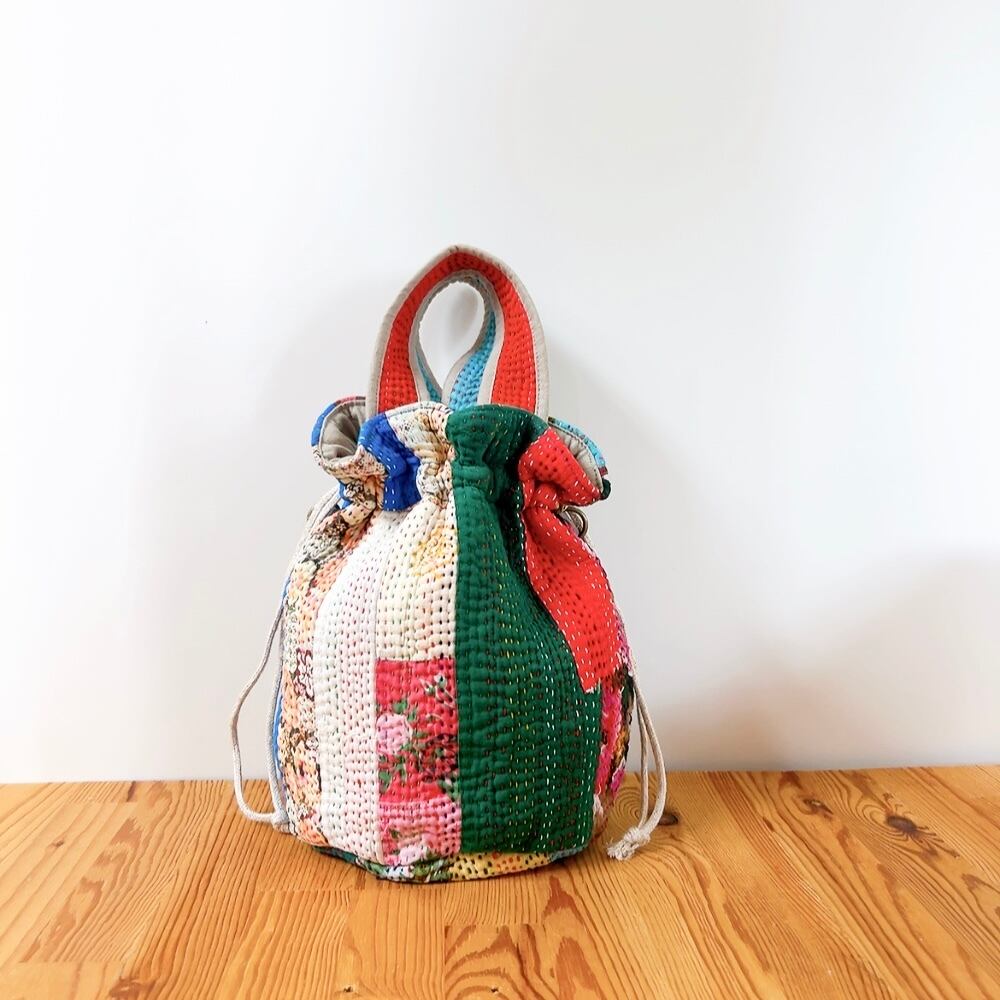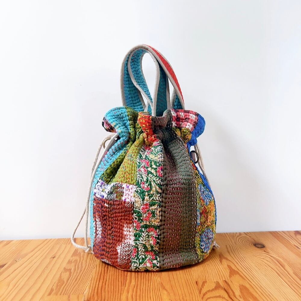 一点もののヴィンテージラリーキルトの巾着バッグ。カラフルなパッチワーク柄と可愛らしいサイズ感が魅力です。