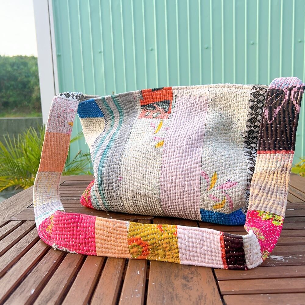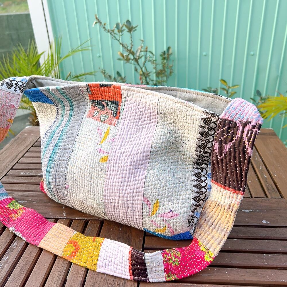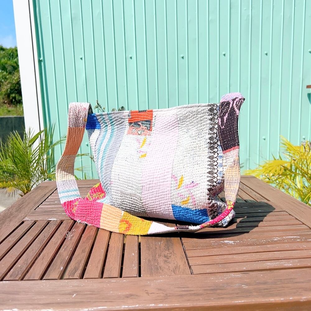 ヴィンテージラリーキルトから作られた、マチ付きショルダーバッグです。個性的なパッチワーク柄が施されており、手作りの温かみを感じることができます。