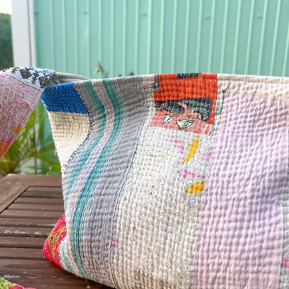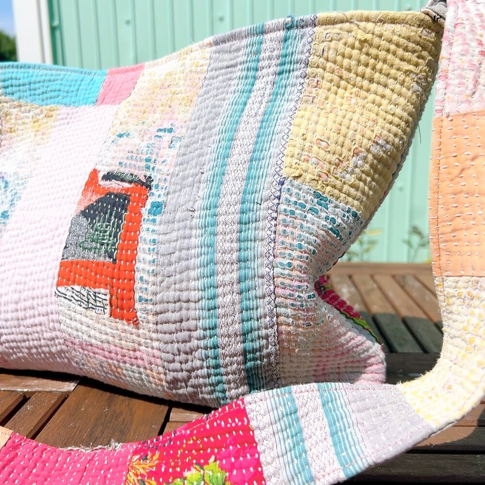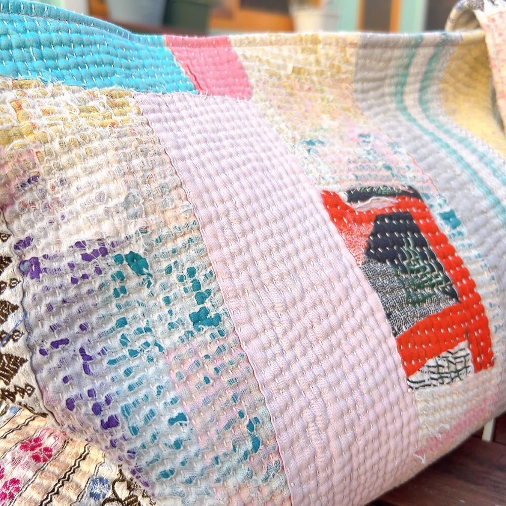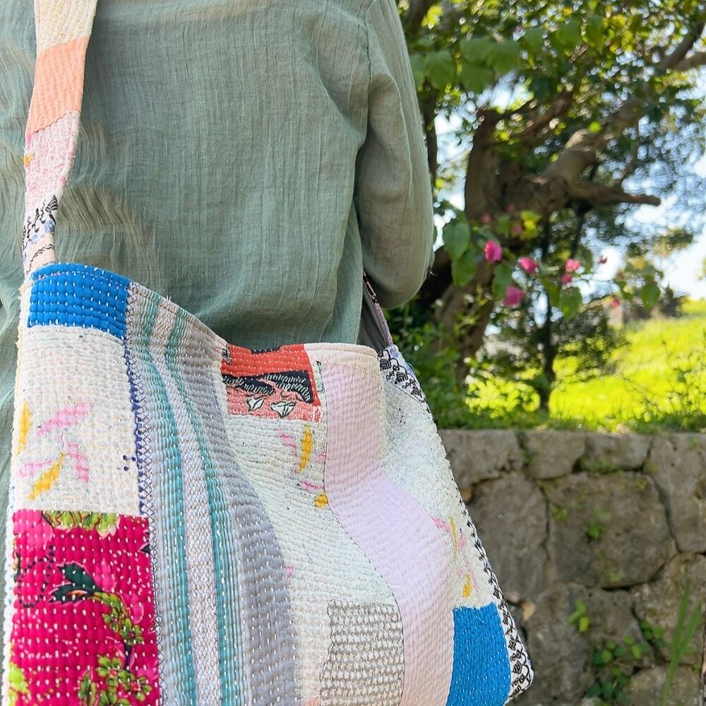 ヴィンテージラリーキルトから作られた、マチ付きショルダーバッグです。個性的なパッチワーク柄が施されており、手作りの温かみを感じることができます。
