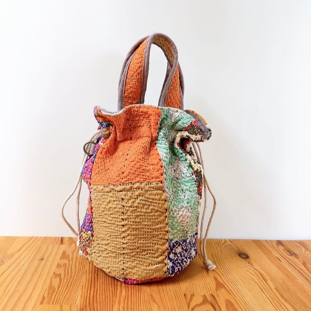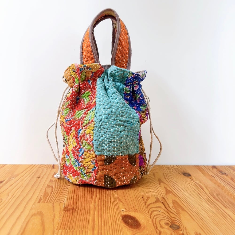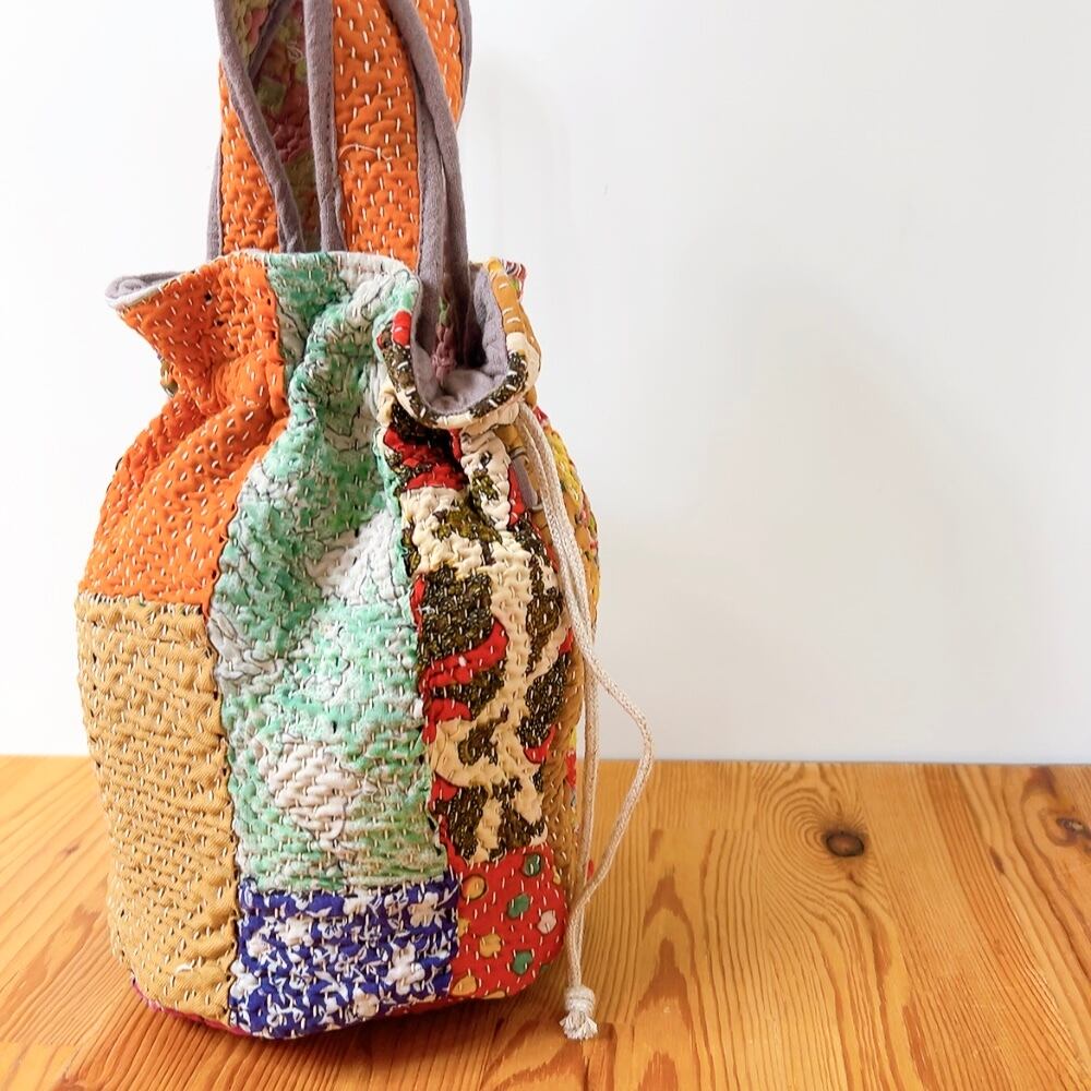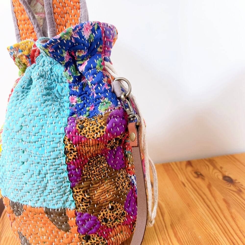 一点もののヴィンテージラリーキルトの巾着バッグ。カラフルなパッチワーク柄と可愛らしいサイズ感が魅力です。