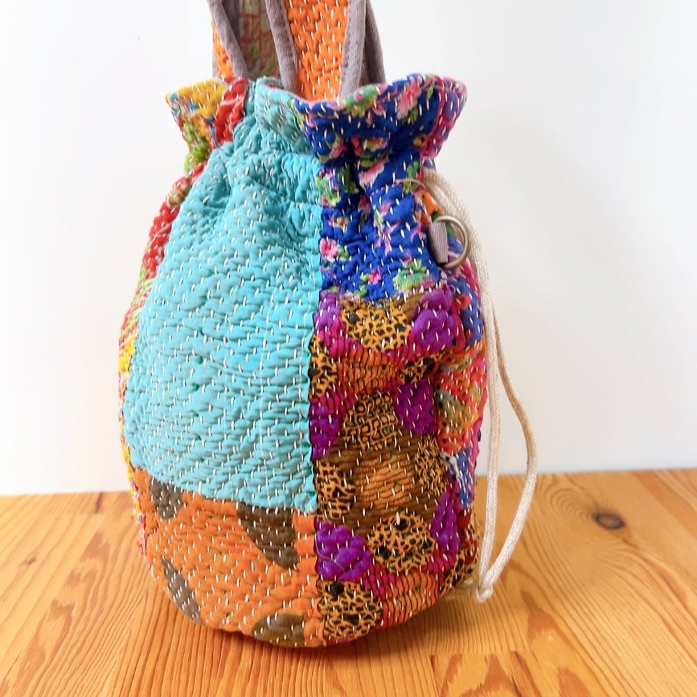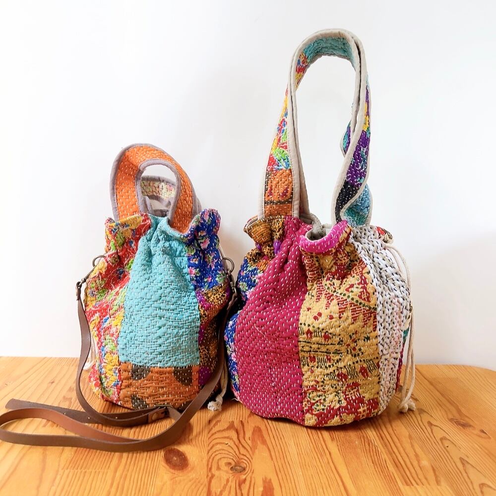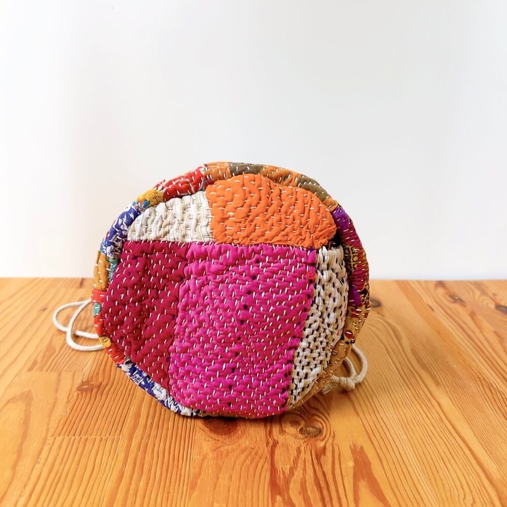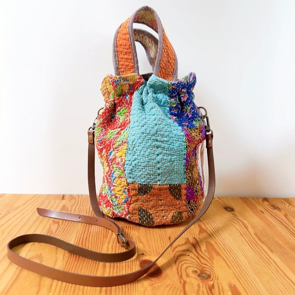 一点もののヴィンテージラリーキルトの巾着バッグ。カラフルなパッチワーク柄と可愛らしいサイズ感が魅力です。