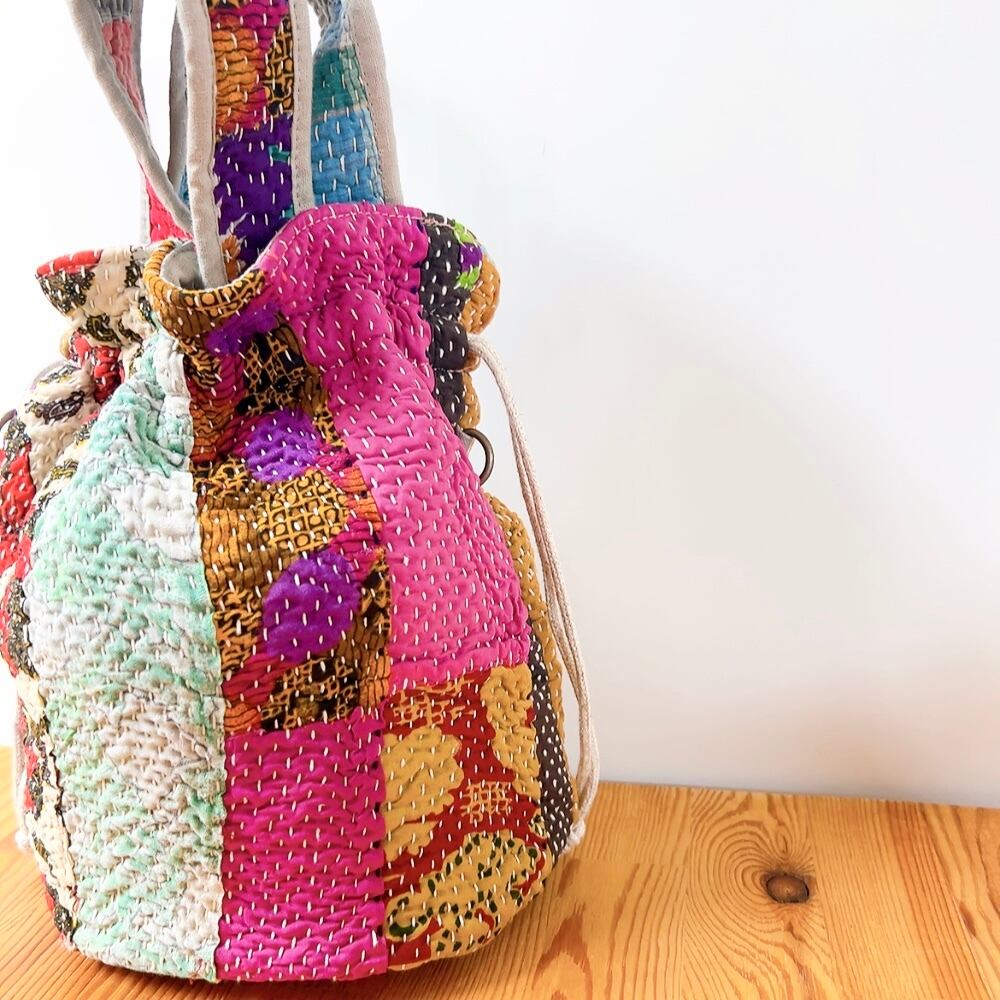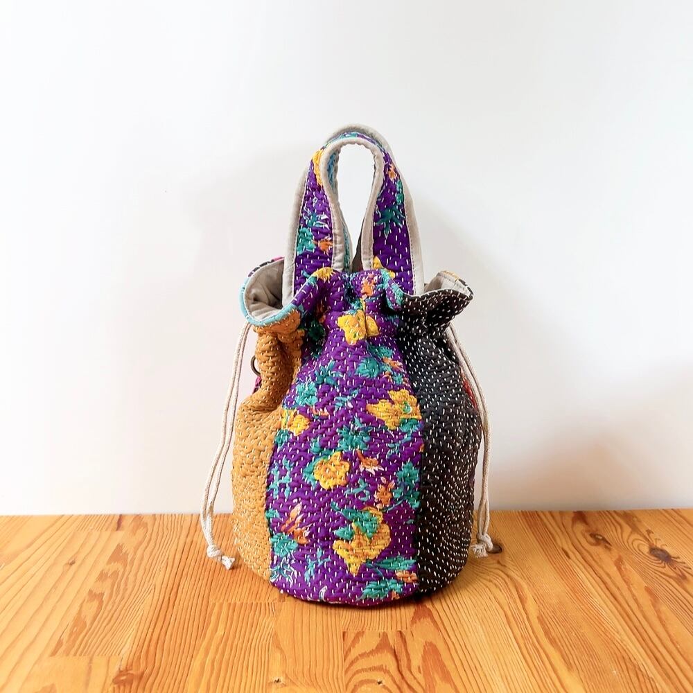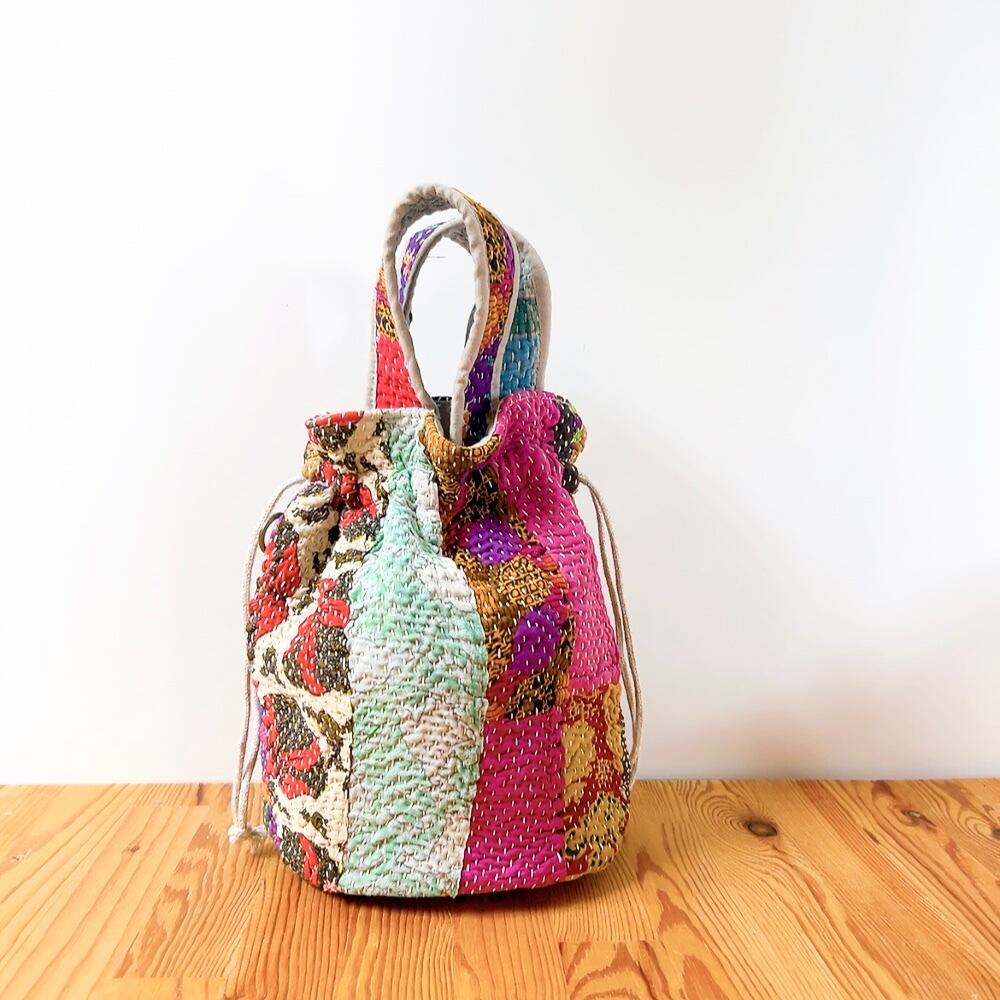 一点もののヴィンテージラリーキルトの巾着バッグ。カラフルなパッチワーク柄と可愛らしいサイズ感が魅力です。