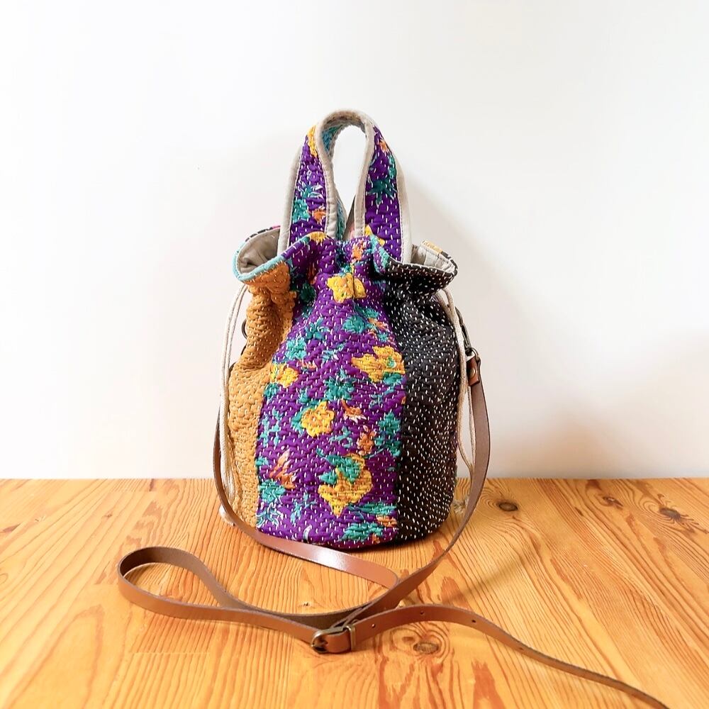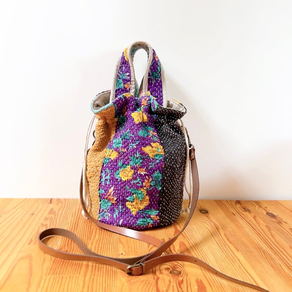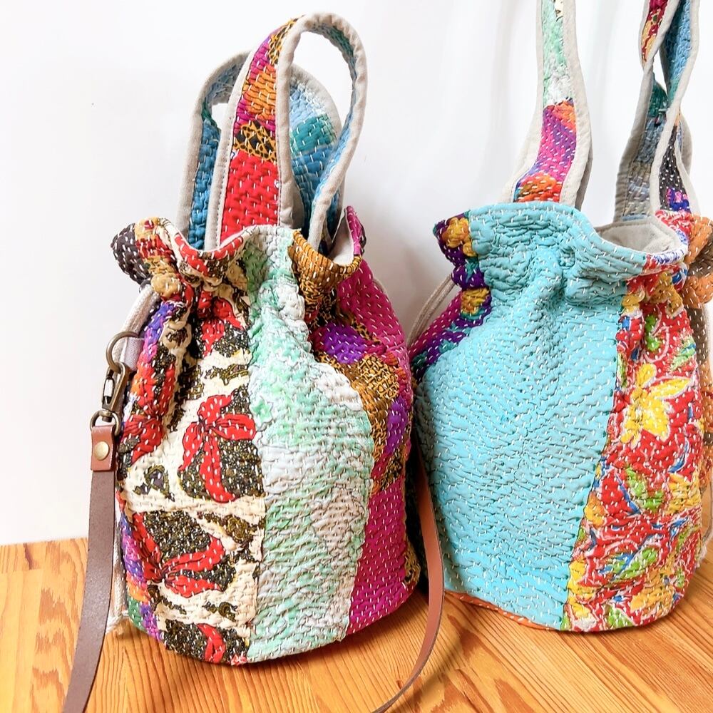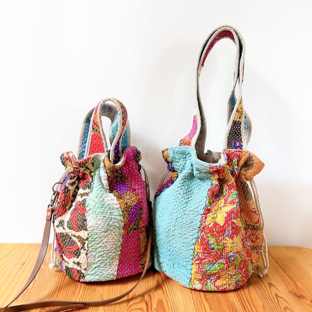 一点もののヴィンテージラリーキルトの巾着バッグ。カラフルなパッチワーク柄と可愛らしいサイズ感が魅力です。