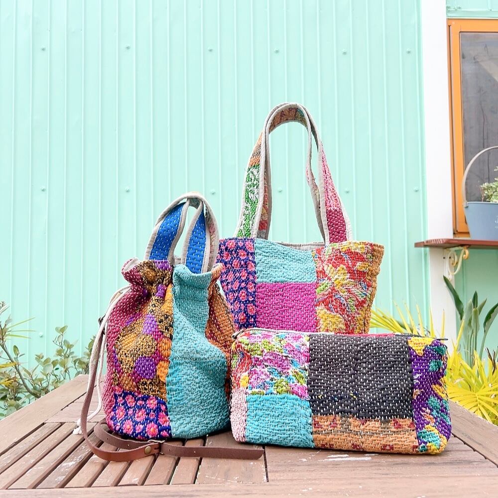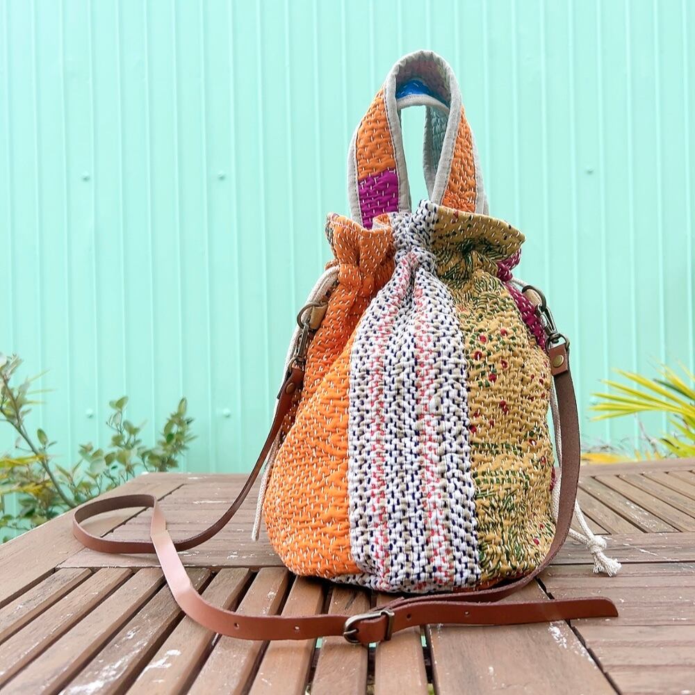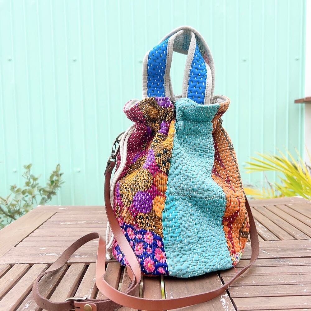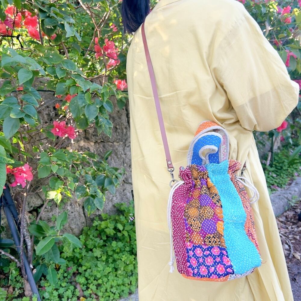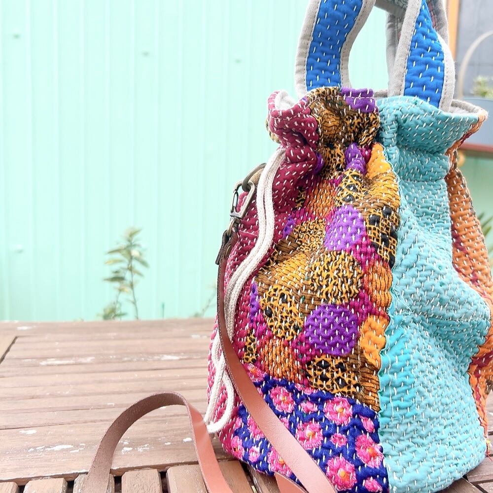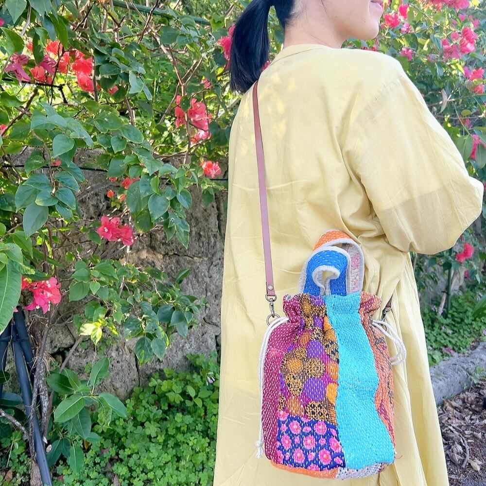一点もののヴィンテージラリーキルトの巾着バッグ。カラフルなパッチワーク柄と可愛らしいサイズ感が魅力です。