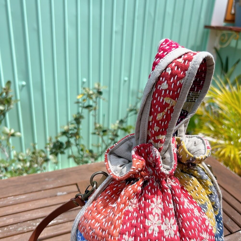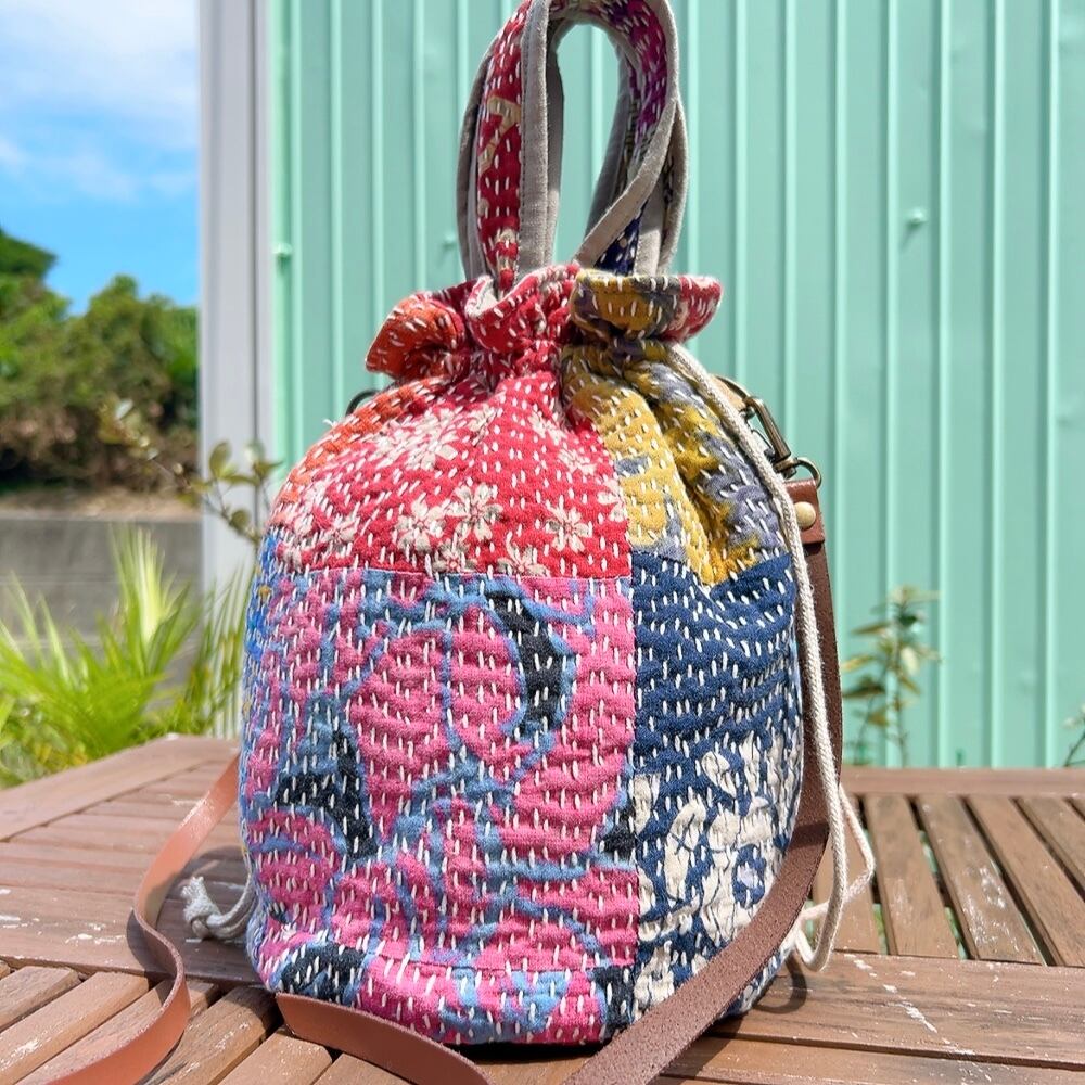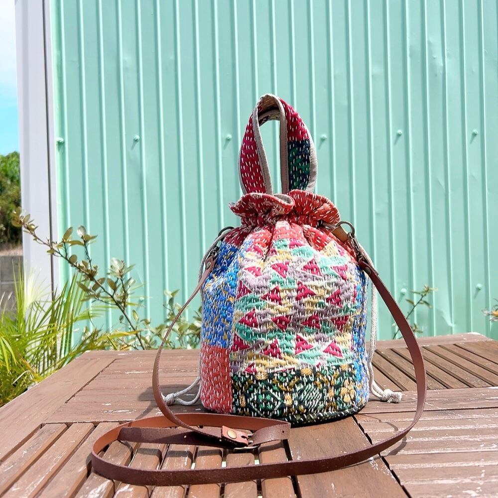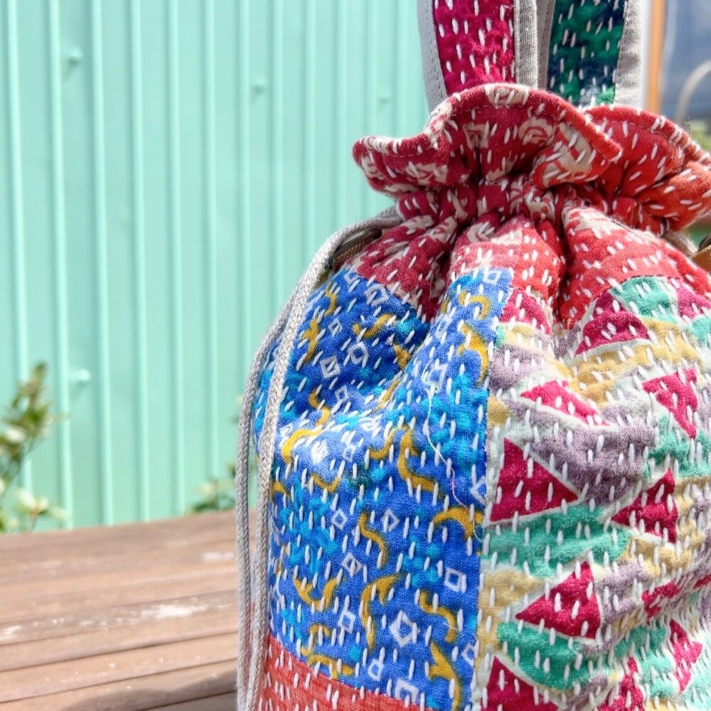 一点もののヴィンテージラリーキルトの巾着バッグ。カラフルなパッチワーク柄と可愛らしいサイズ感が魅力です。