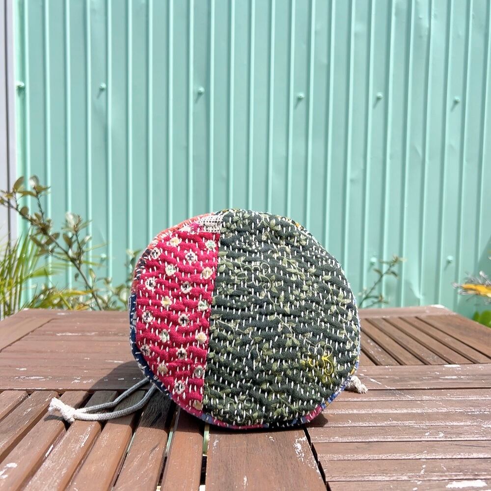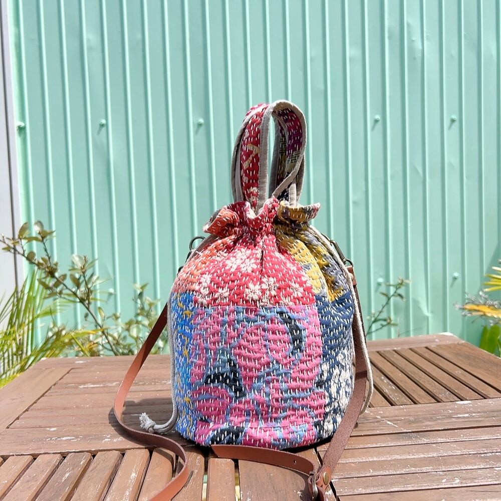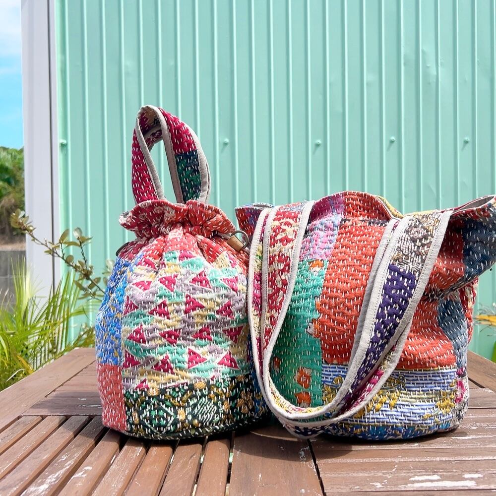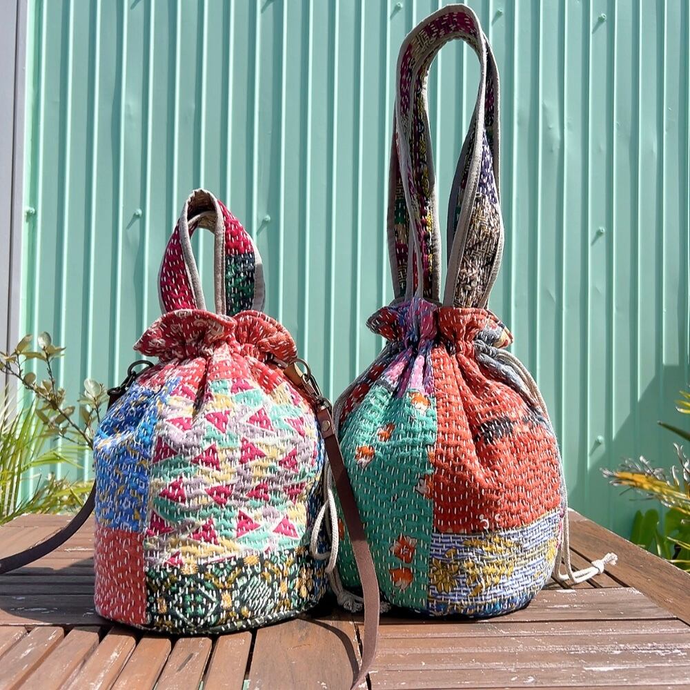 一点もののヴィンテージラリーキルトの巾着バッグ。カラフルなパッチワーク柄と可愛らしいサイズ感が魅力です。