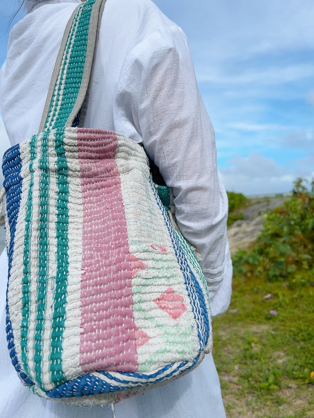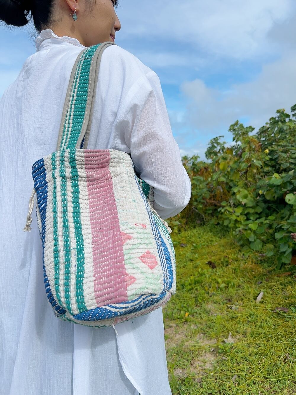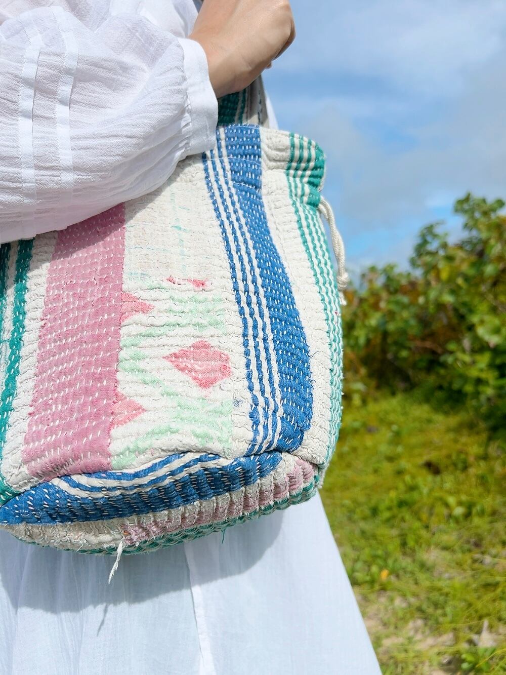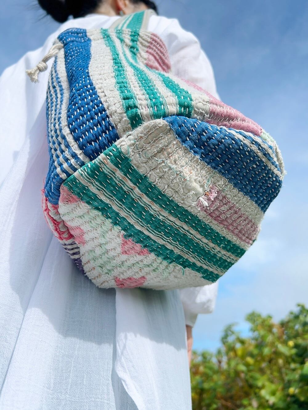 インドの伝統的な刺し子布「ラリーキルト」を贅沢に使用した、巾着型のトートバッグです。