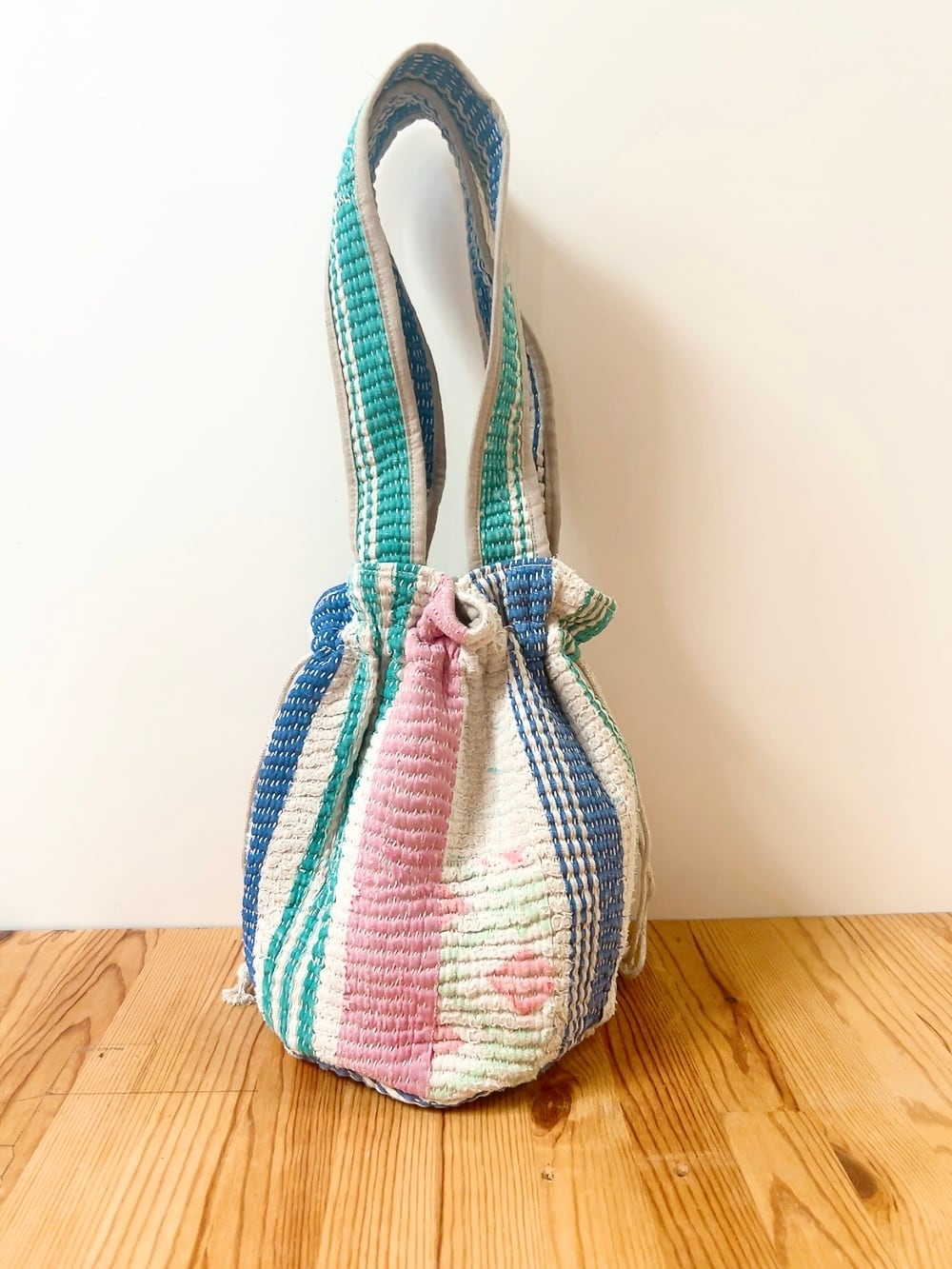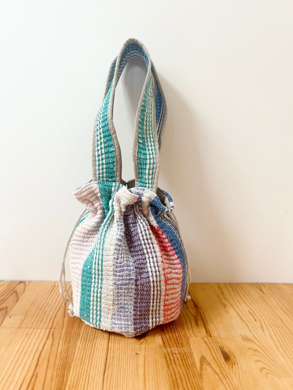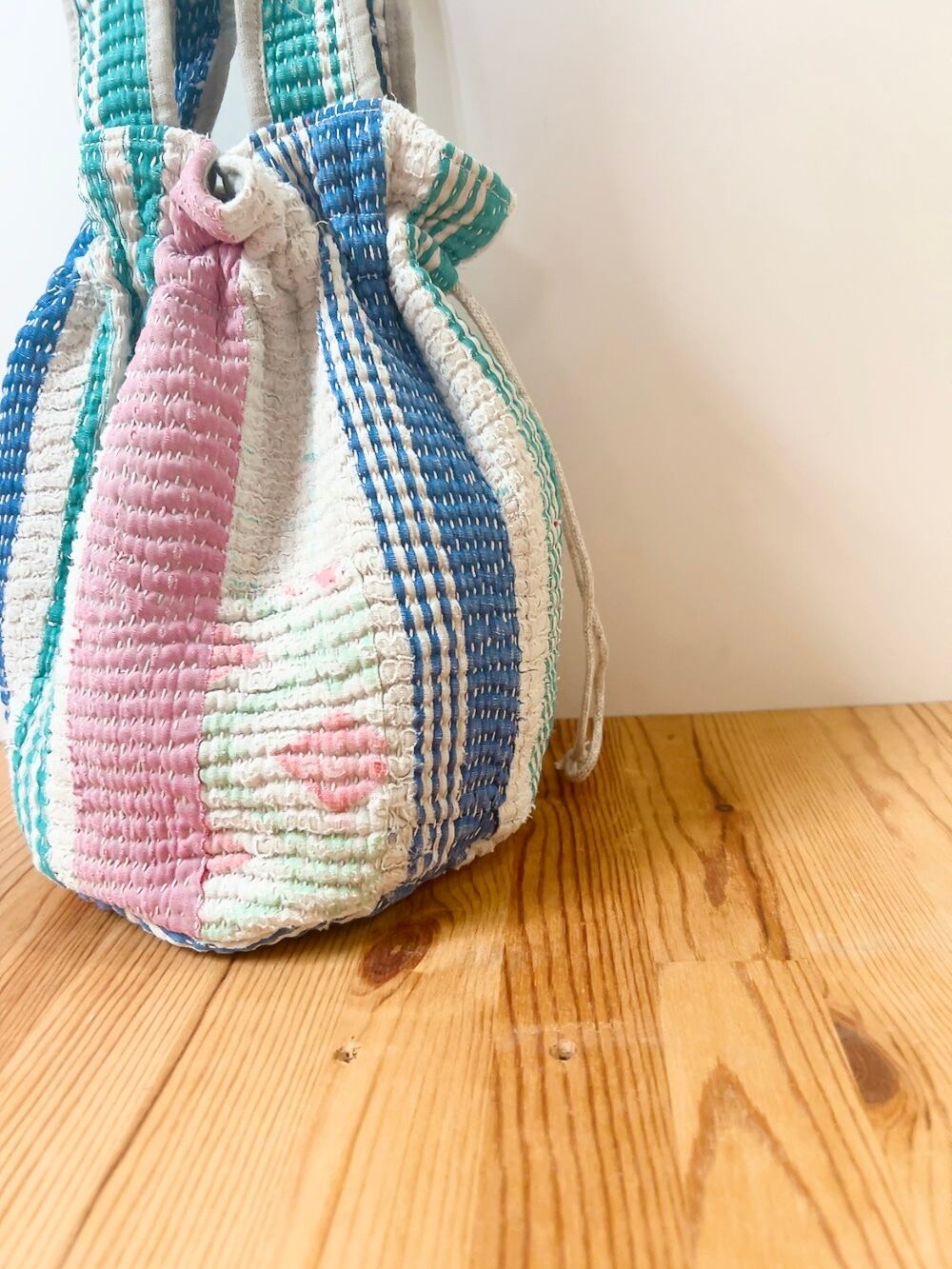 インドの伝統的な刺し子布「ラリーキルト」を贅沢に使用した、巾着型のトートバッグです。