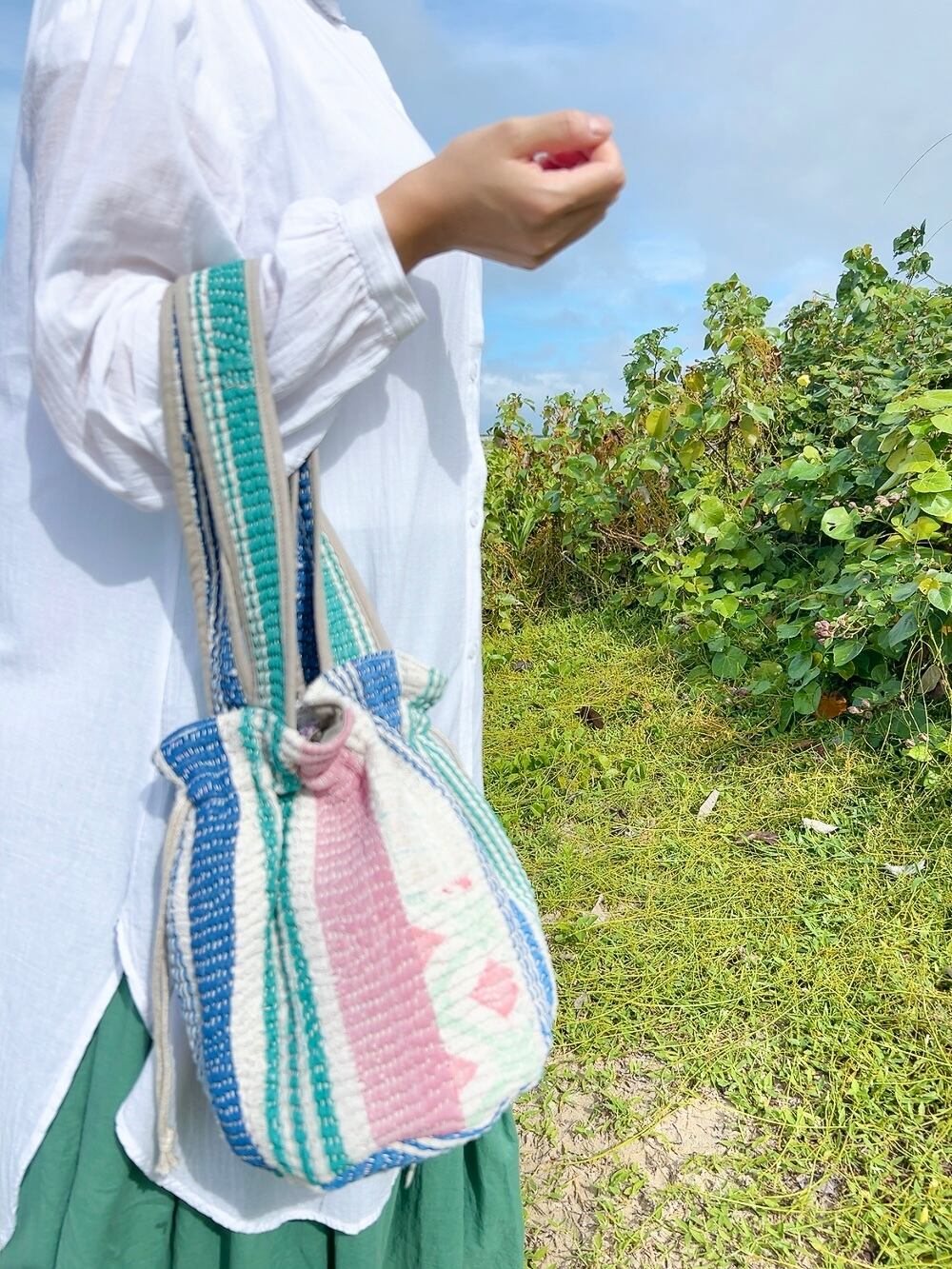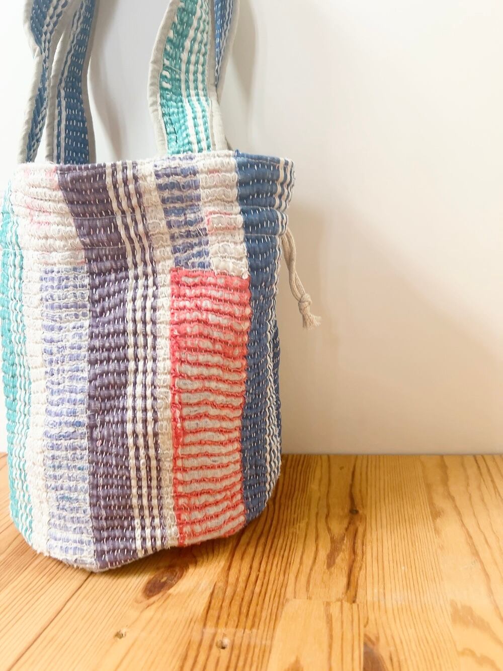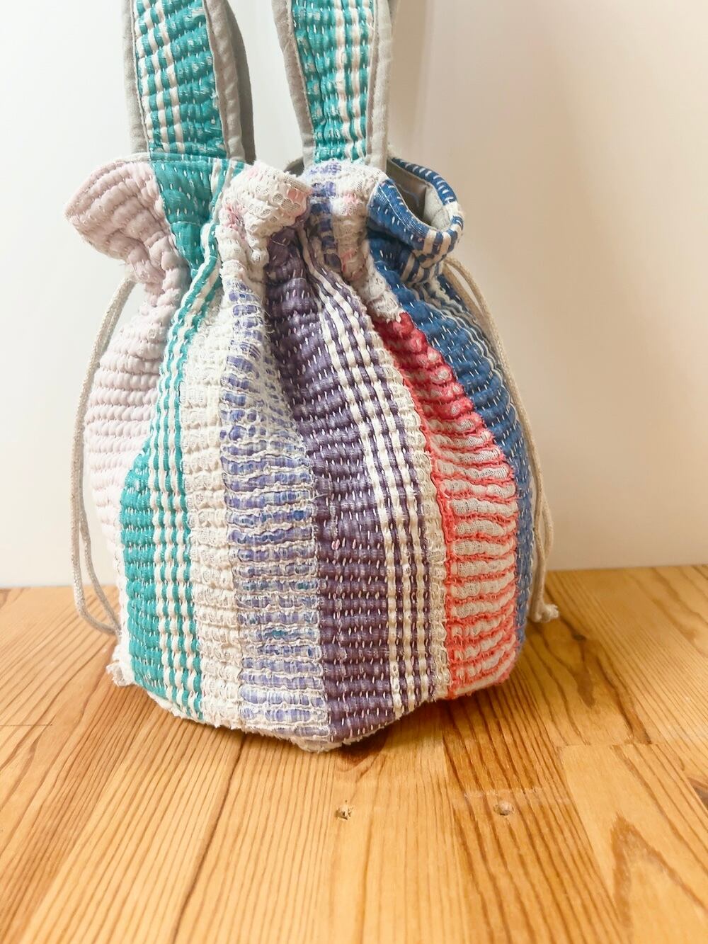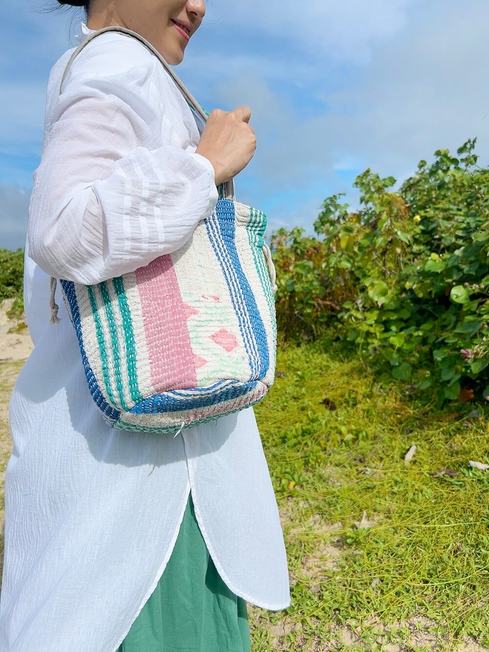 インドの伝統的な刺し子布「ラリーキルト」を贅沢に使用した、巾着型のトートバッグです。
