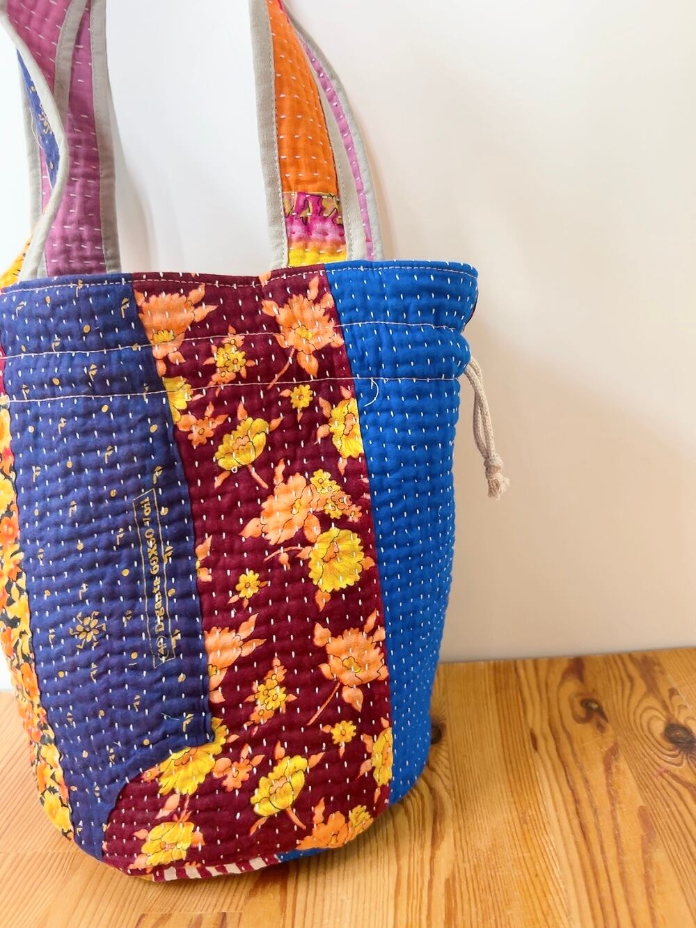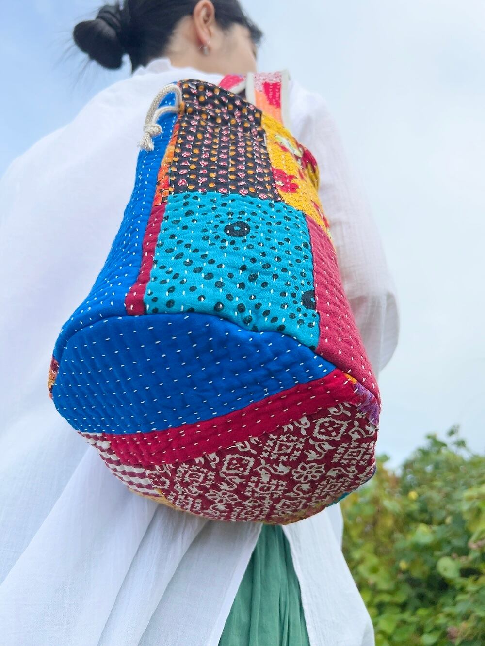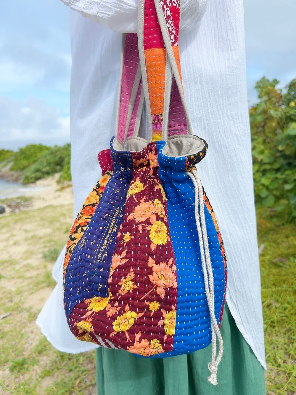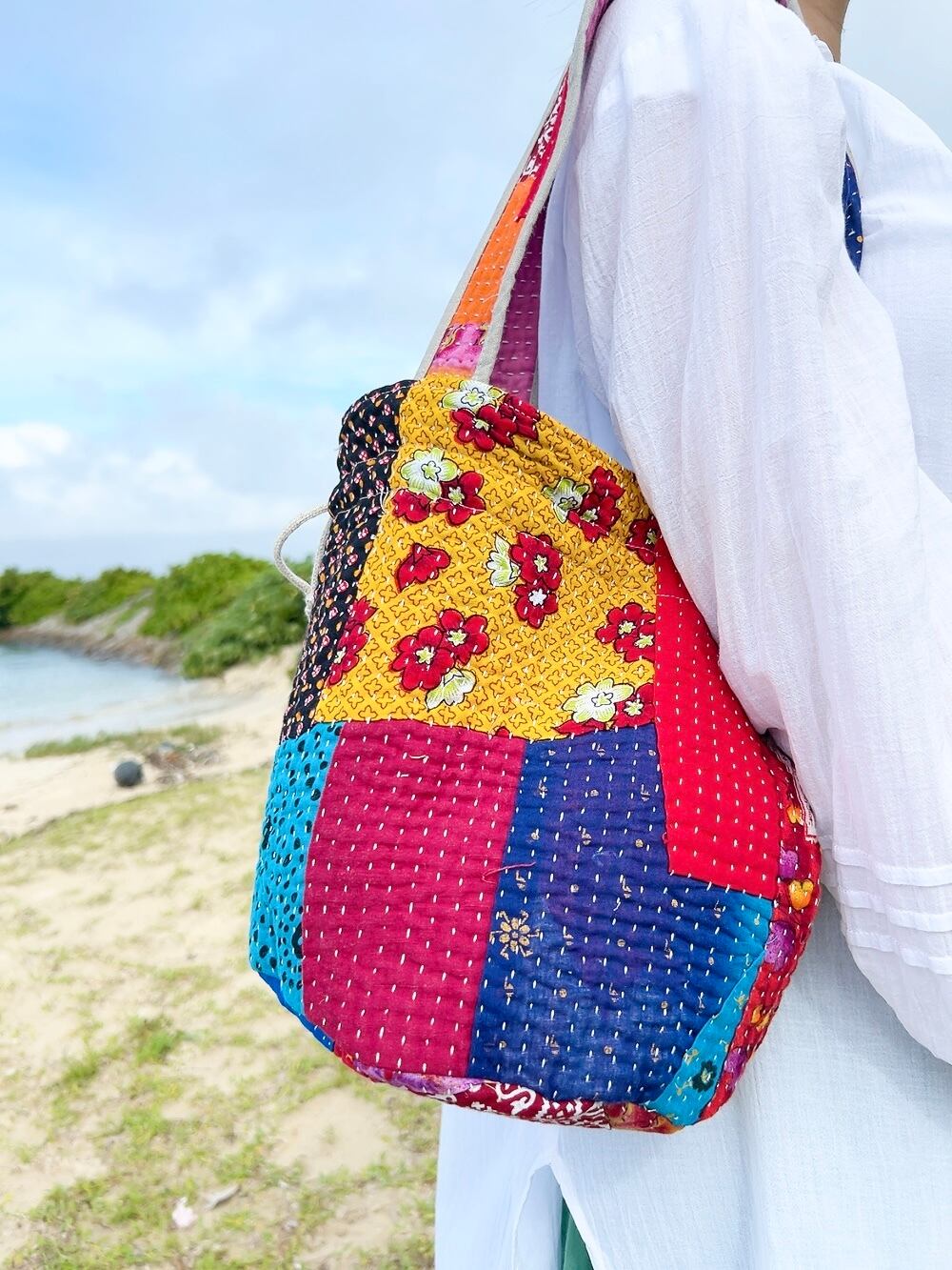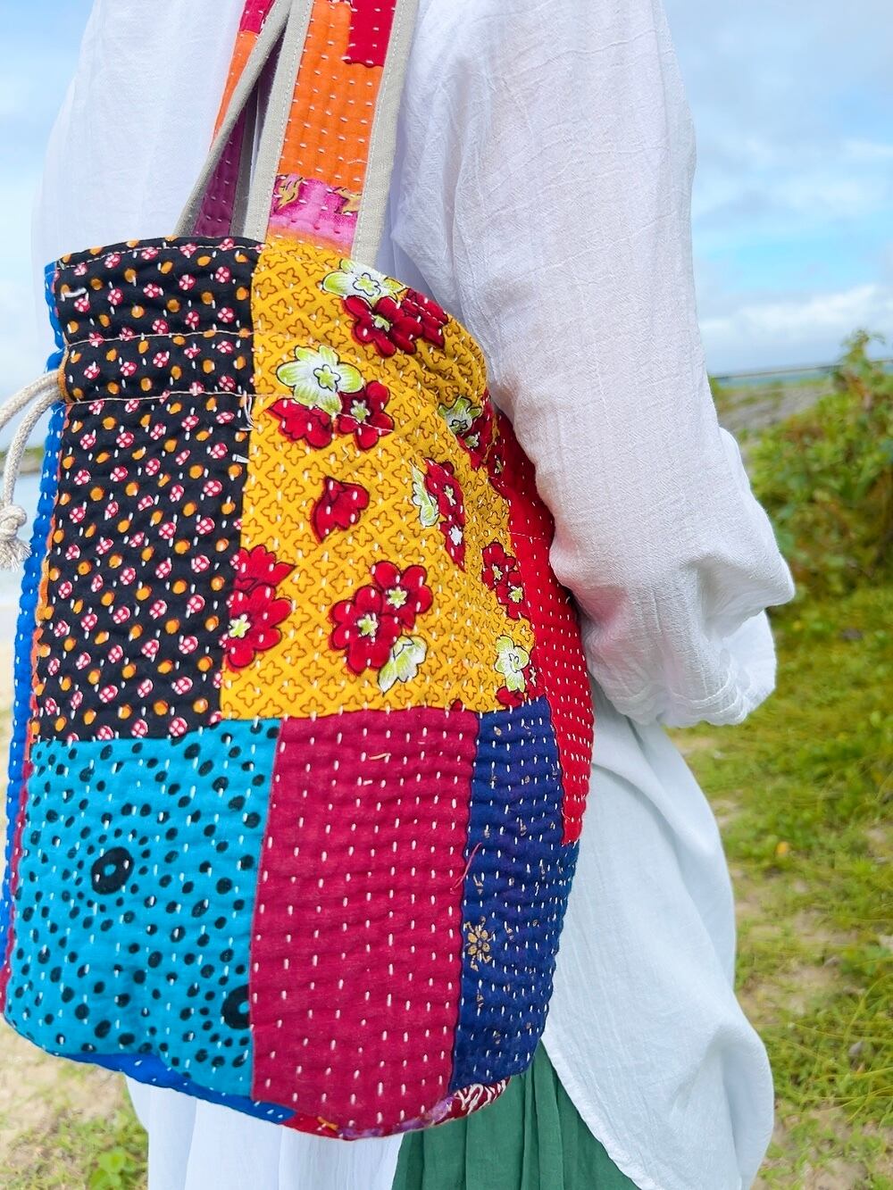 インドの伝統的な刺し子布「ラリーキルト」を贅沢に使用した、巾着型のトートバッグです。