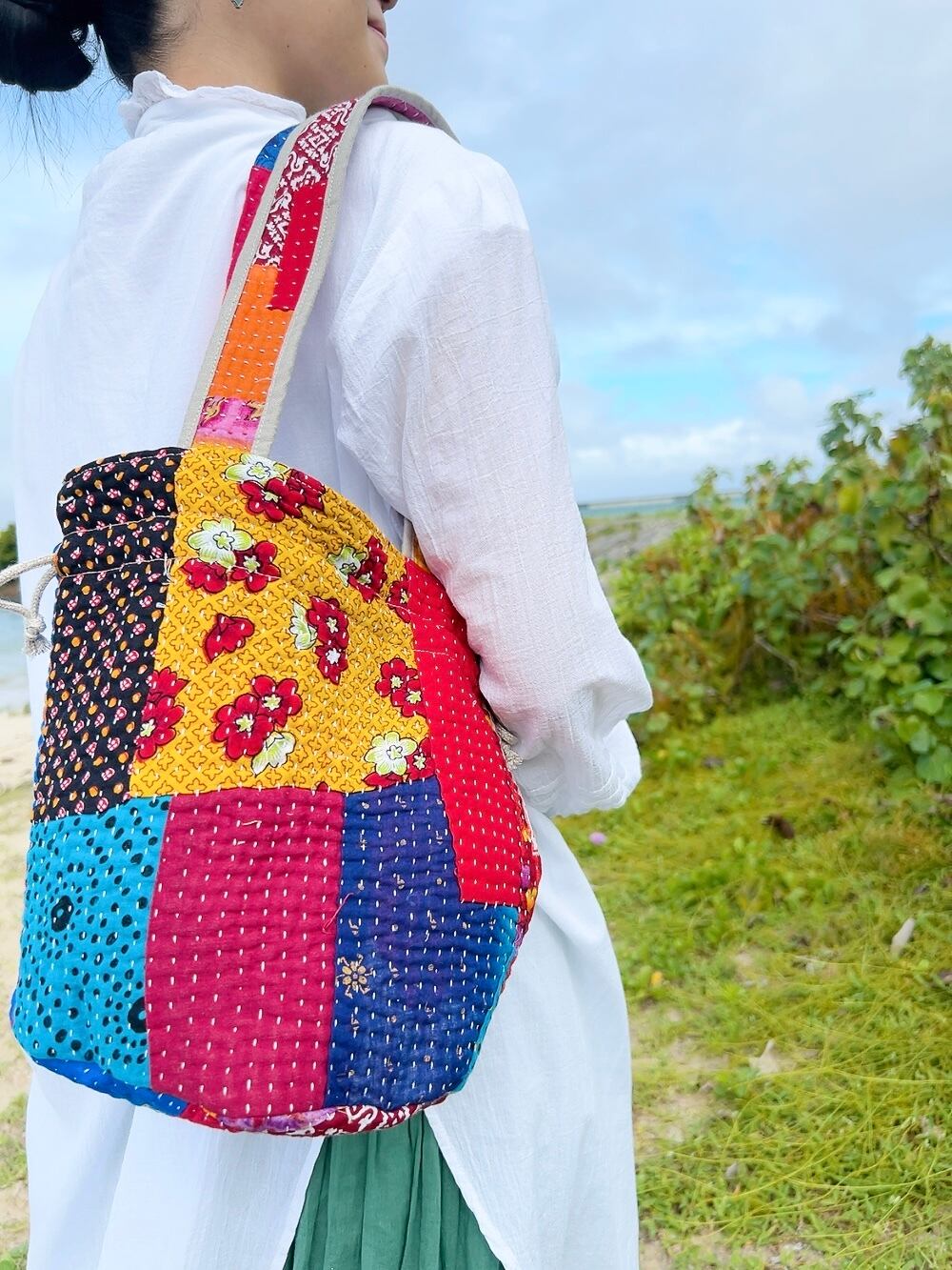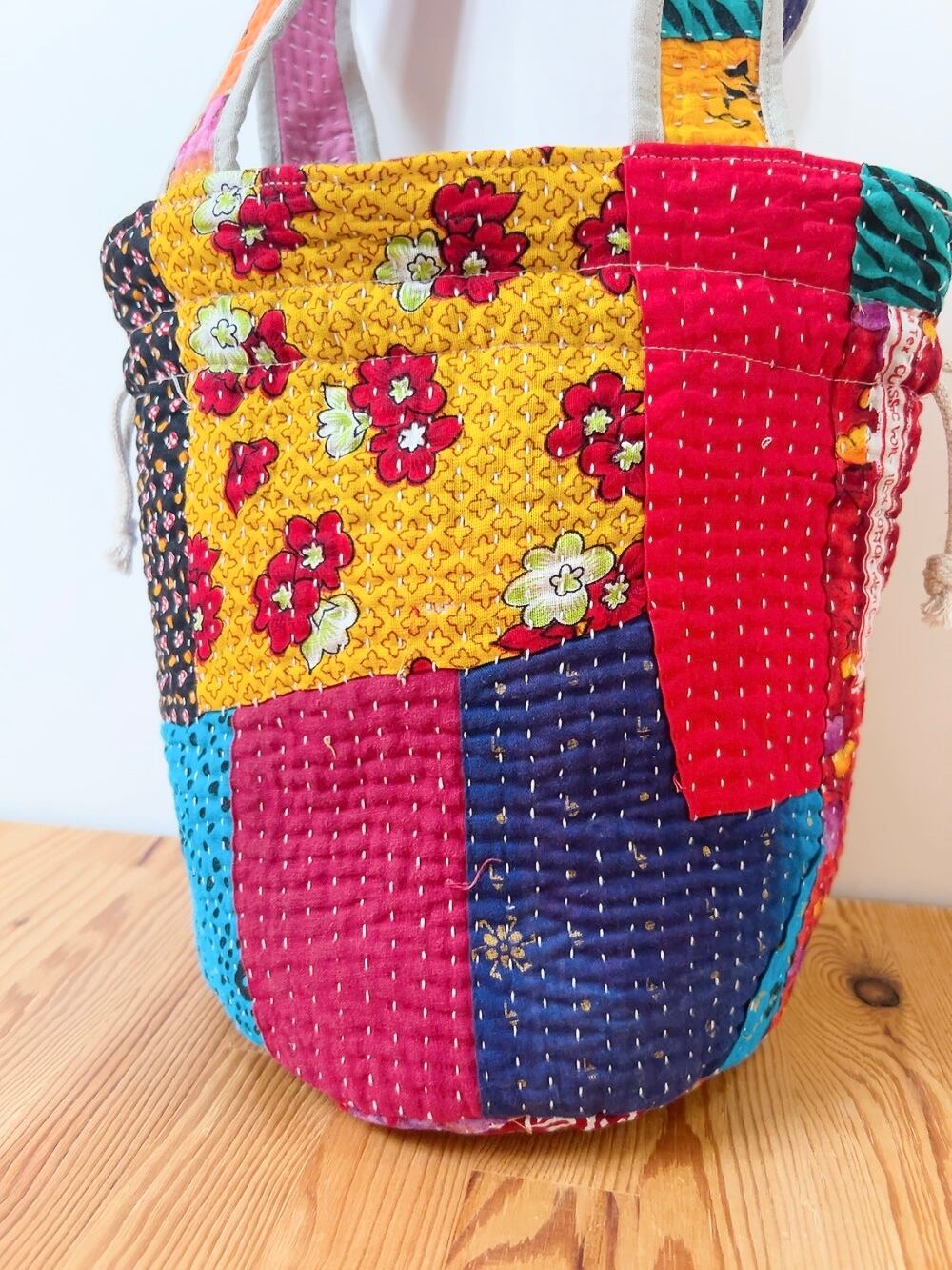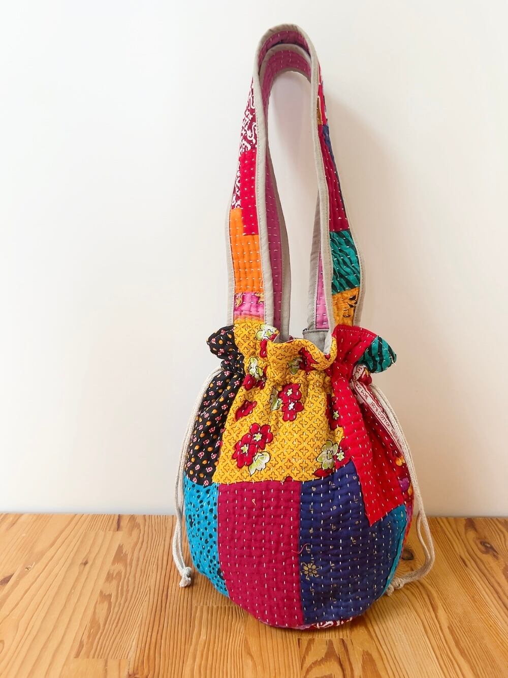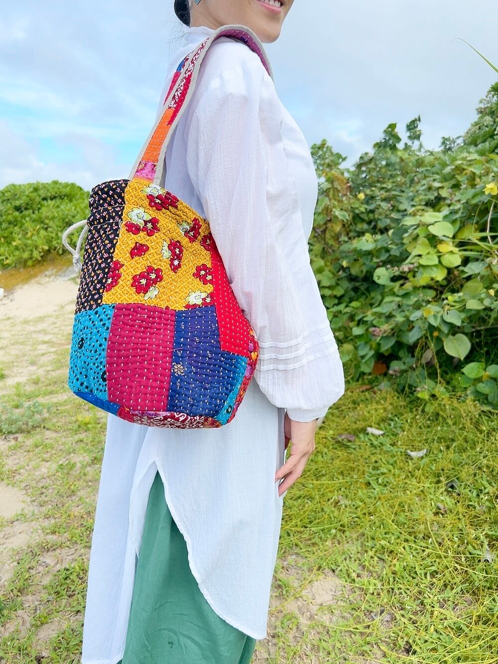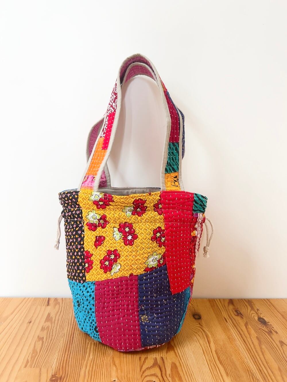 インドの伝統的な刺し子布「ラリーキルト」を贅沢に使用した、巾着型のトートバッグです。