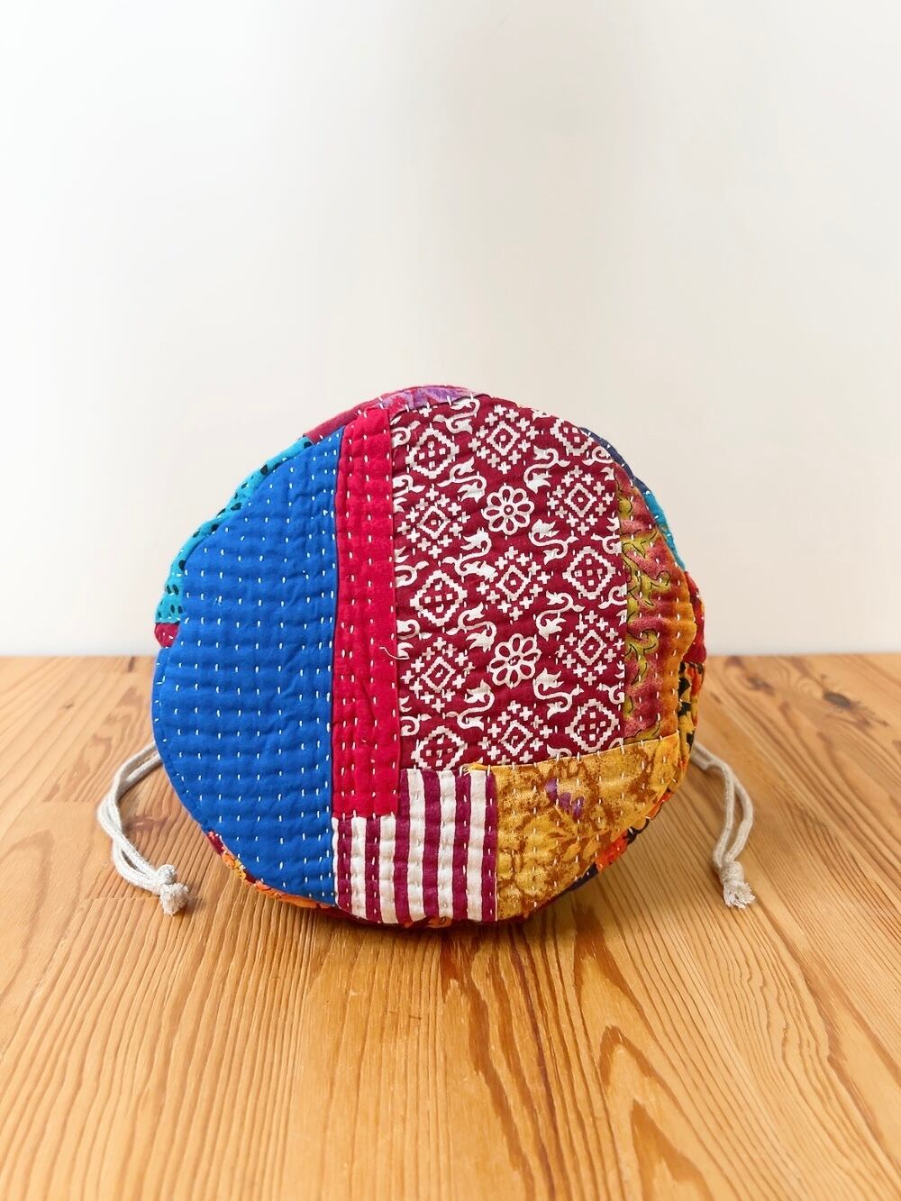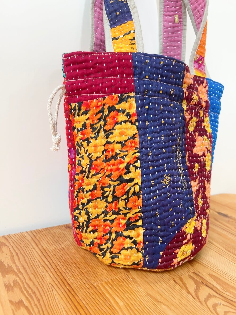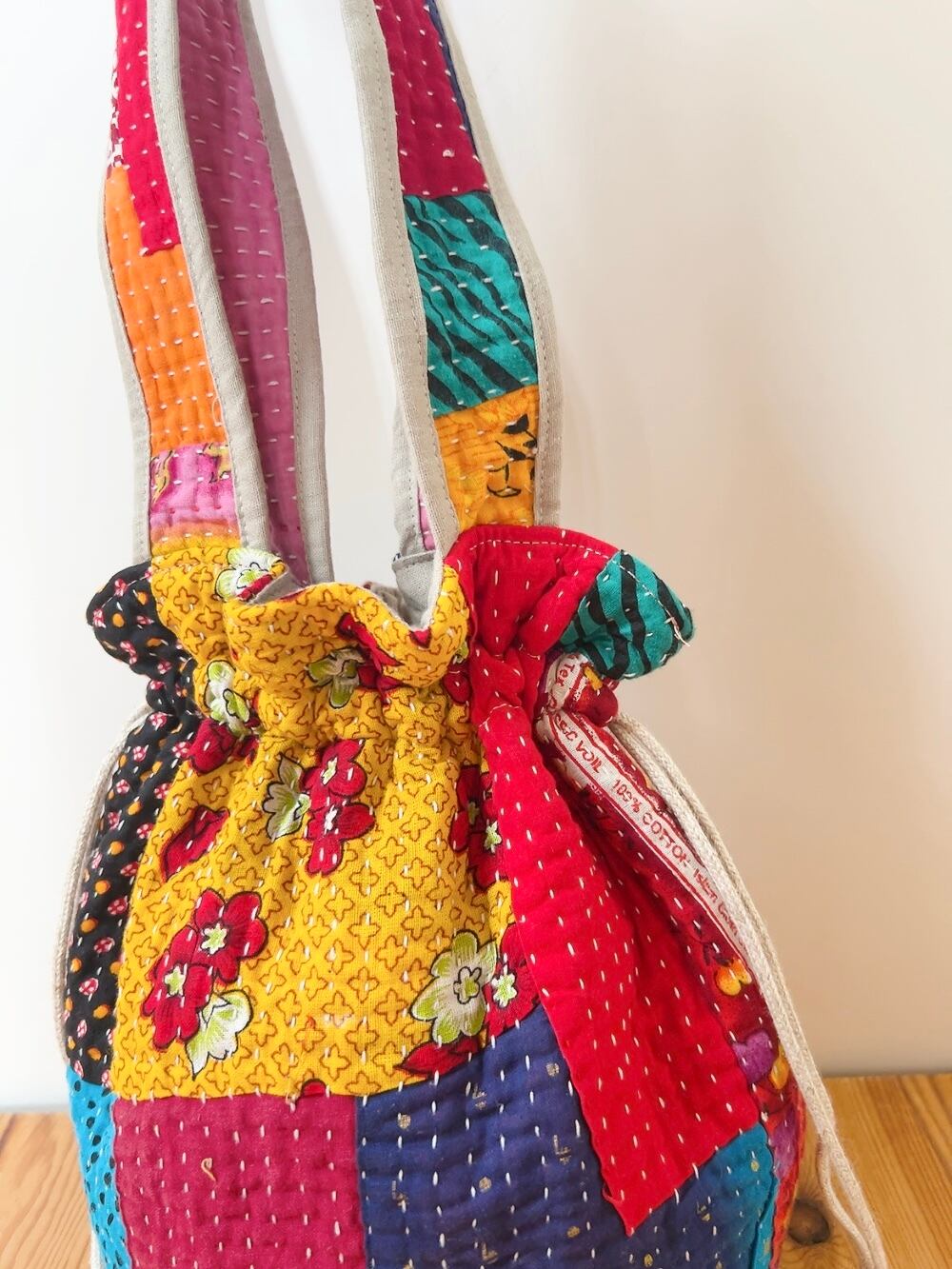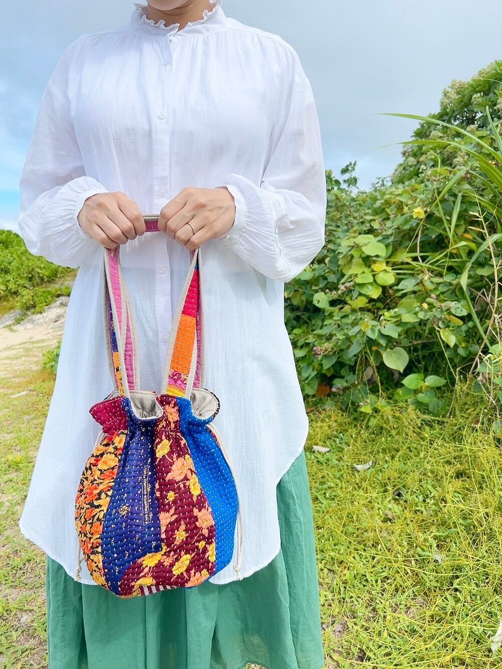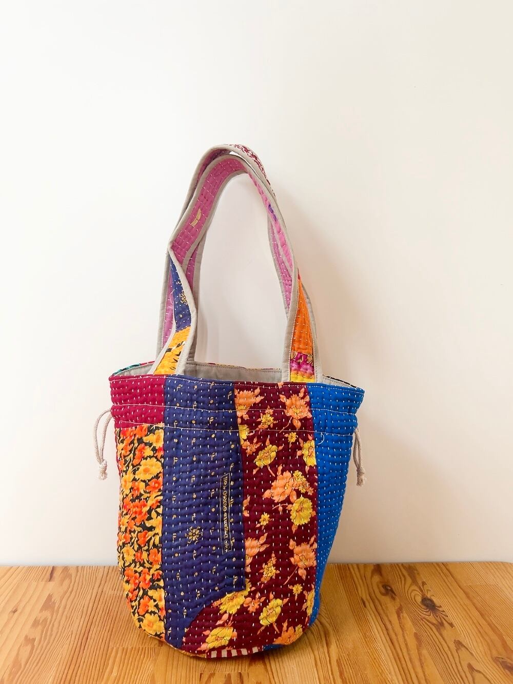 インドの伝統的な刺し子布「ラリーキルト」を贅沢に使用した、巾着型のトートバッグです。
