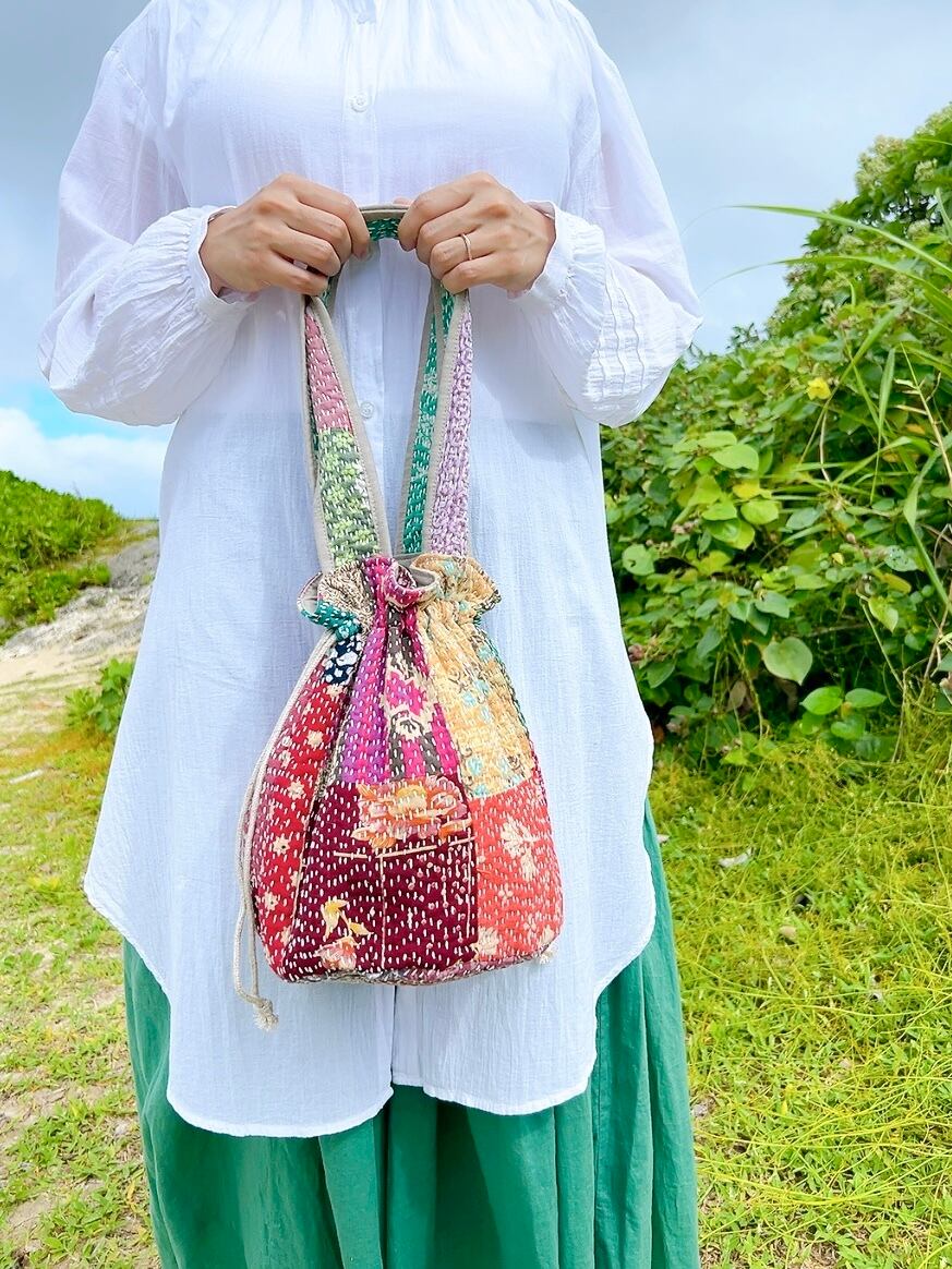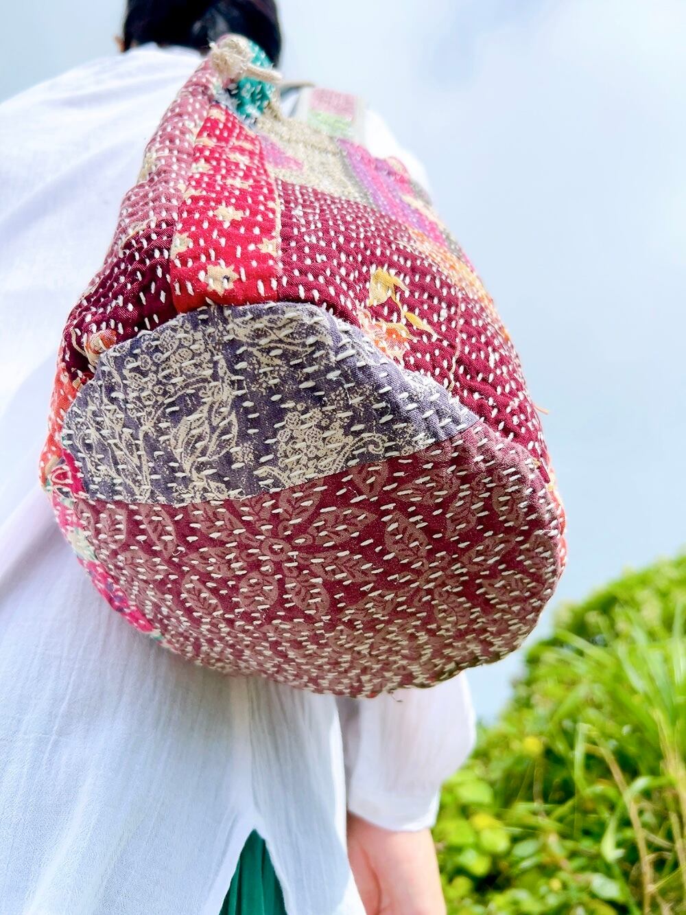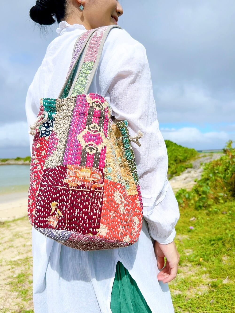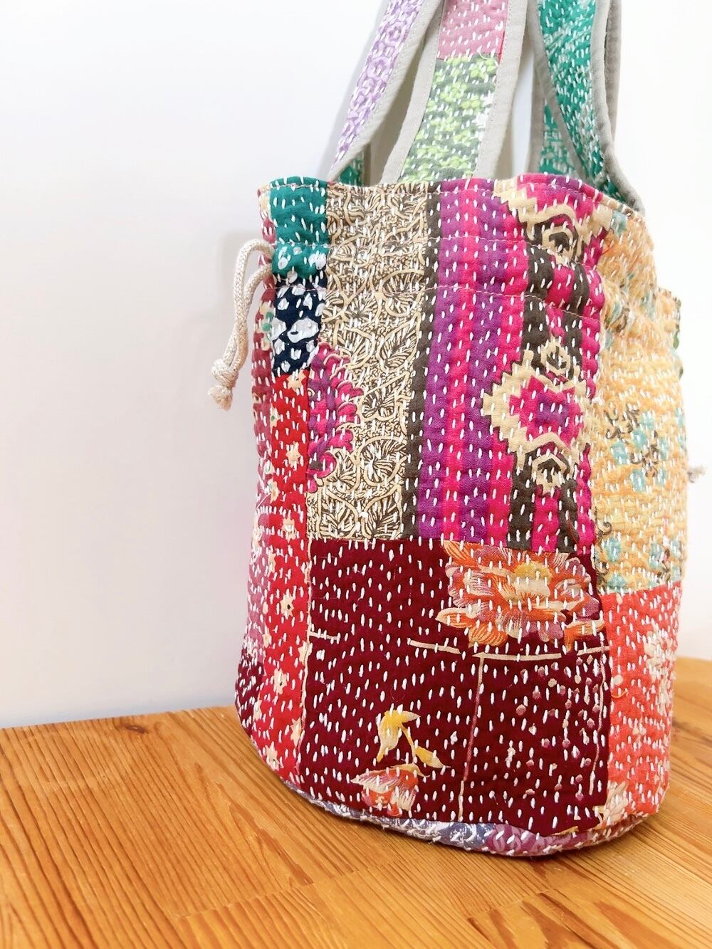 インドの伝統的な刺し子布「ラリーキルト」を贅沢に使用した、巾着型のトートバッグです。