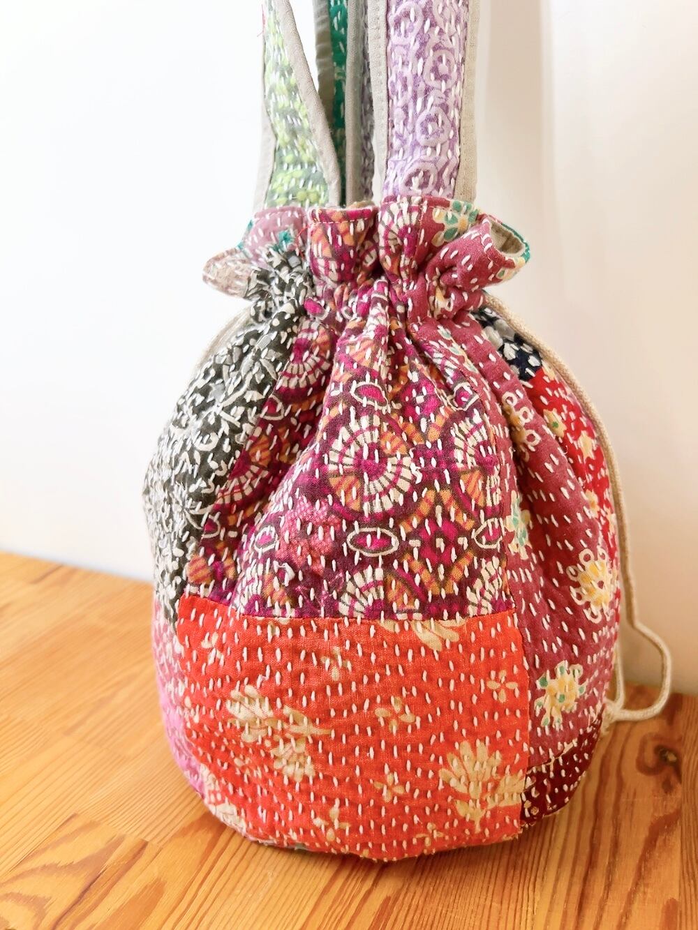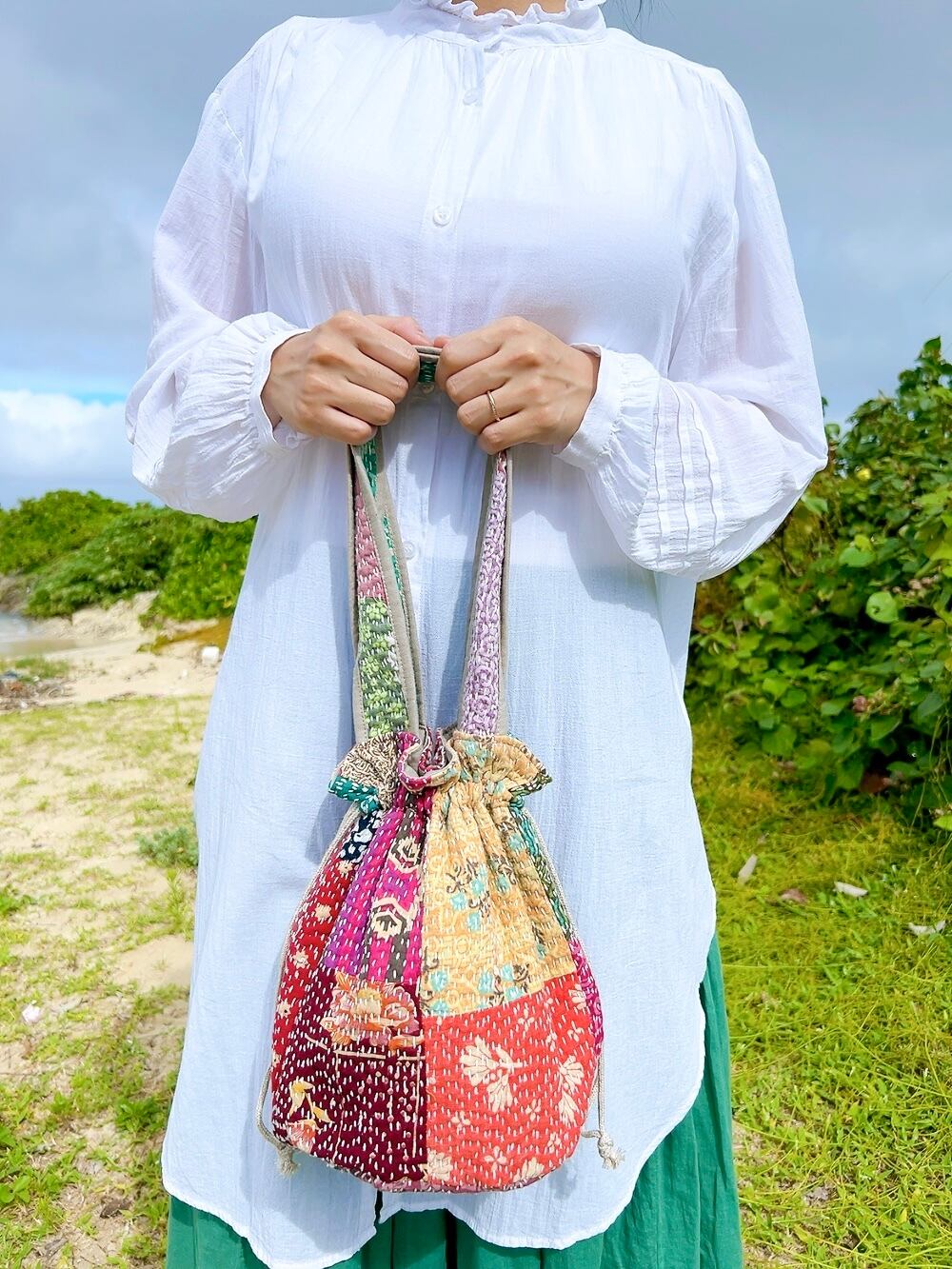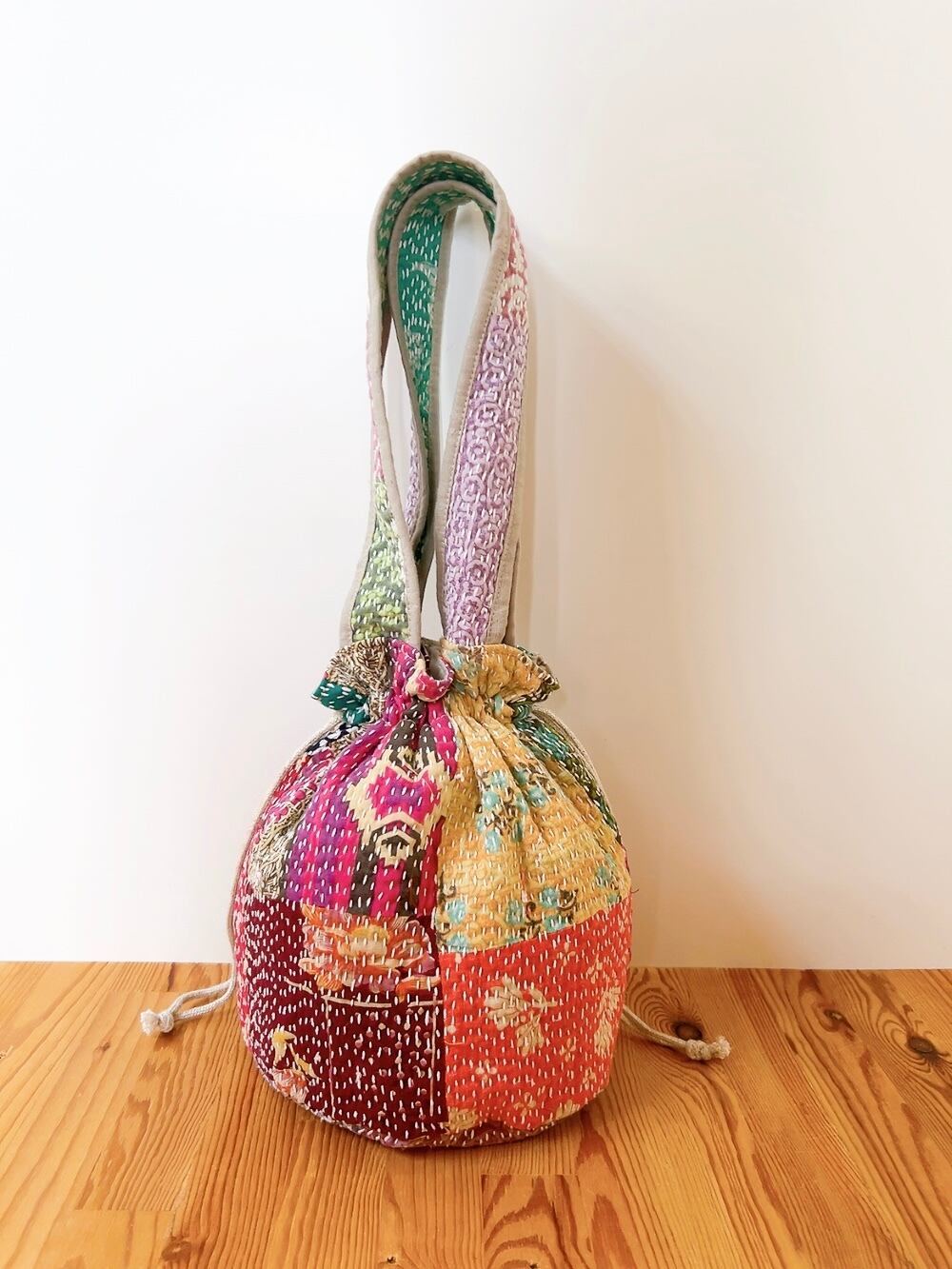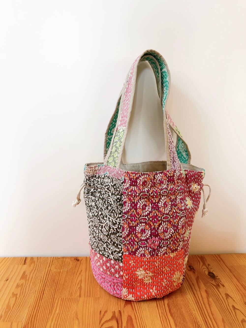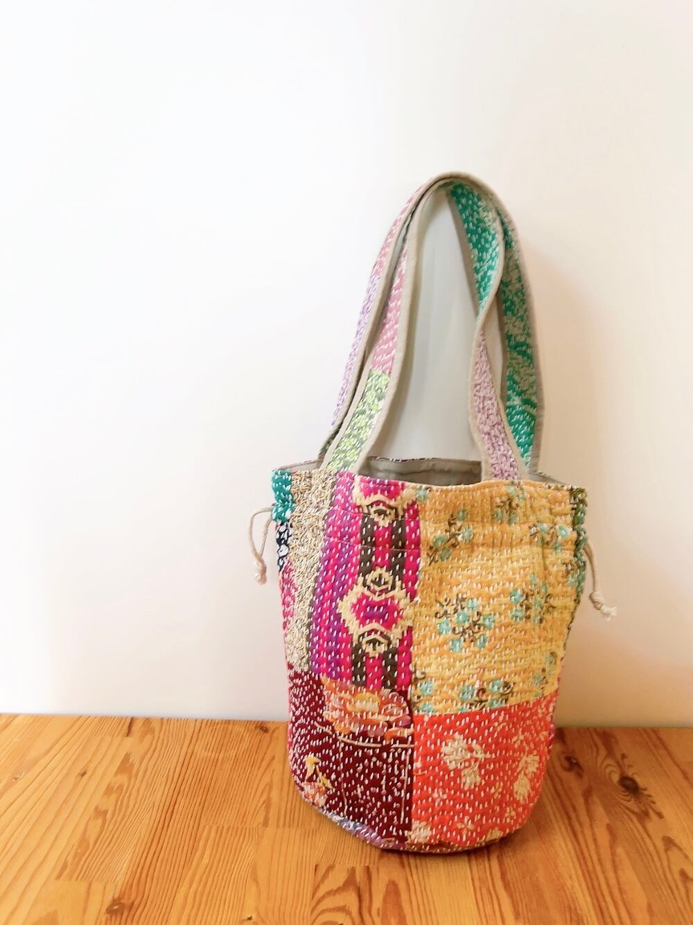 インドの伝統的な刺し子布「ラリーキルト」を贅沢に使用した、巾着型のトートバッグです。