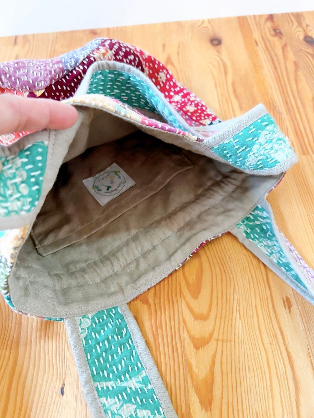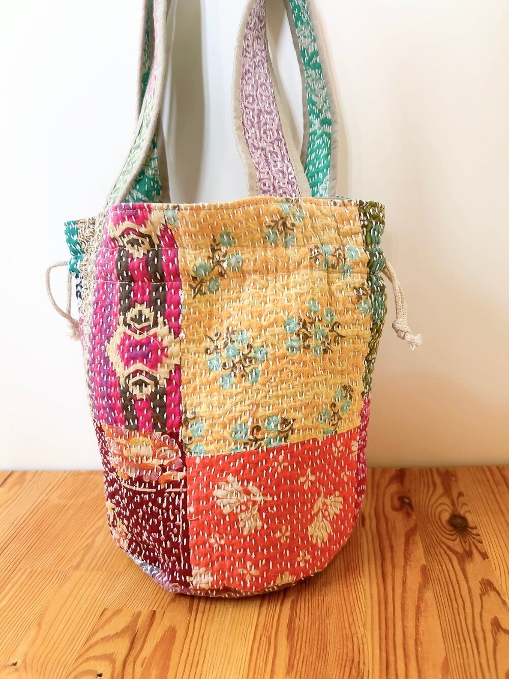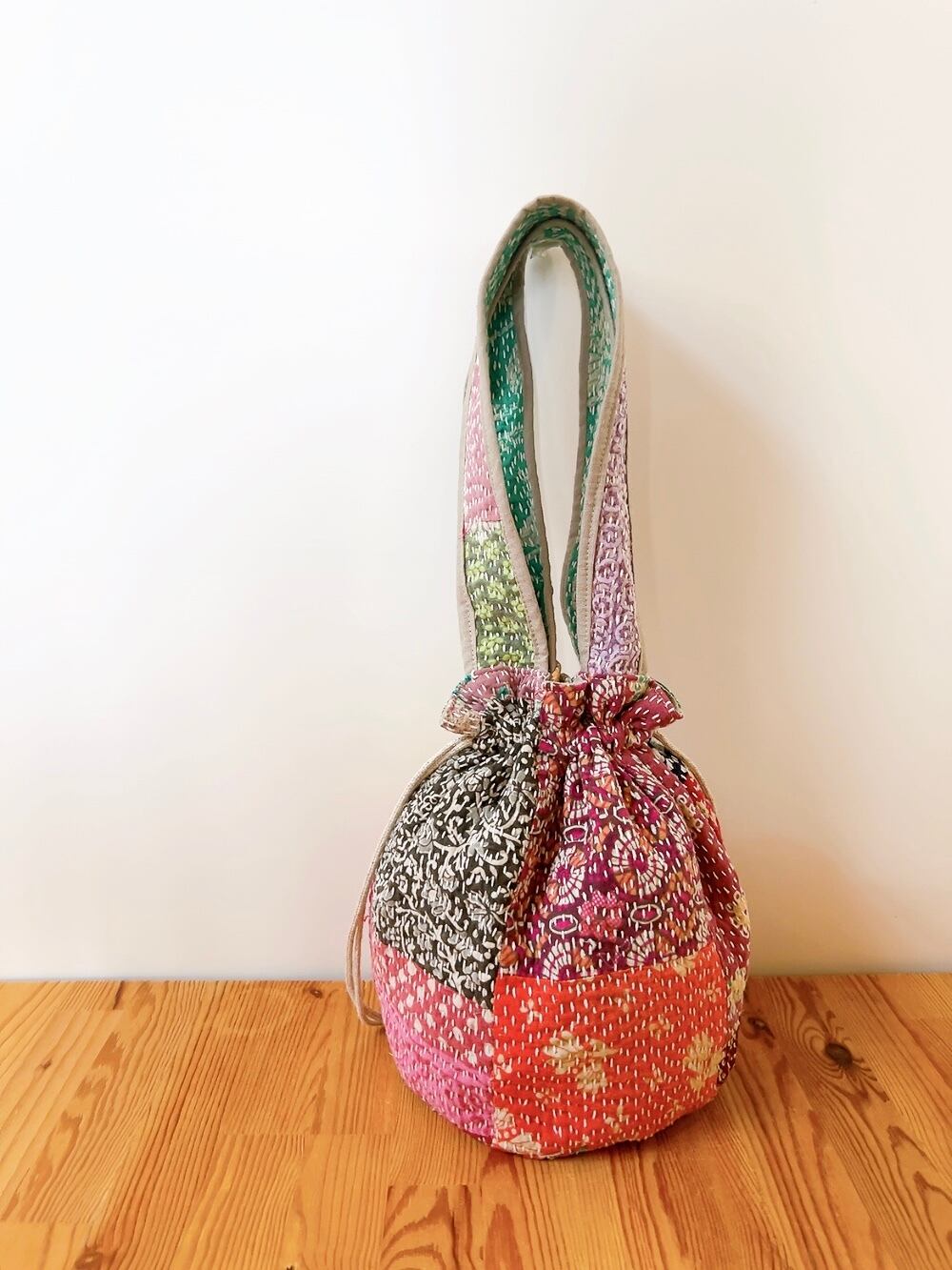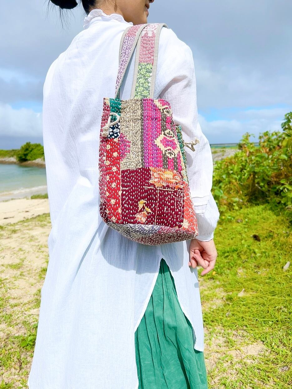 インドの伝統的な刺し子布「ラリーキルト」を贅沢に使用した、巾着型のトートバッグです。