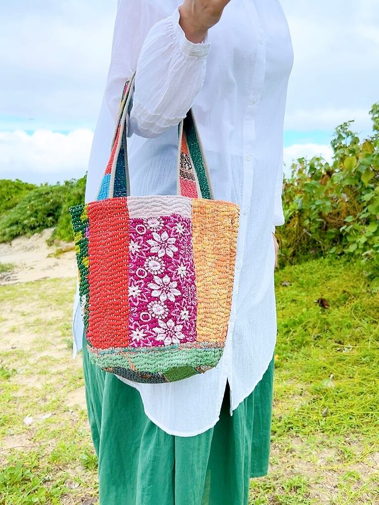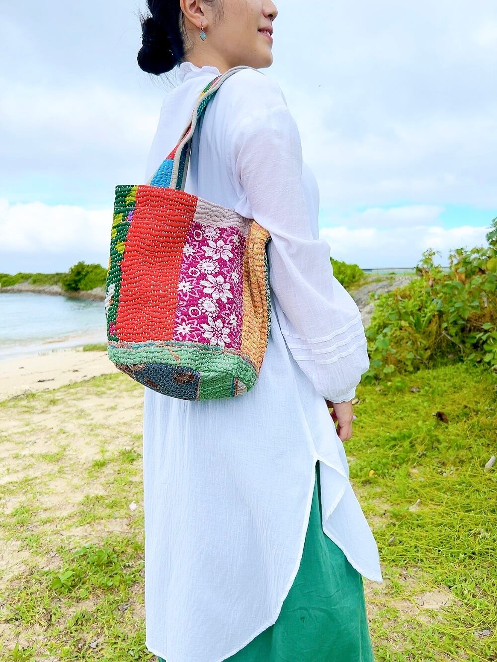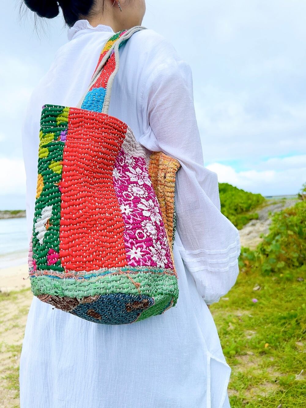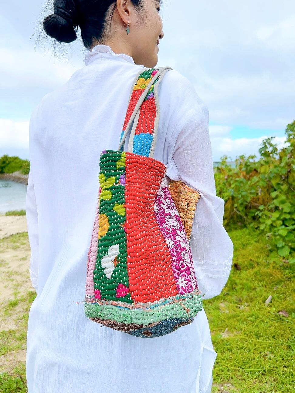 インドの伝統的な刺し子布「ラリーキルト」を贅沢に使用した、巾着型のトートバッグです。