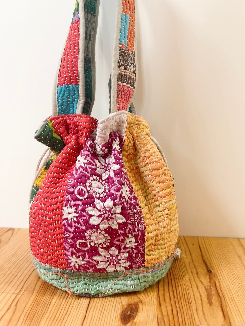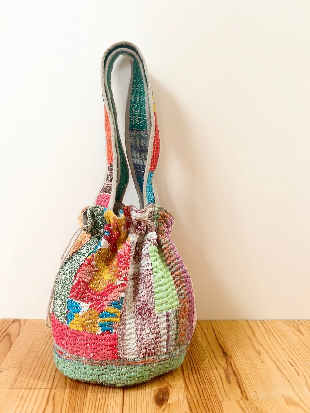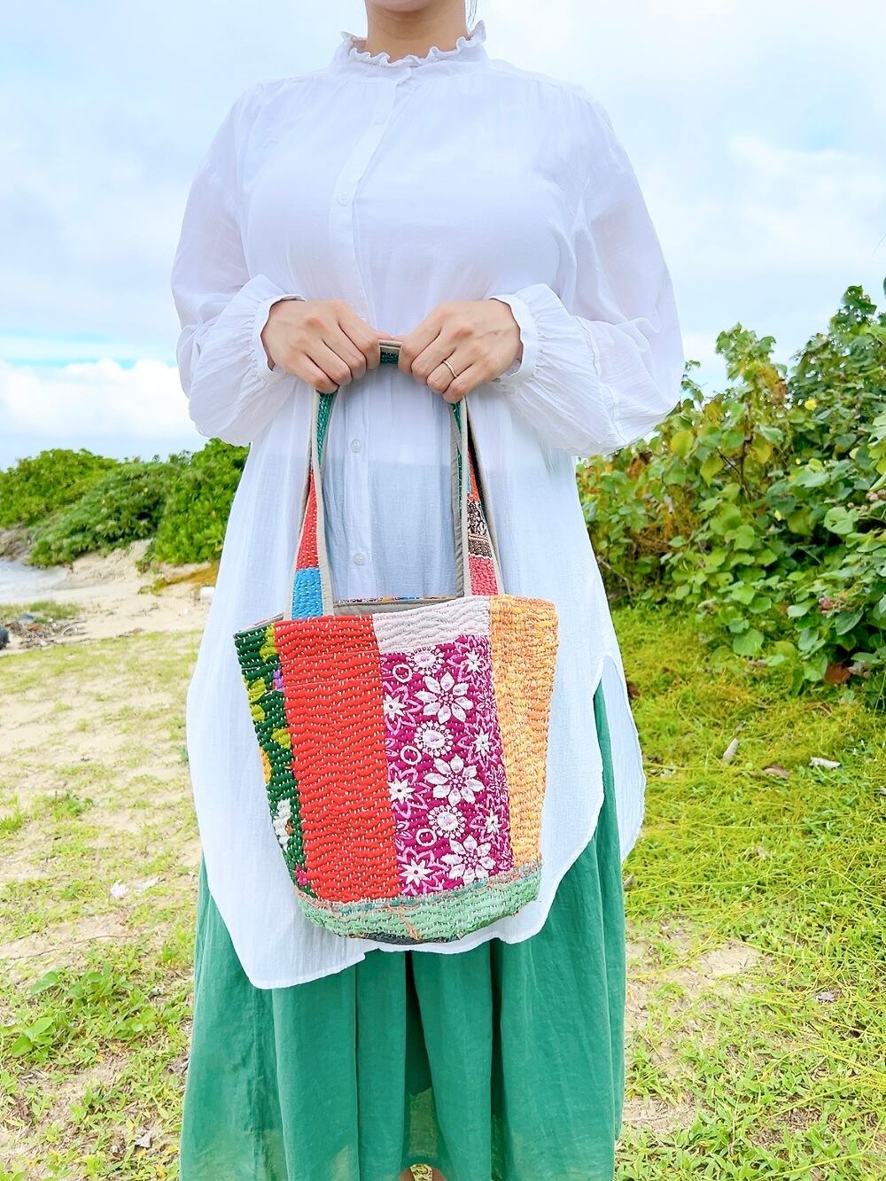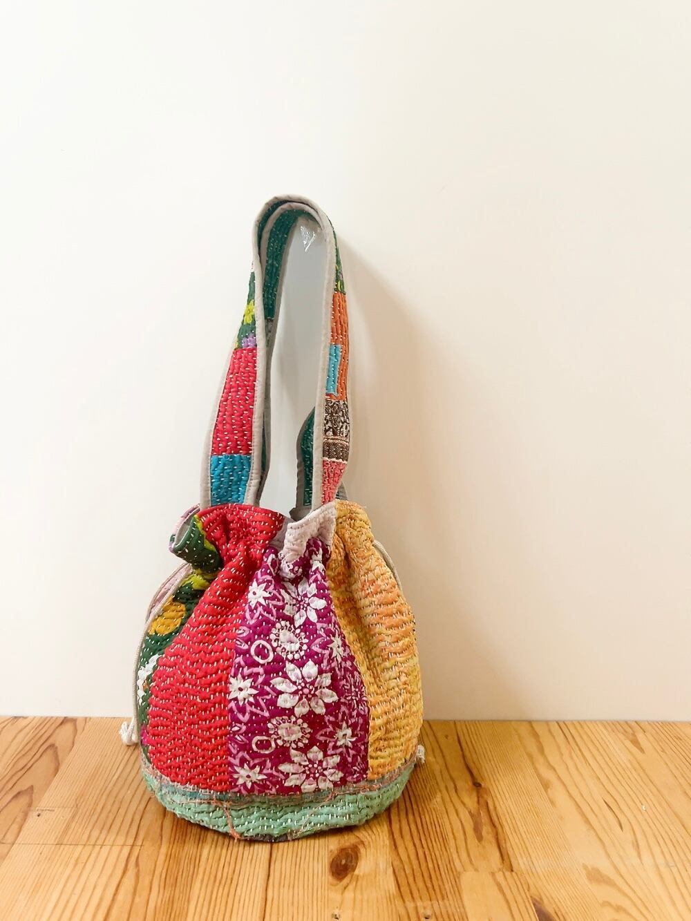 インドの伝統的な刺し子布「ラリーキルト」を贅沢に使用した、巾着型のトートバッグです。