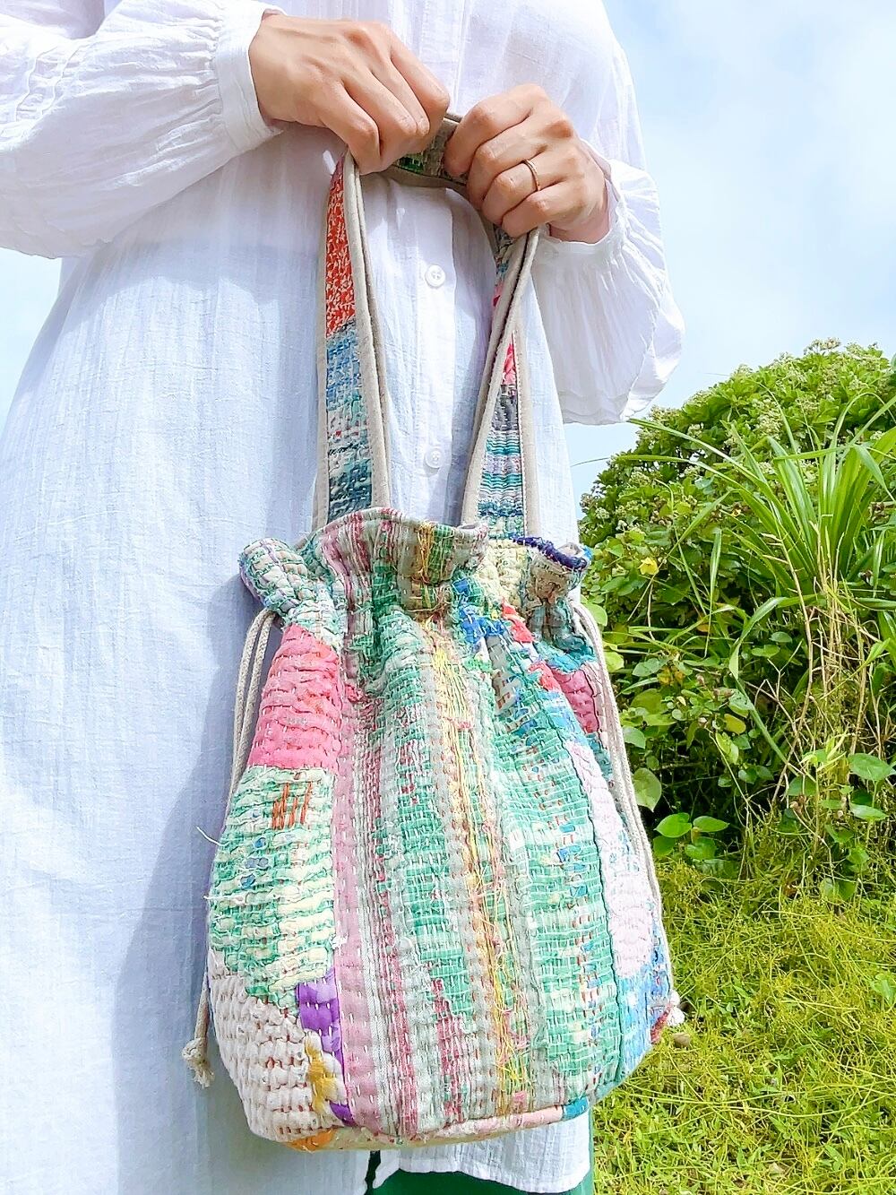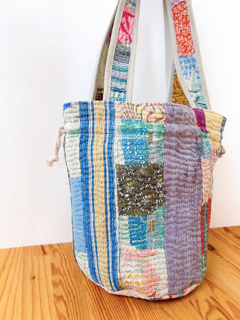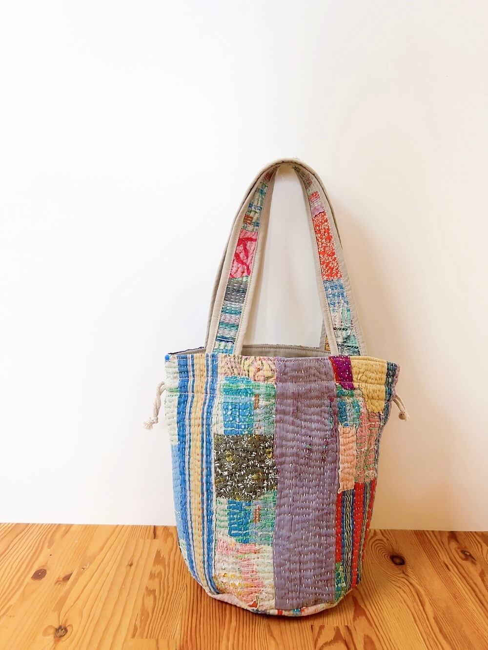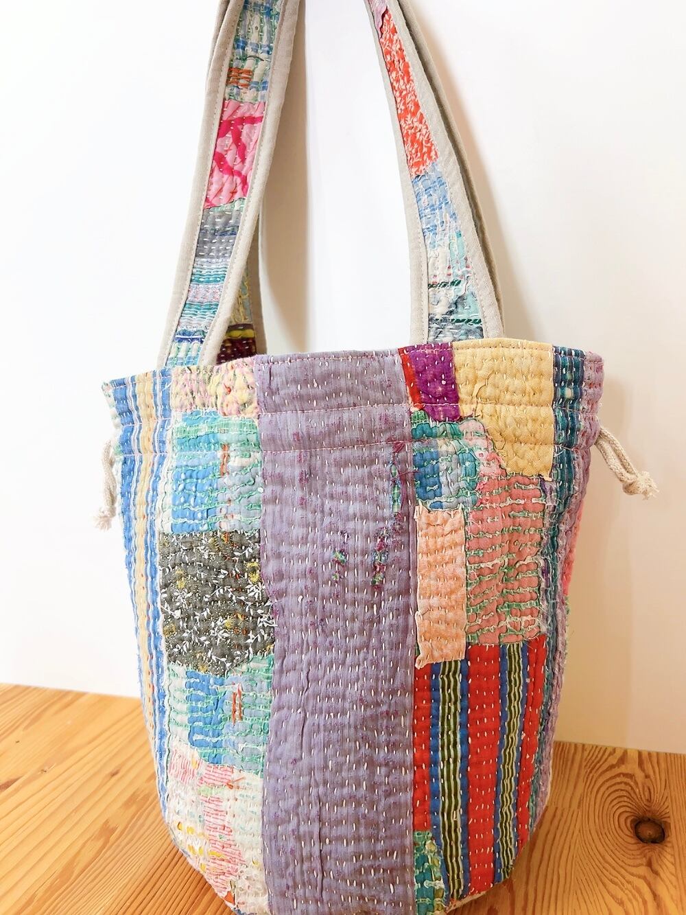 インドの伝統的な刺し子布「ラリーキルト」を贅沢に使用した、巾着型のトートバッグです。