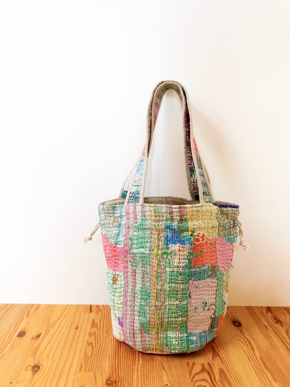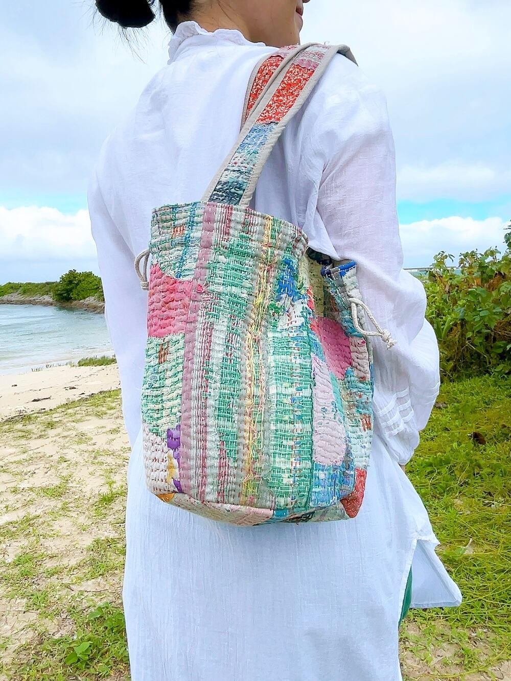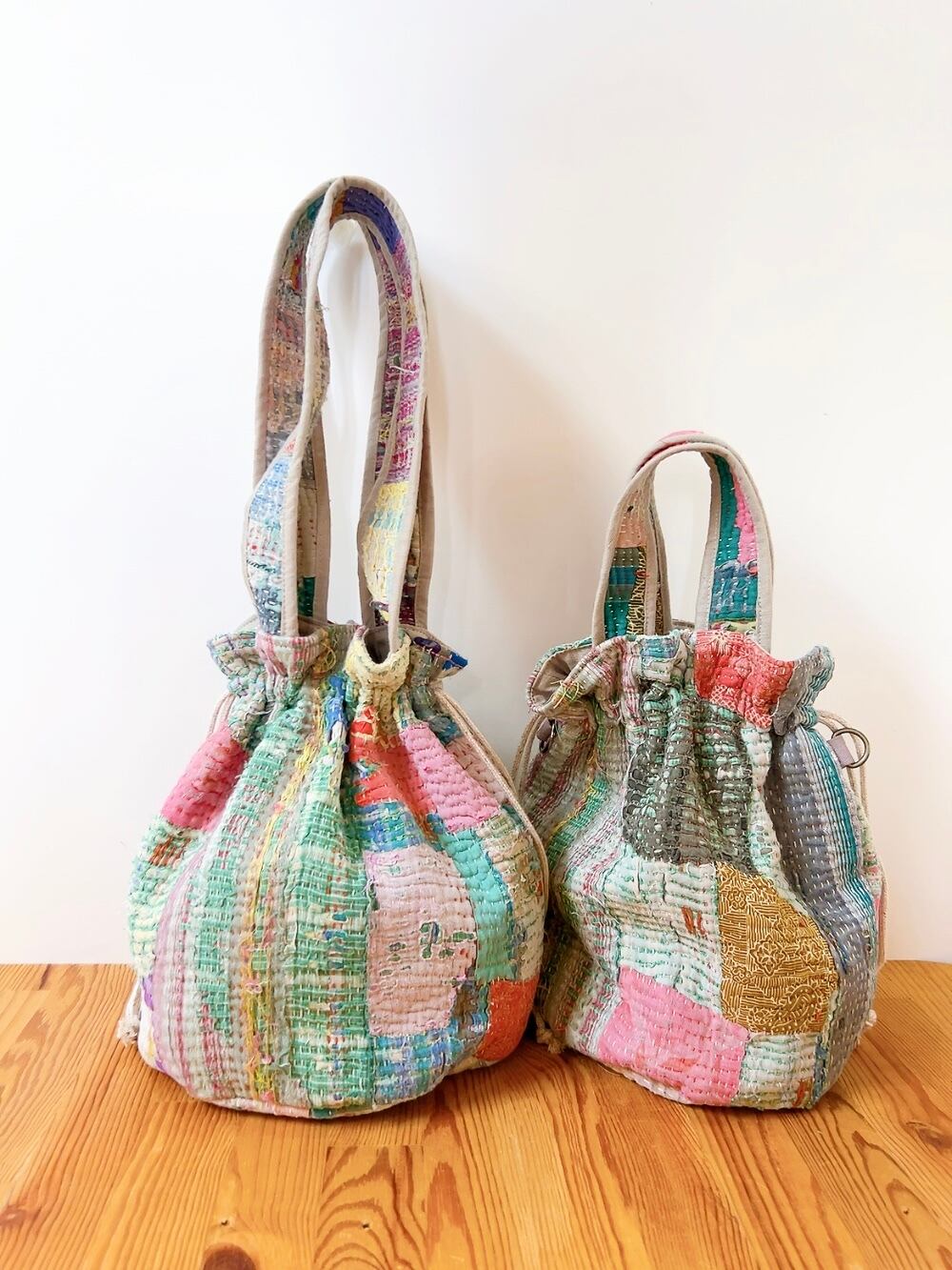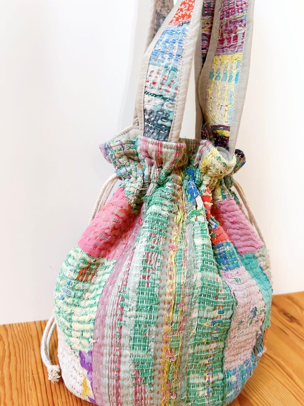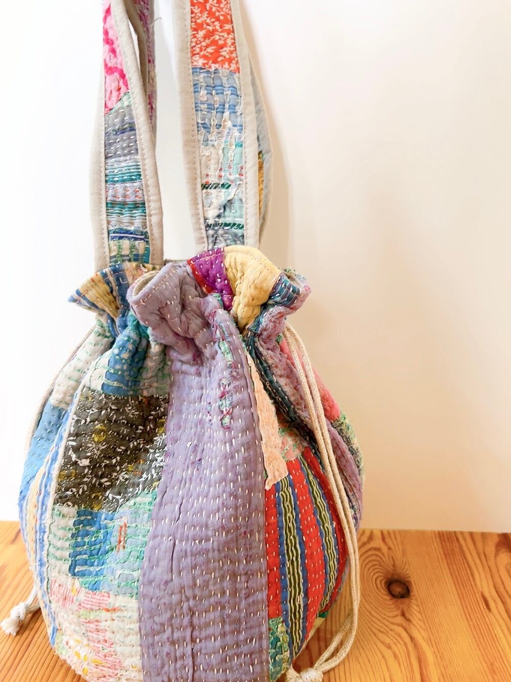インドの伝統的な刺し子布「ラリーキルト」を贅沢に使用した、巾着型のトートバッグです。