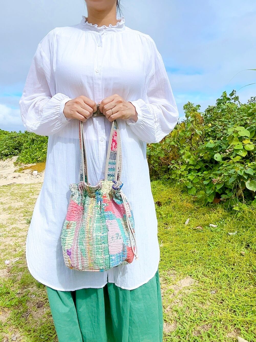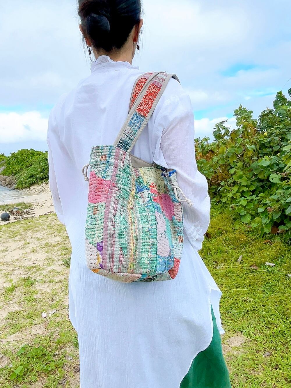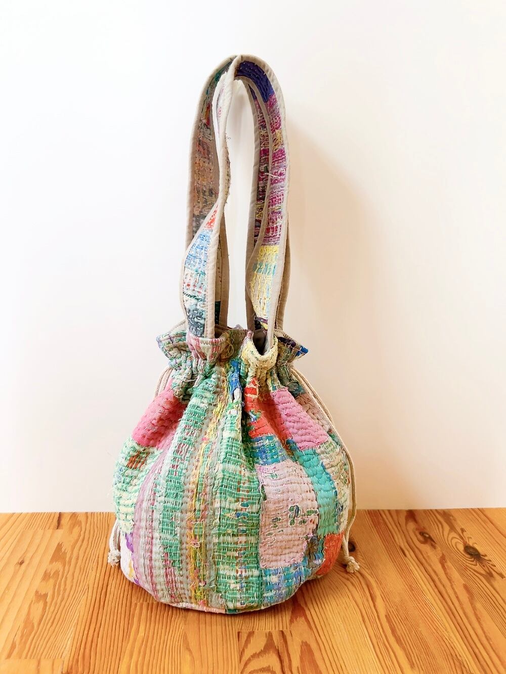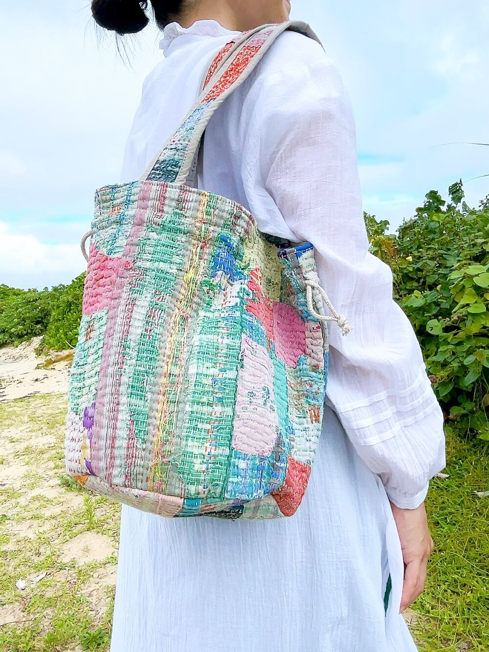 インドの伝統的な刺し子布「ラリーキルト」を贅沢に使用した、巾着型のトートバッグです。
