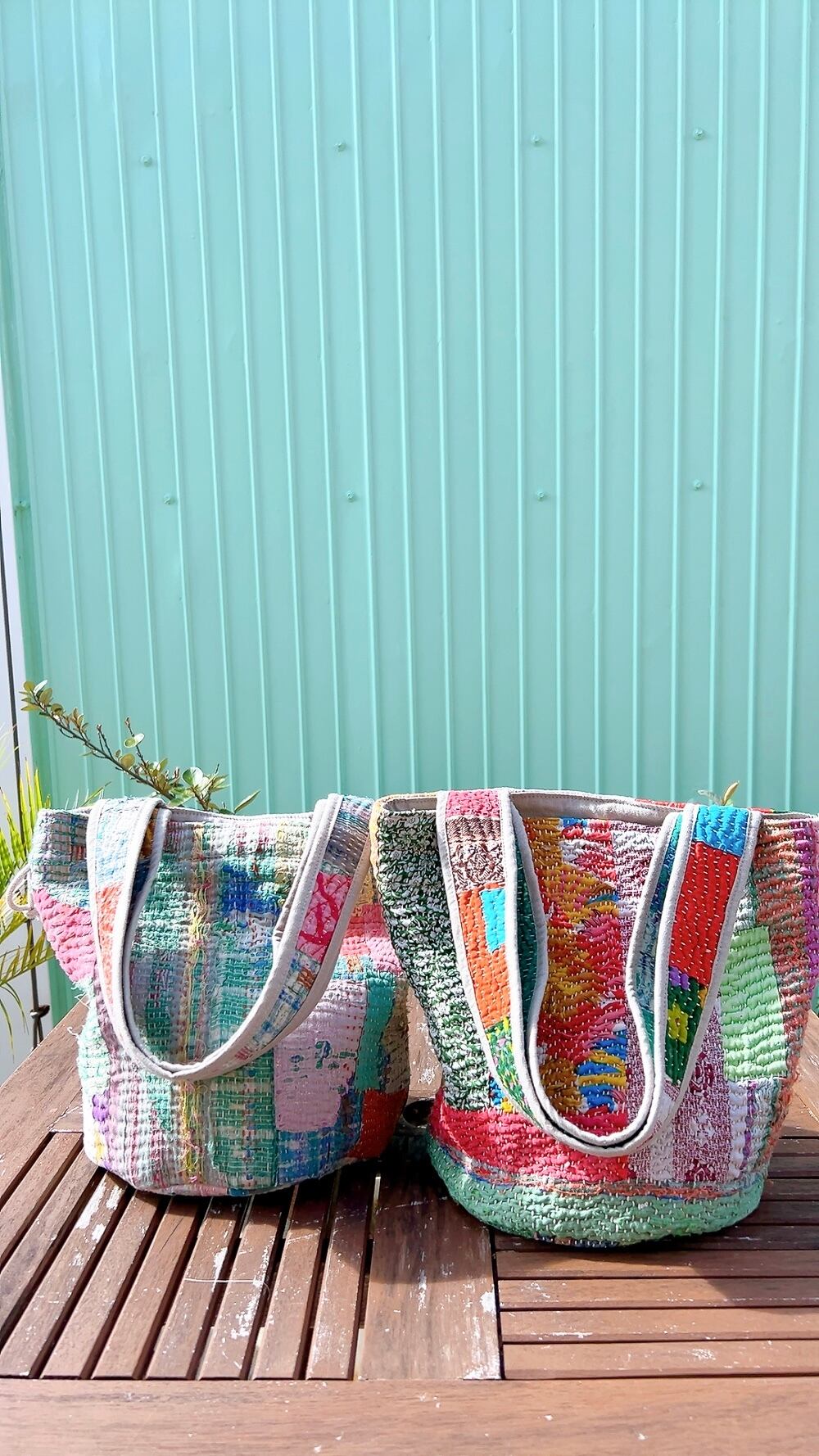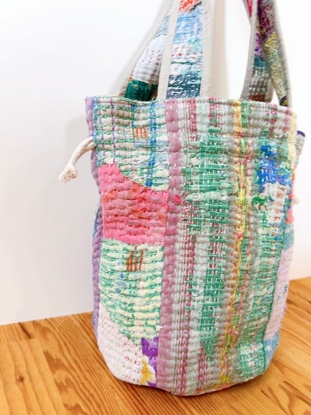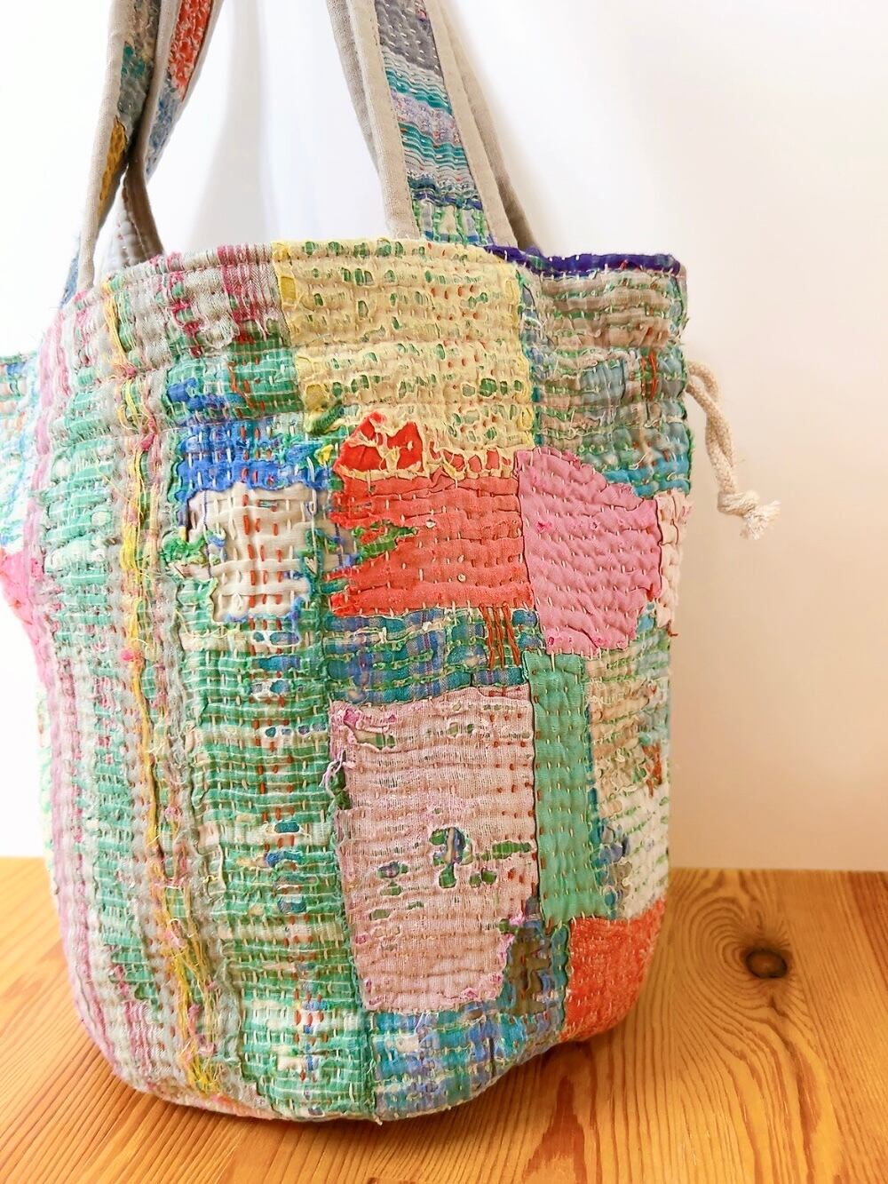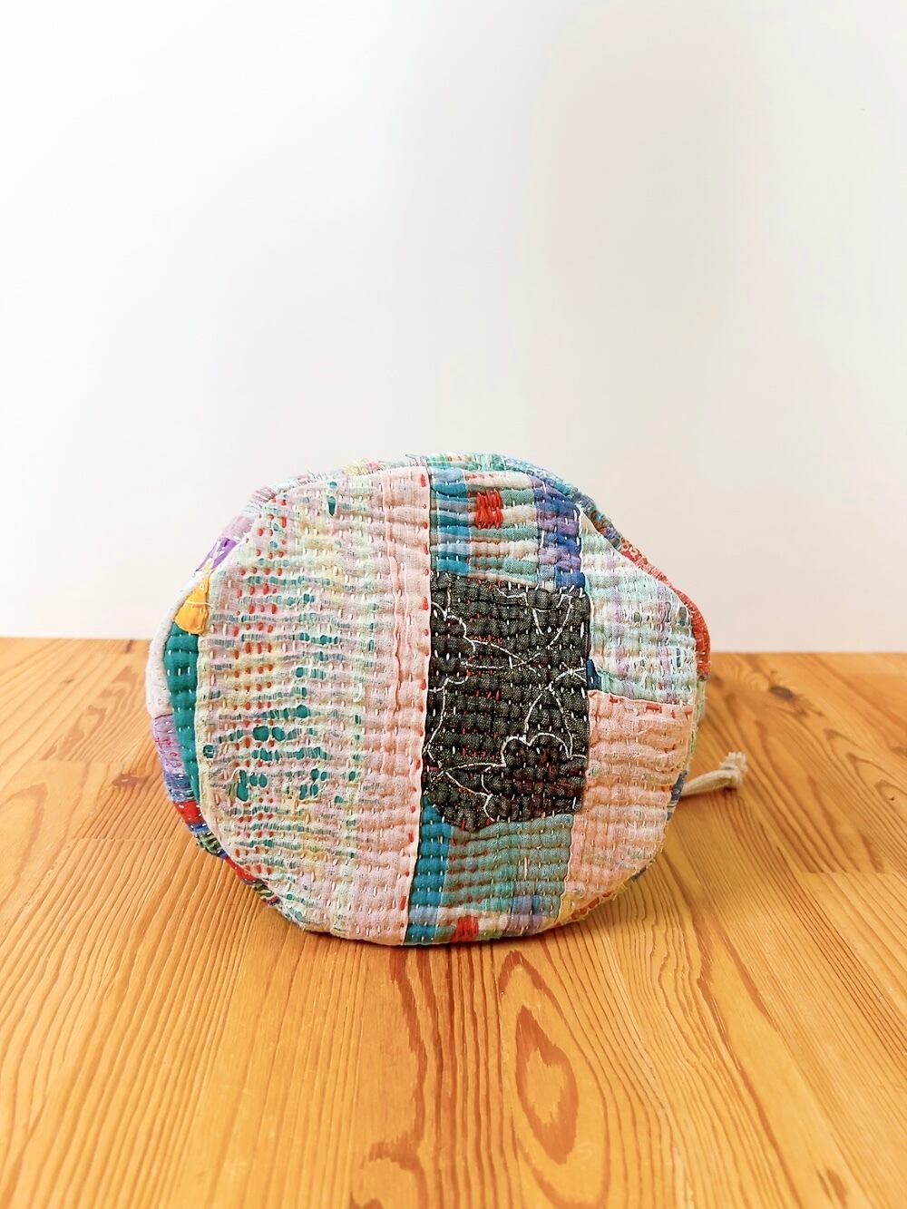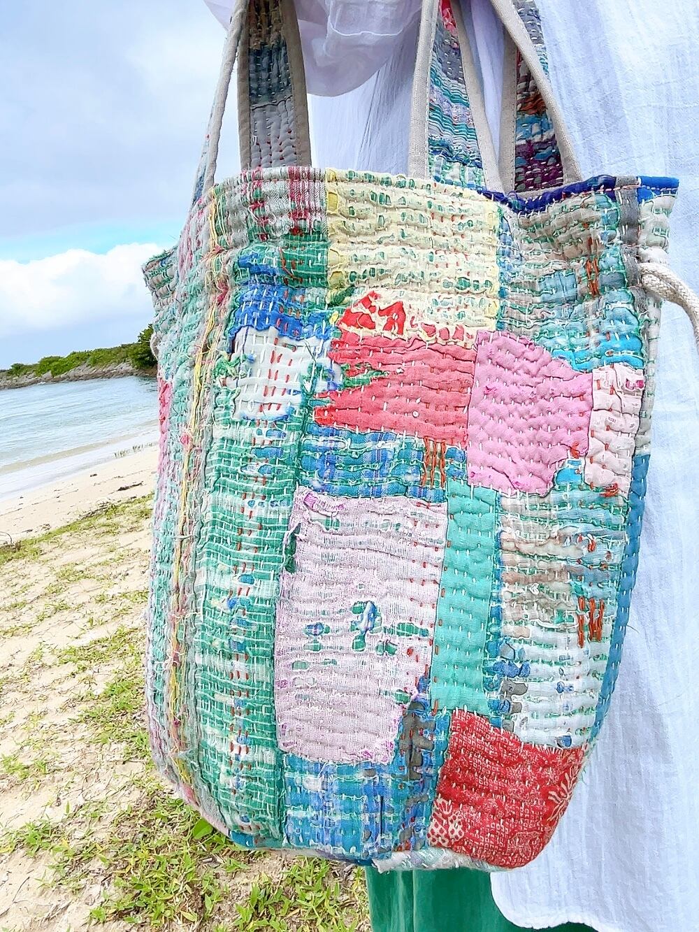 インドの伝統的な刺し子布「ラリーキルト」を贅沢に使用した、巾着型のトートバッグです。