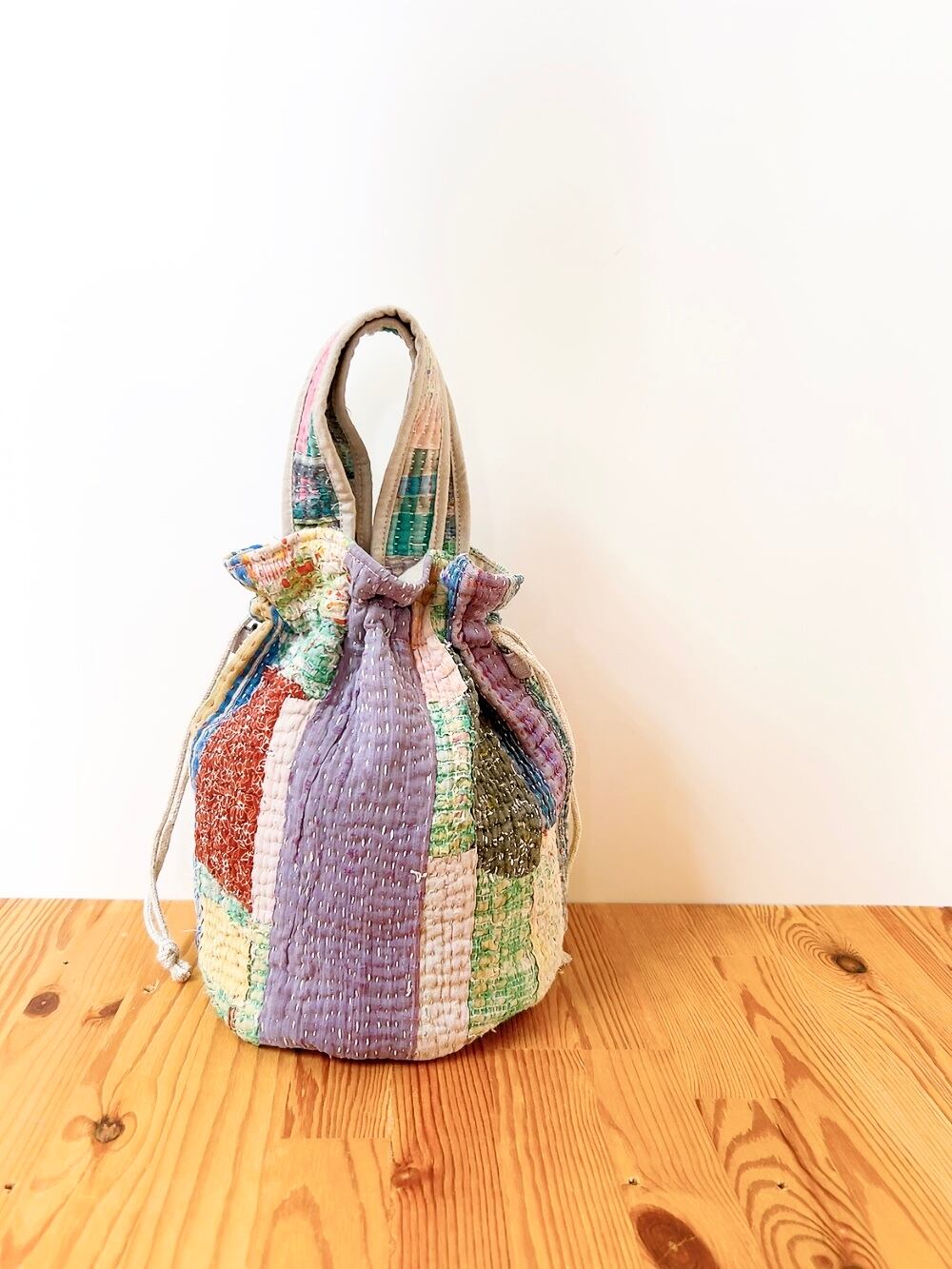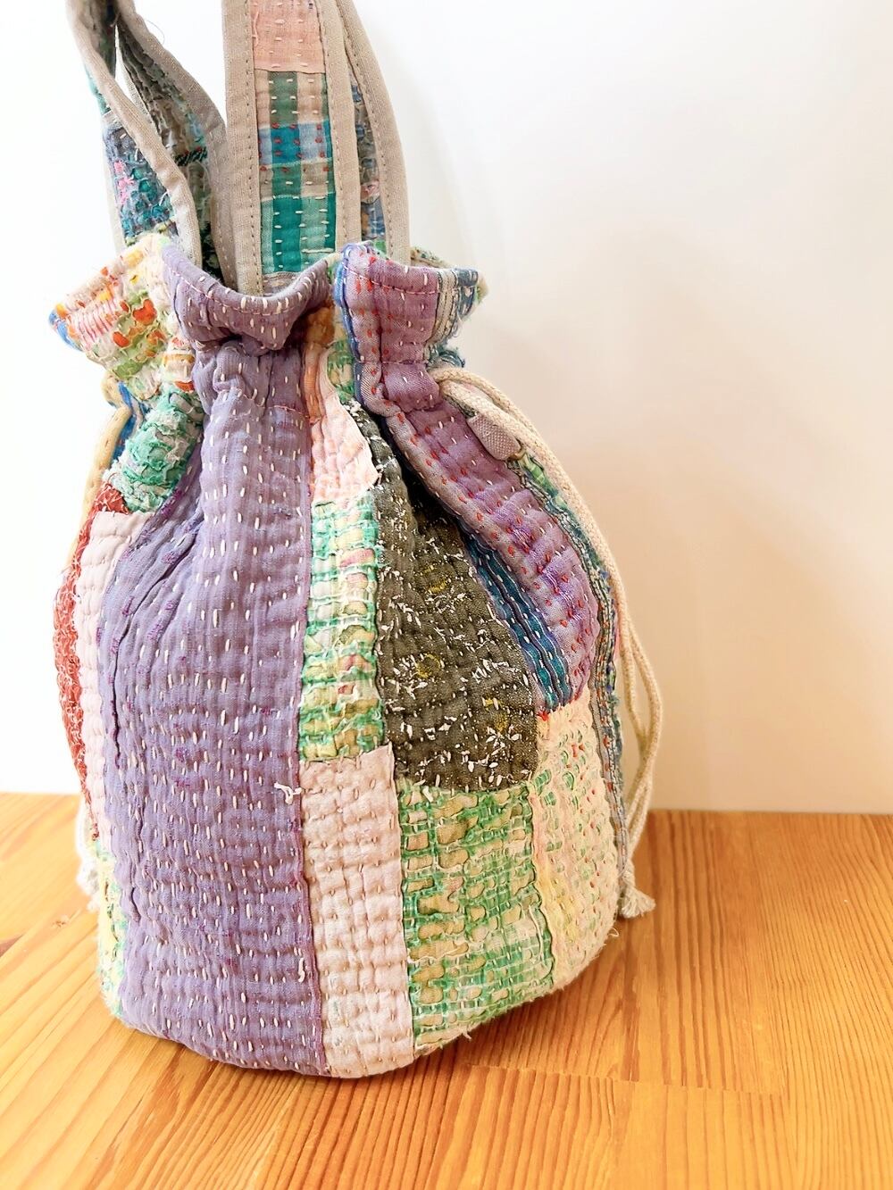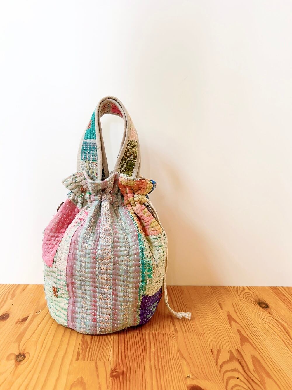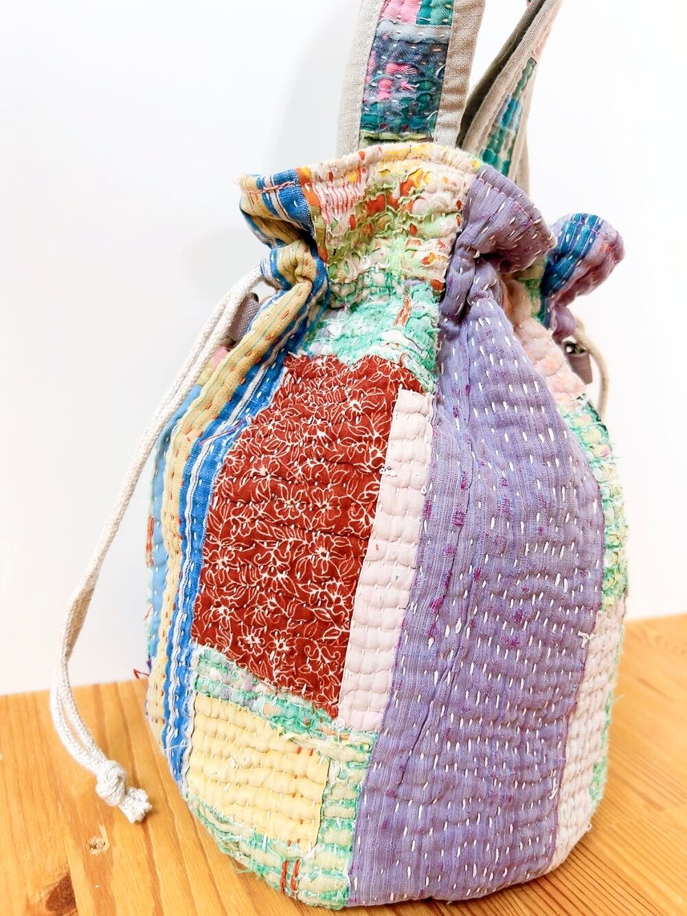 一点もののヴィンテージラリーキルトの巾着バッグ。カラフルなパッチワーク柄と可愛らしいサイズ感が魅力です。