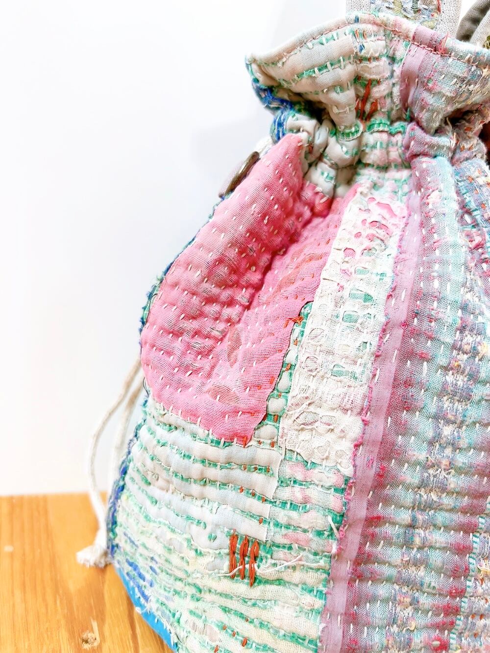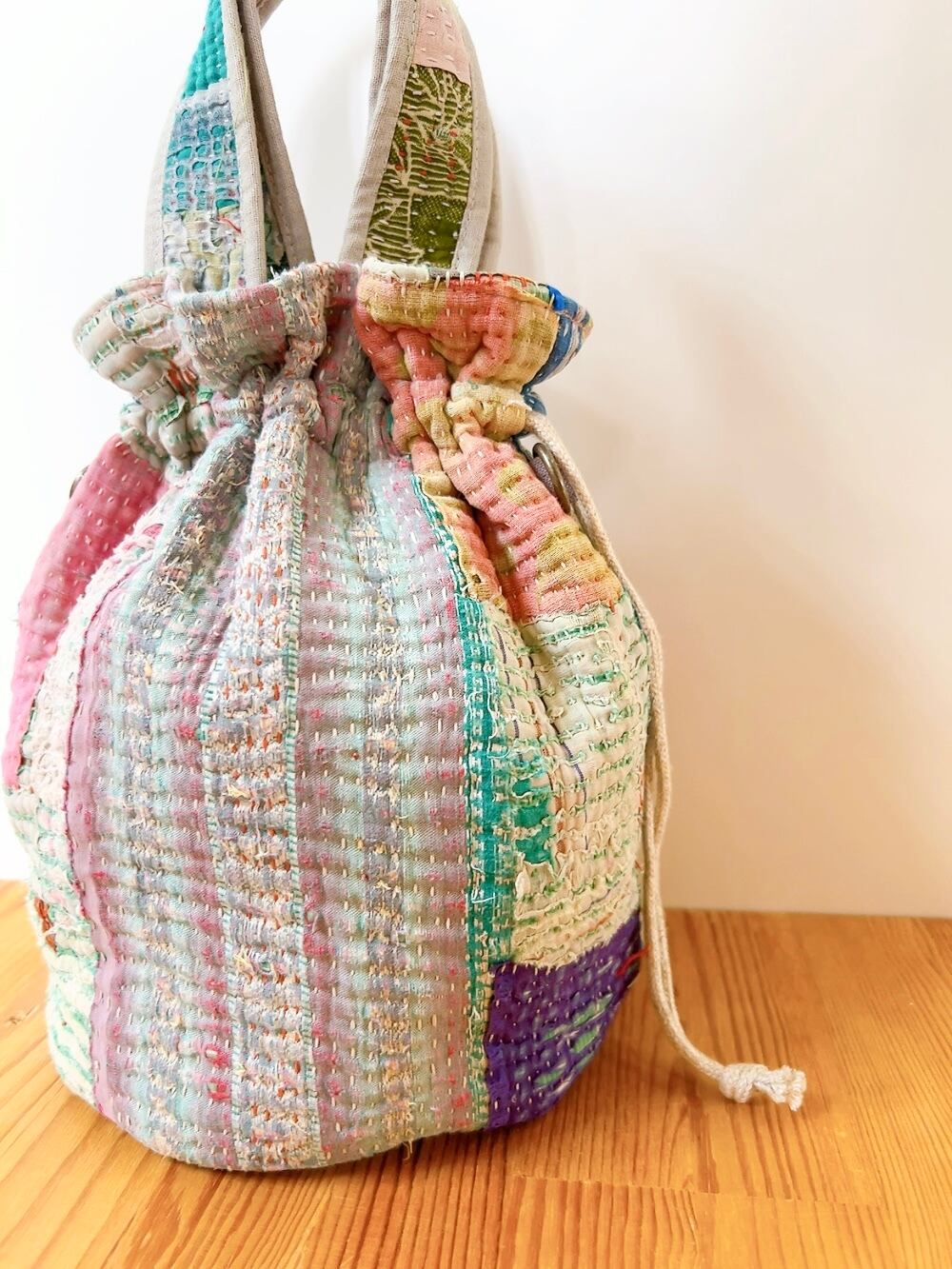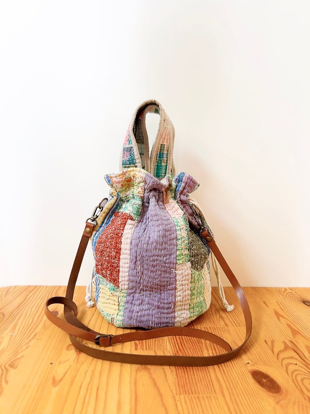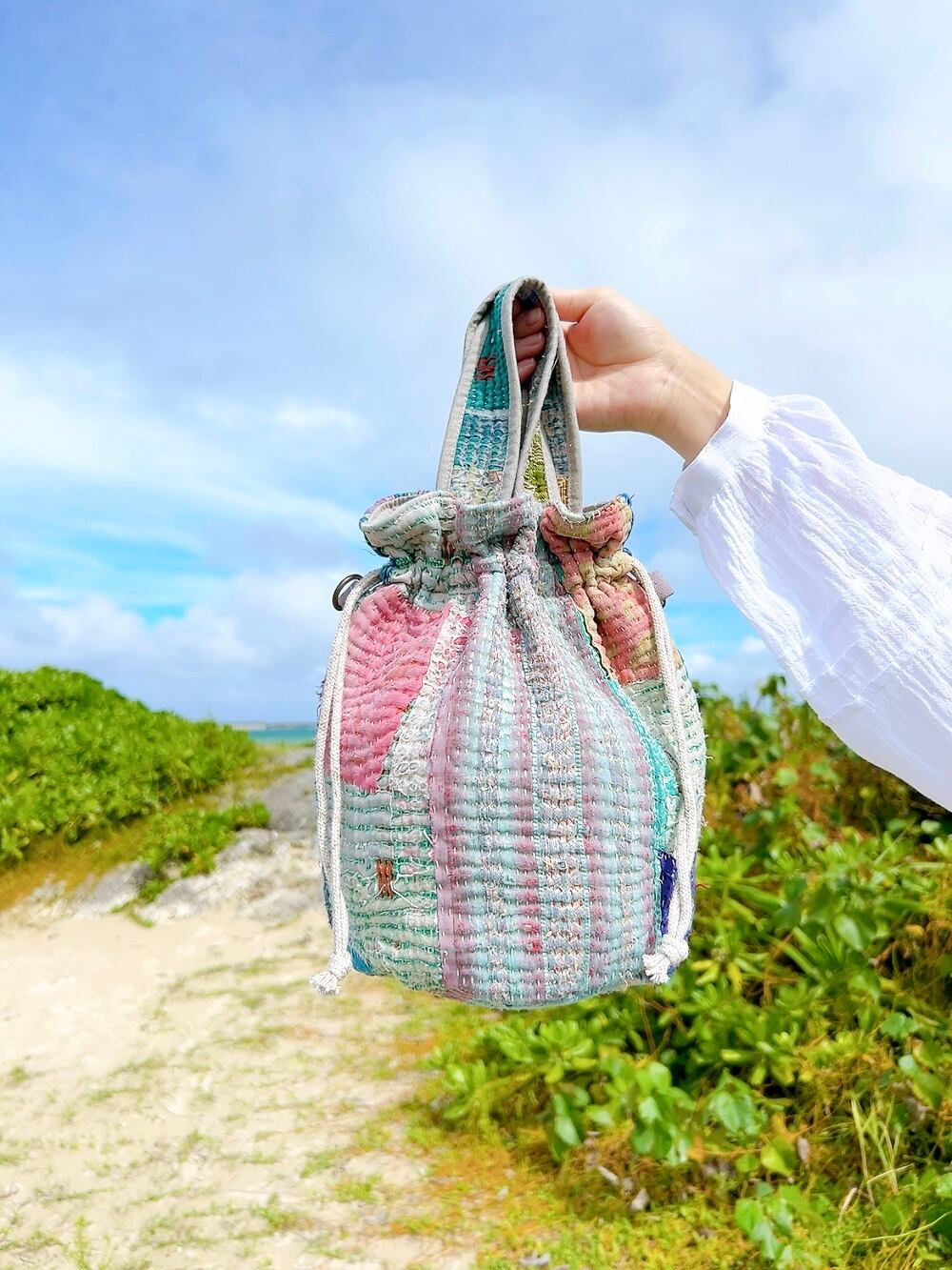 一点もののヴィンテージラリーキルトの巾着バッグ。カラフルなパッチワーク柄と可愛らしいサイズ感が魅力です。