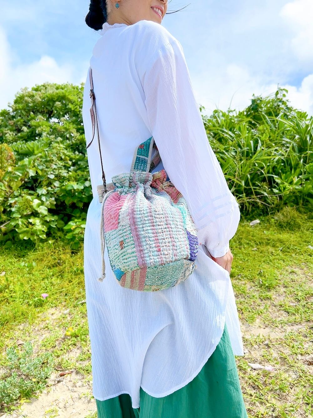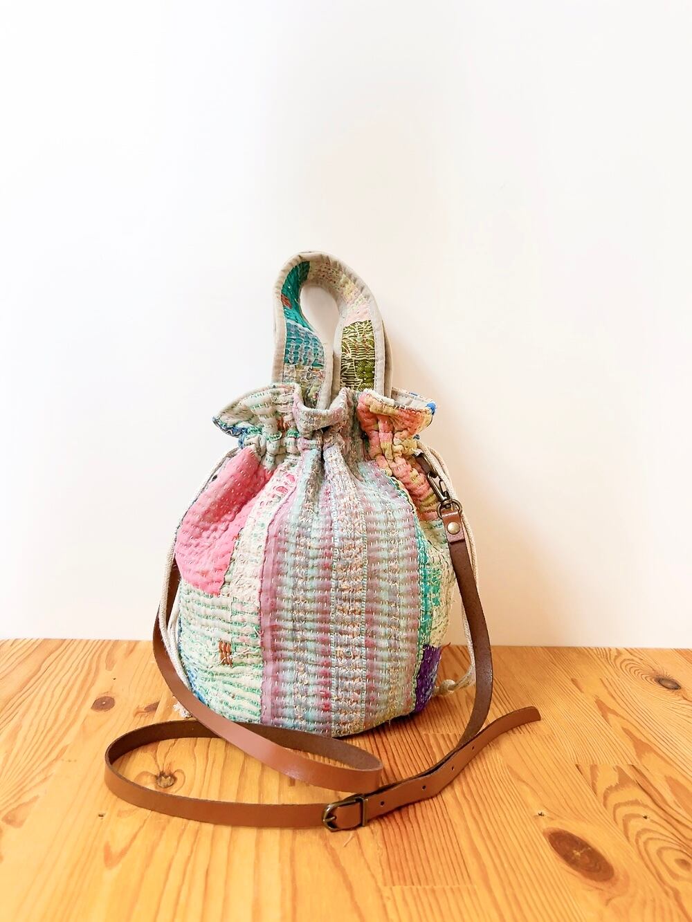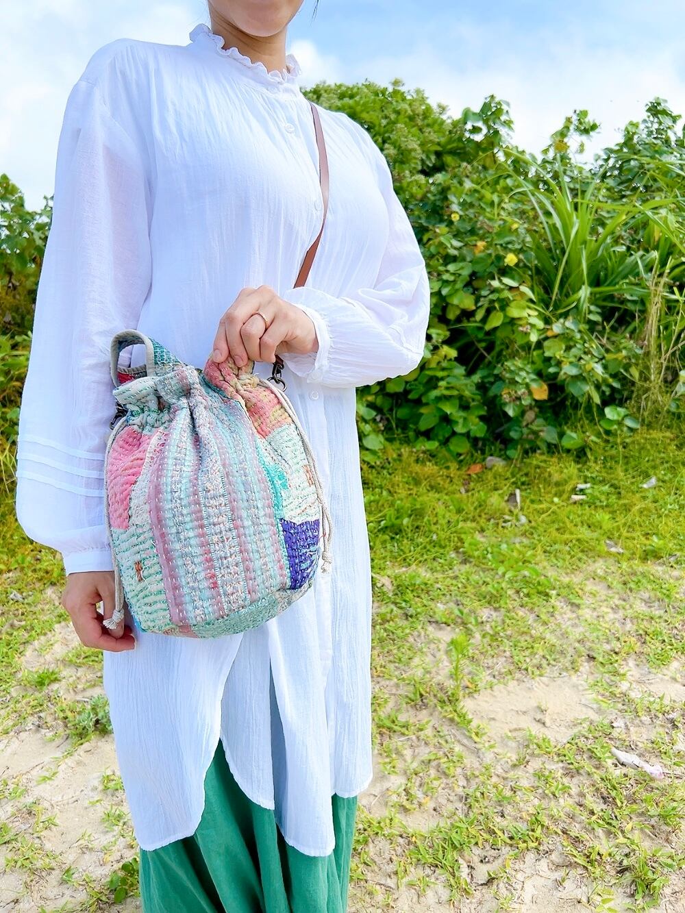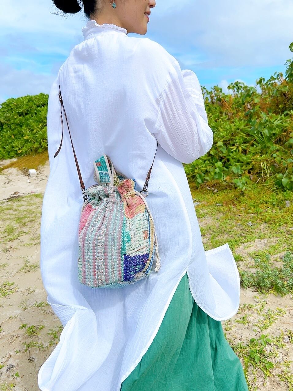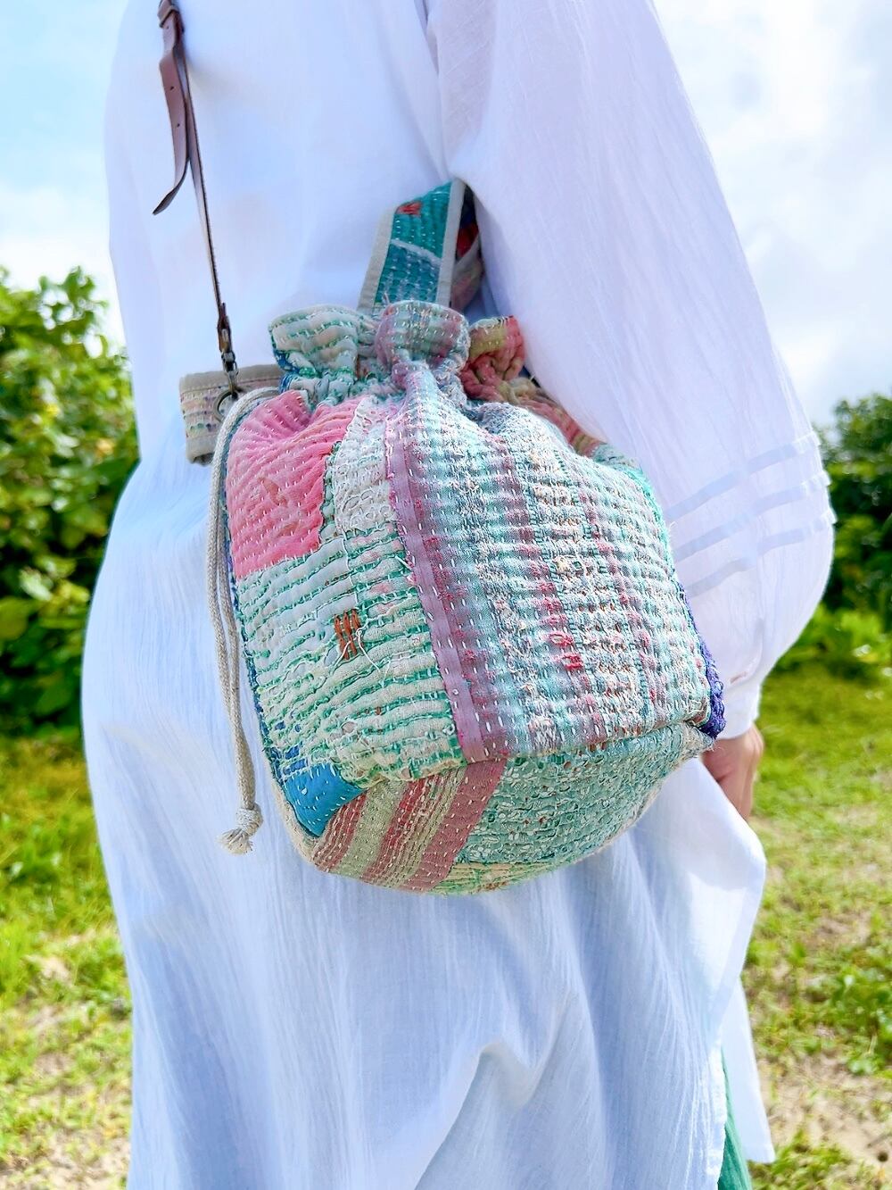 一点もののヴィンテージラリーキルトの巾着バッグ。カラフルなパッチワーク柄と可愛らしいサイズ感が魅力です。