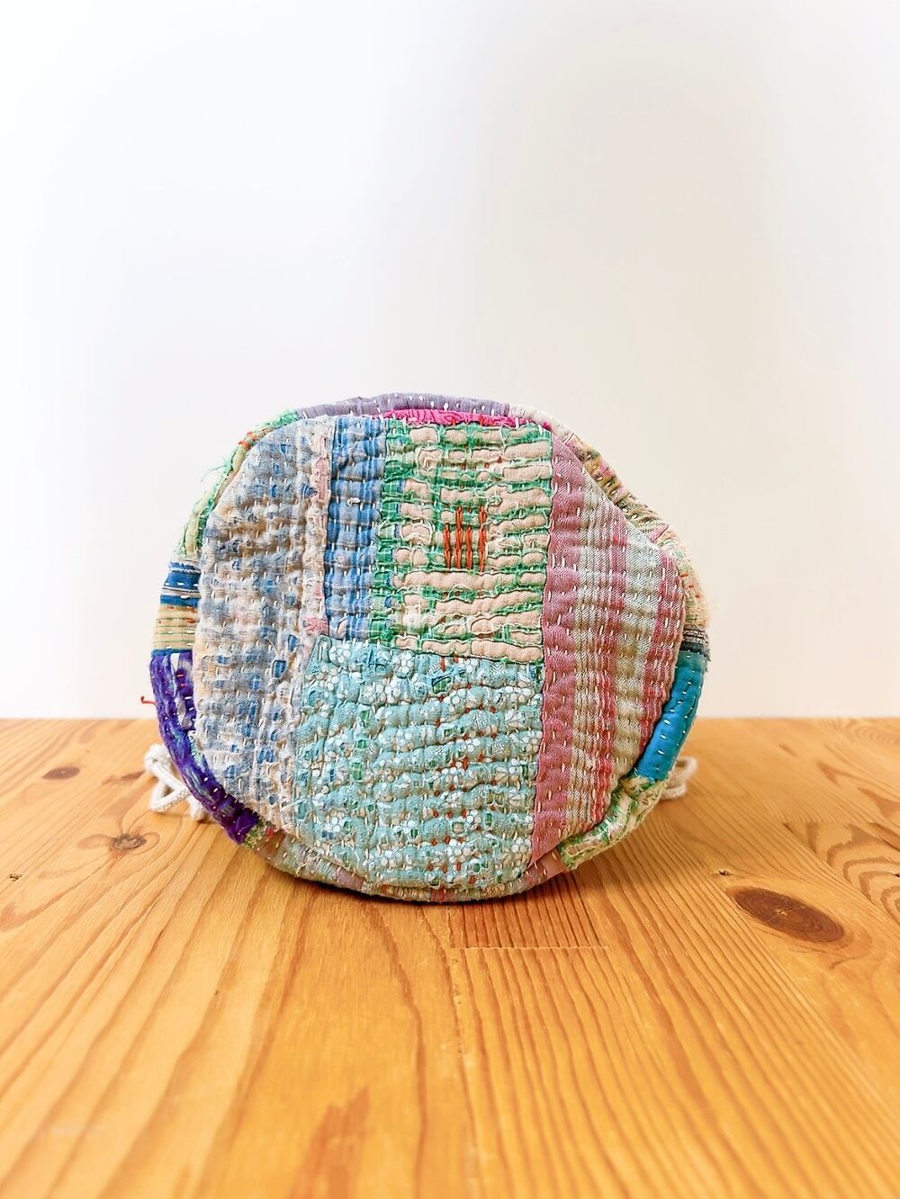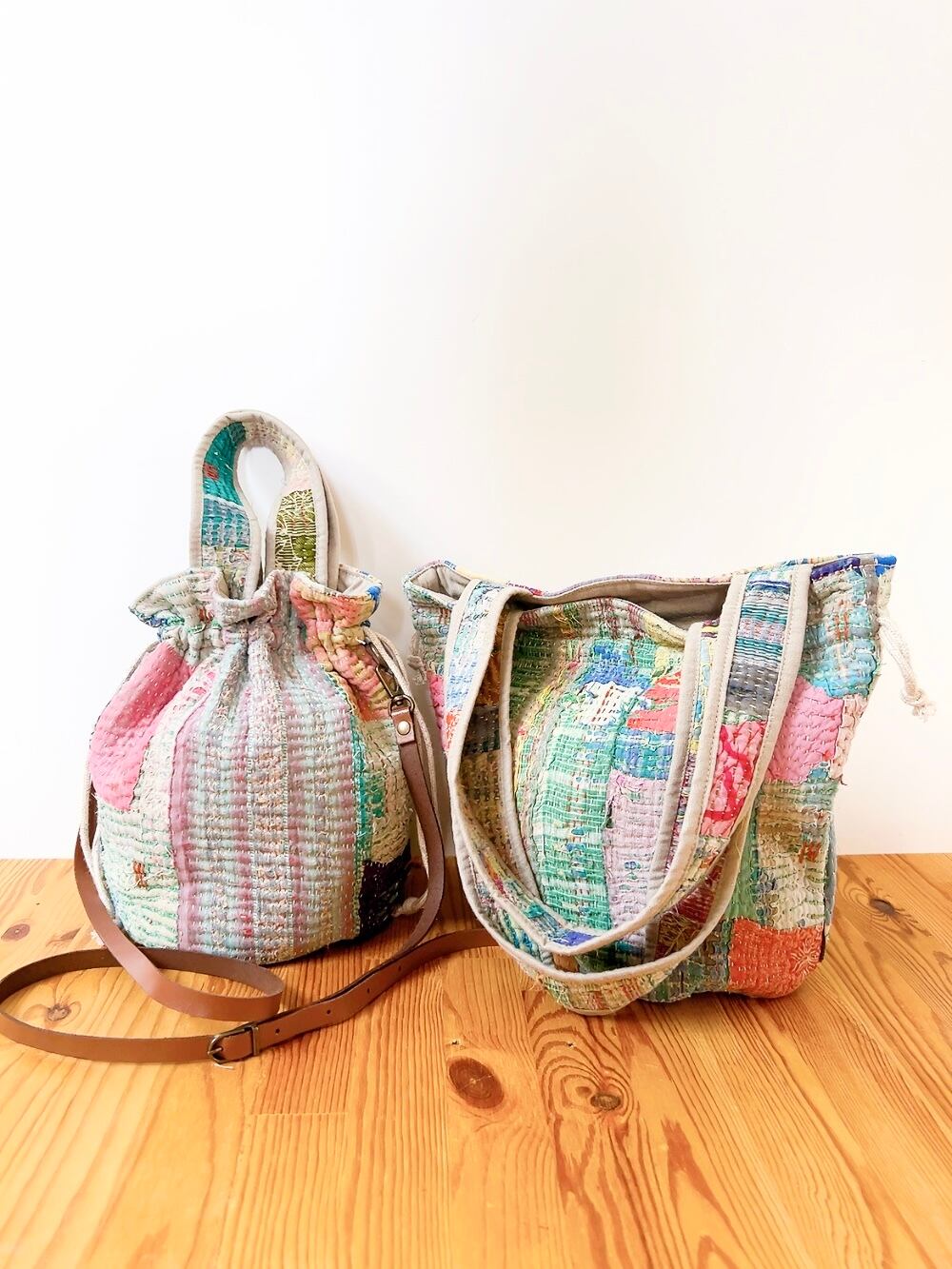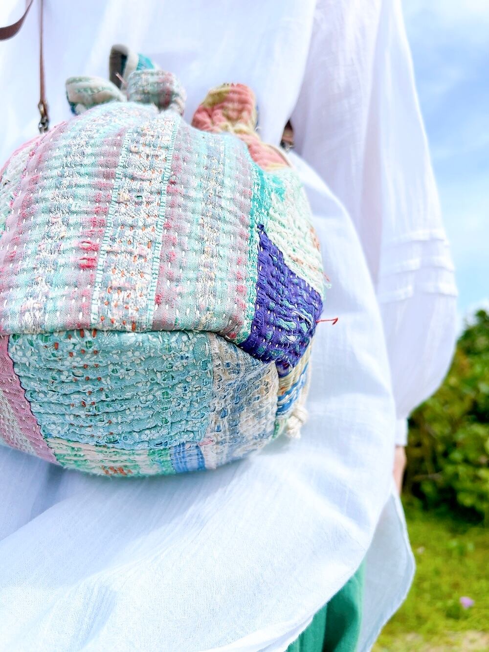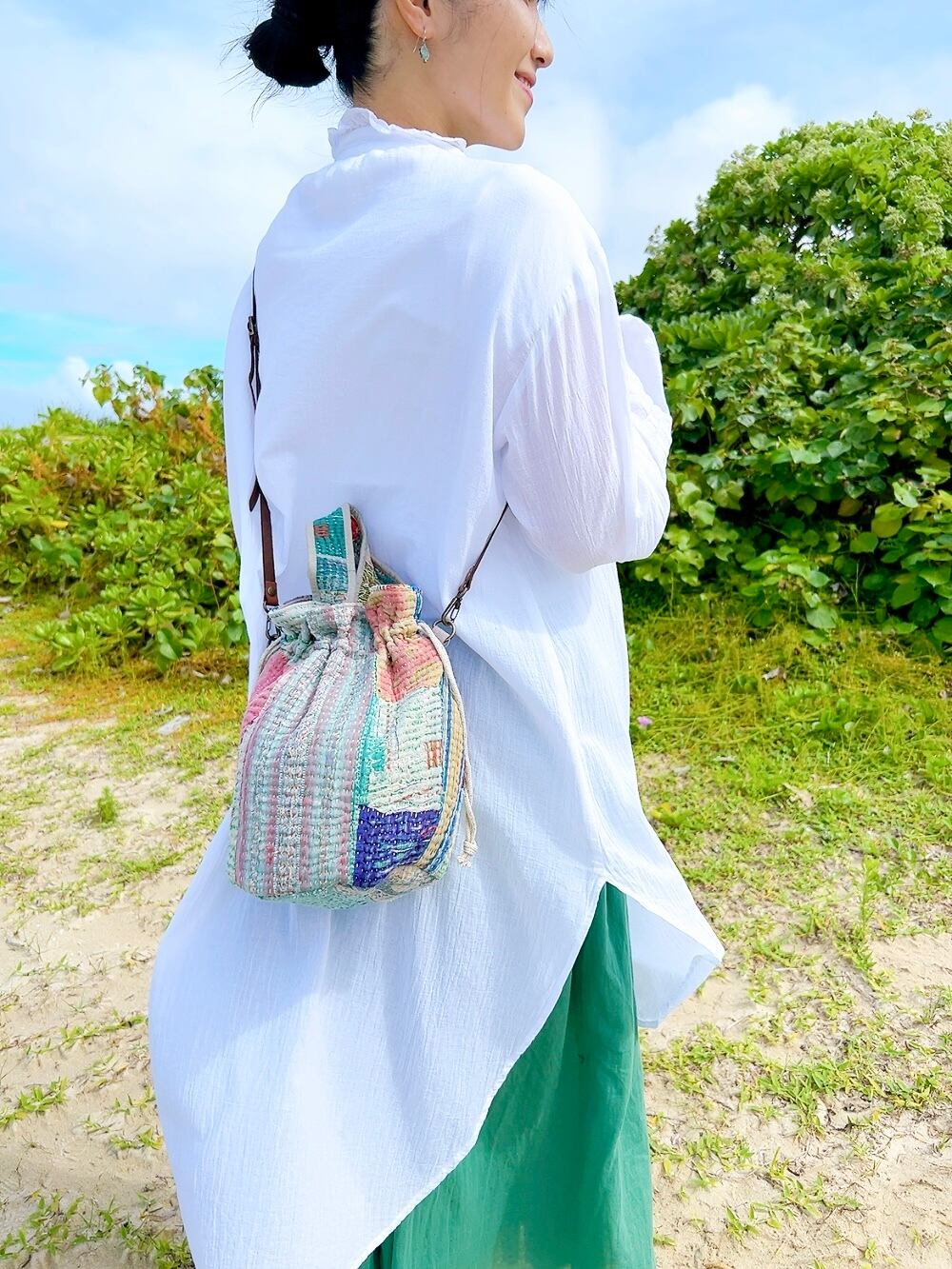 一点もののヴィンテージラリーキルトの巾着バッグ。カラフルなパッチワーク柄と可愛らしいサイズ感が魅力です。