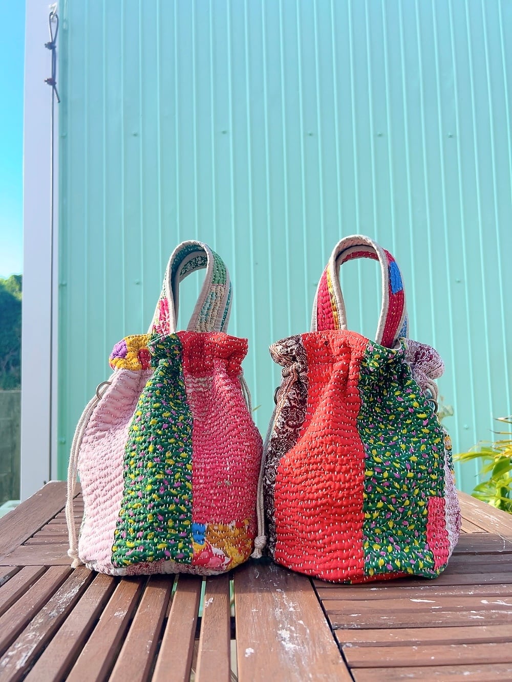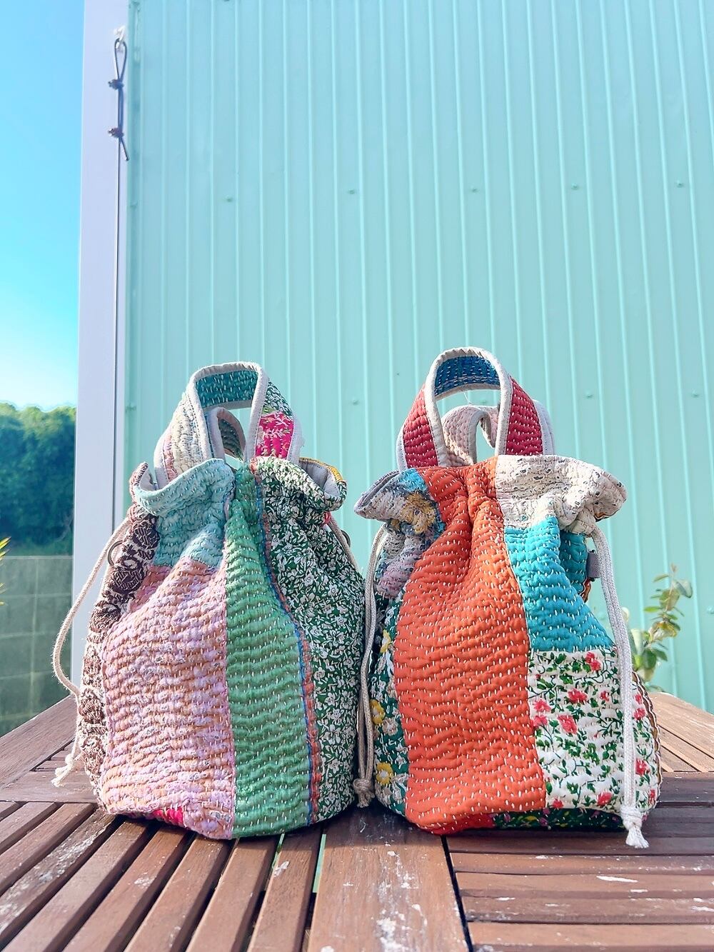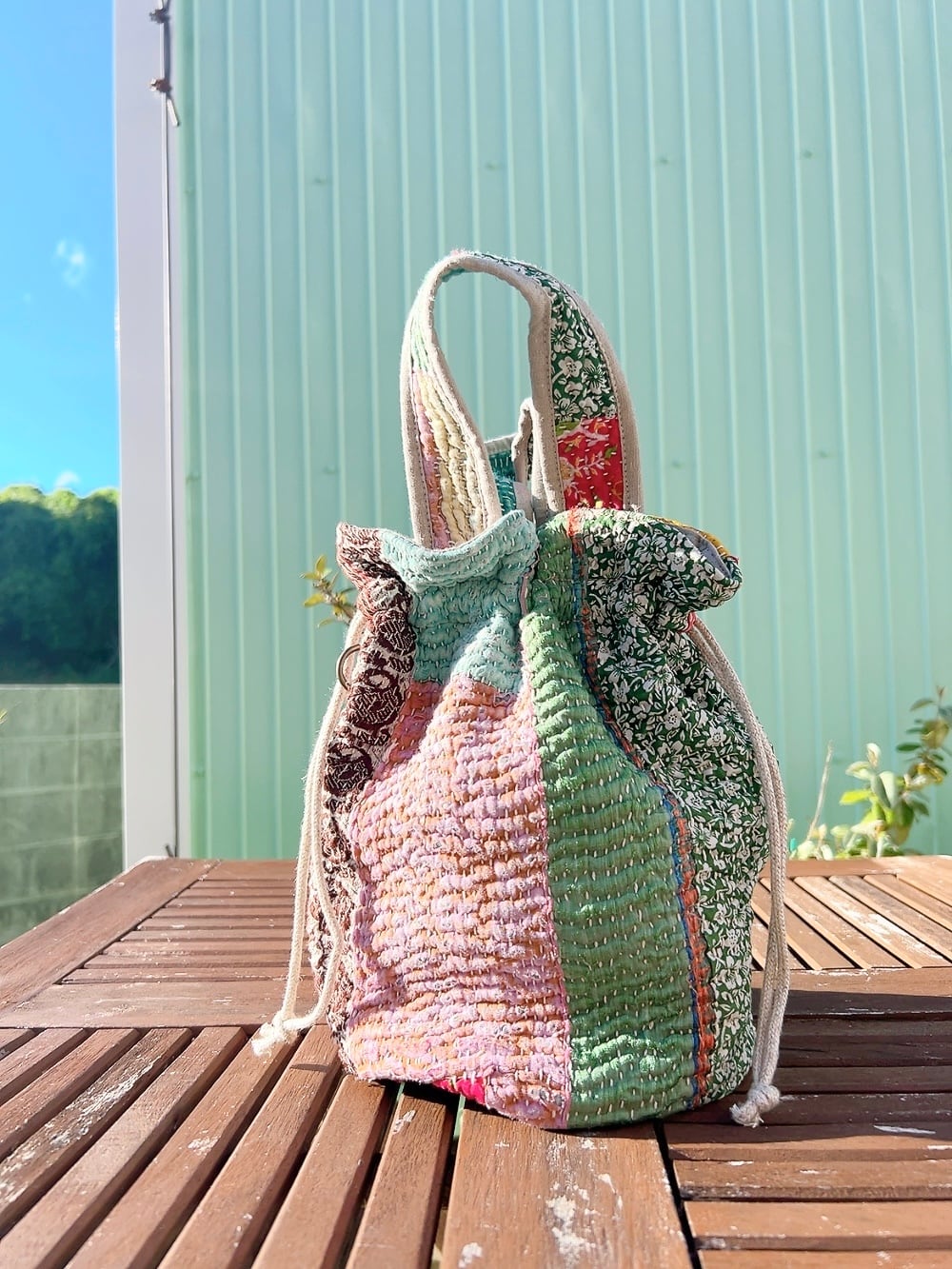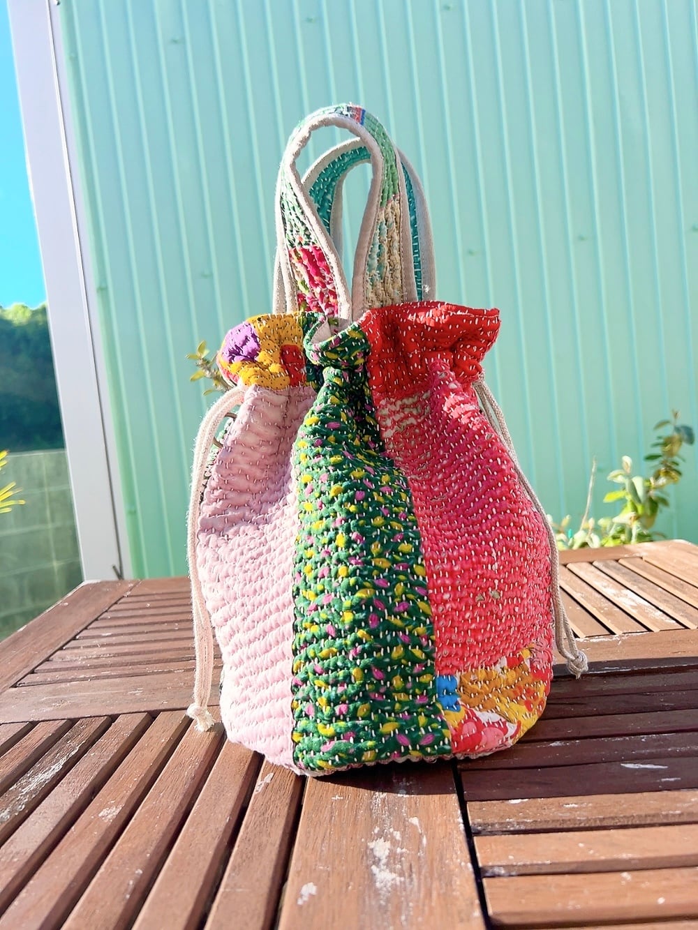 一点もののヴィンテージラリーキルトの巾着バッグ。カラフルなパッチワーク柄と可愛らしいサイズ感が魅力です。