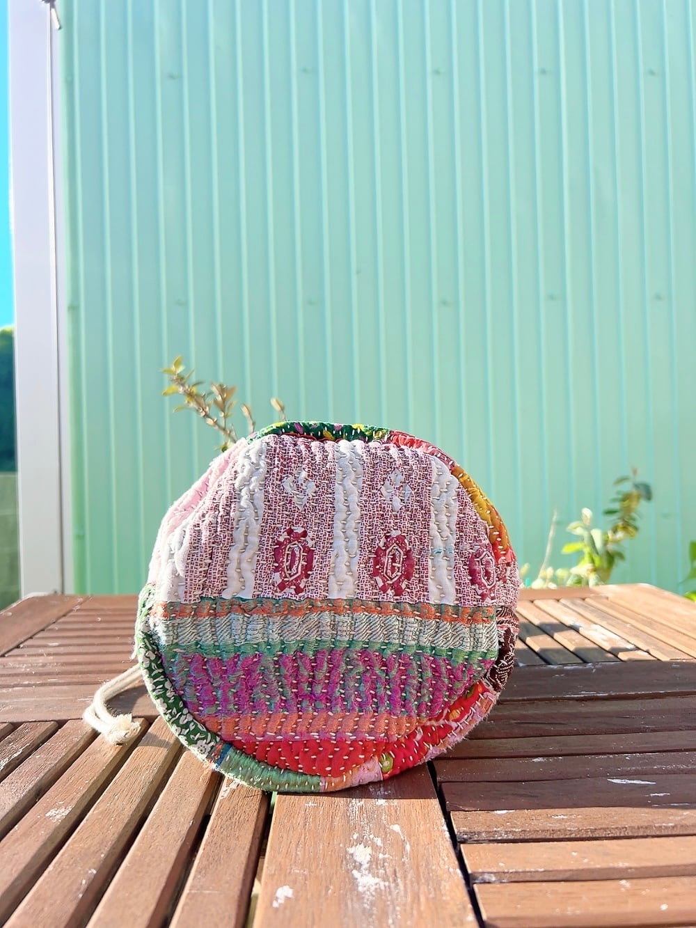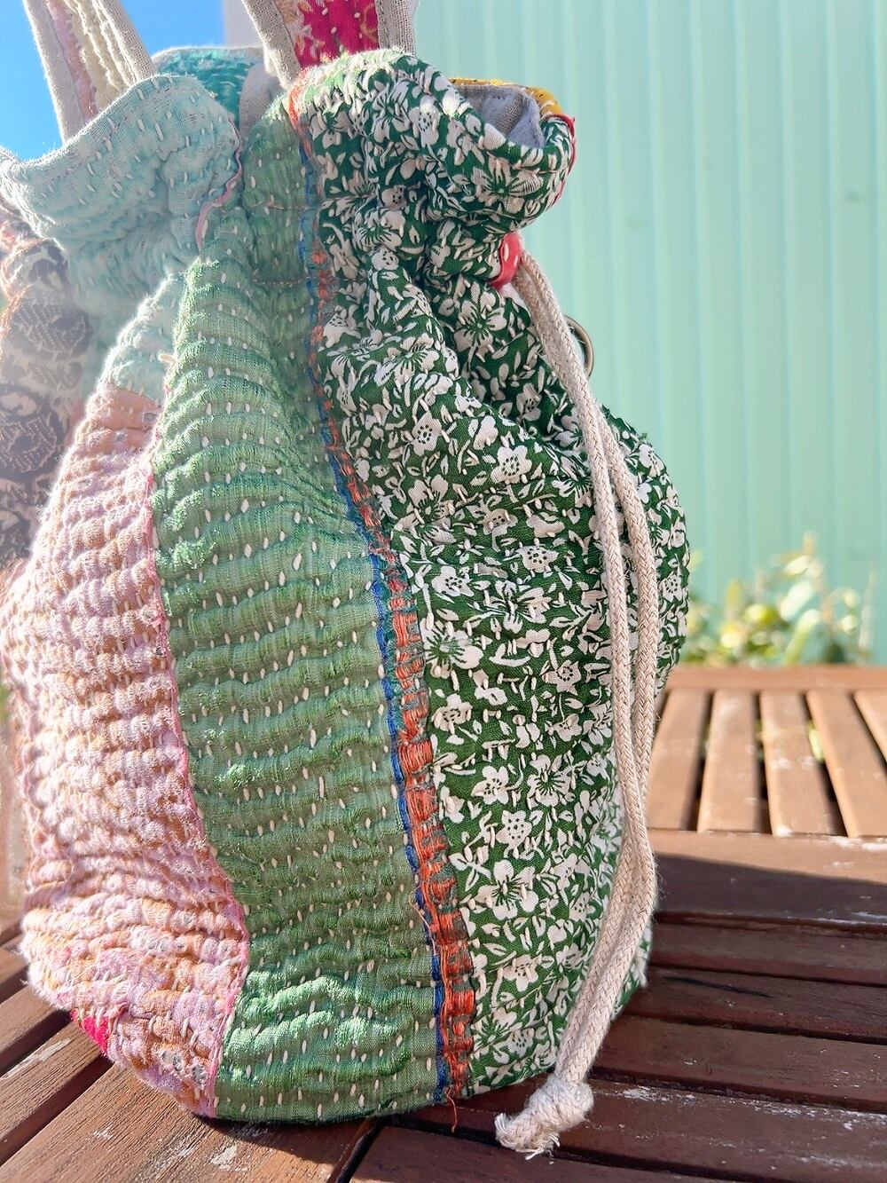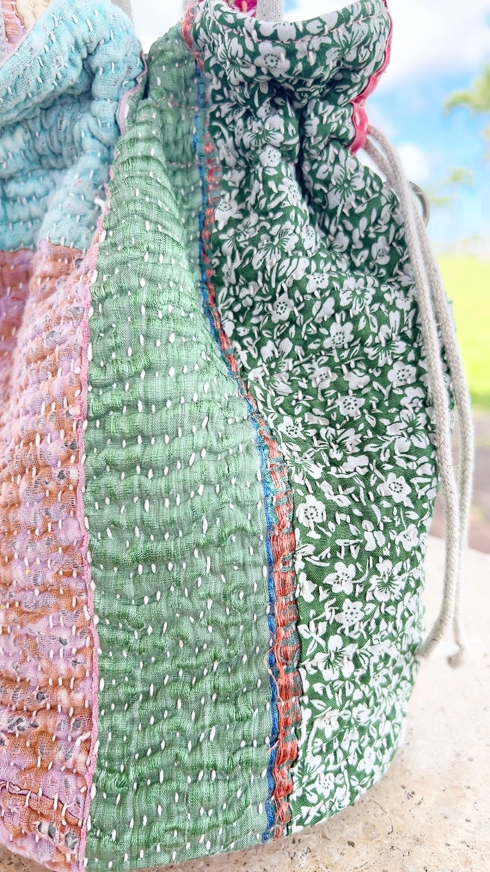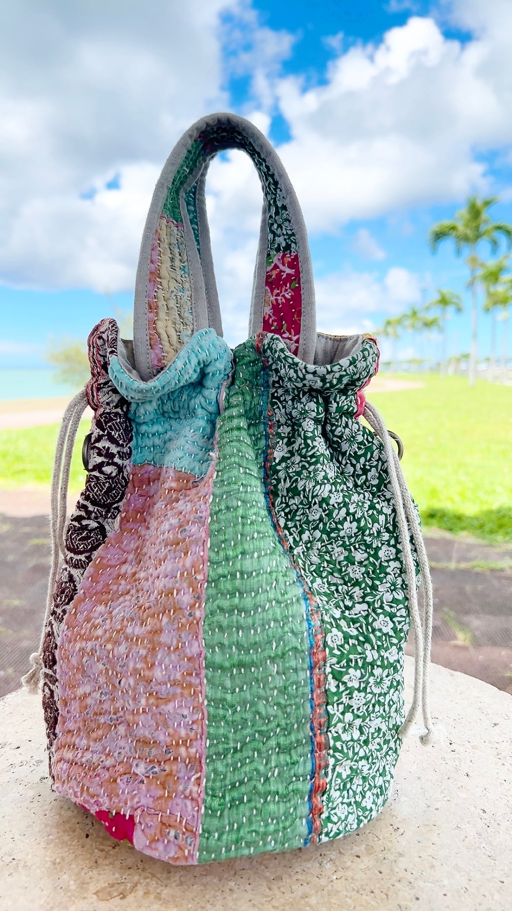 一点もののヴィンテージラリーキルトの巾着バッグ。カラフルなパッチワーク柄と可愛らしいサイズ感が魅力です。