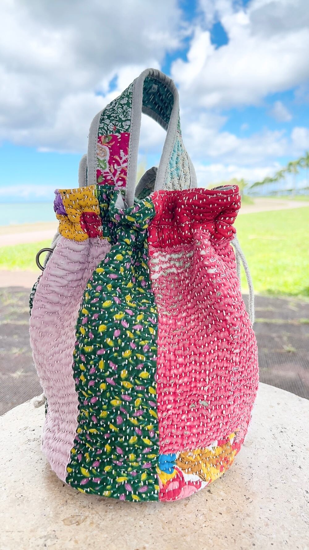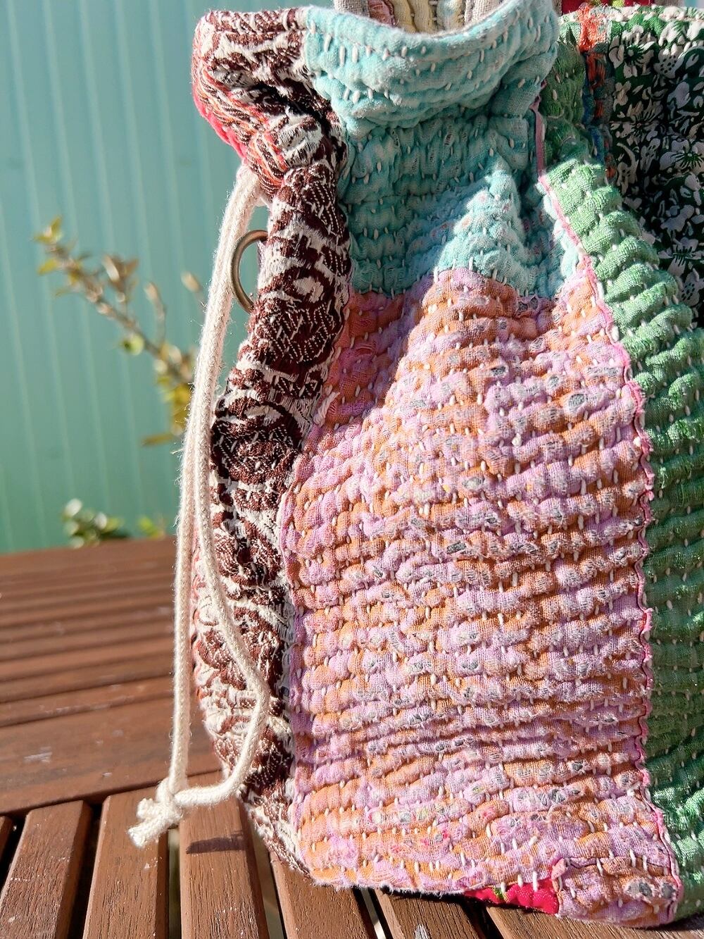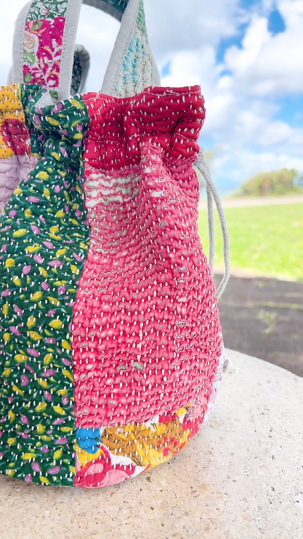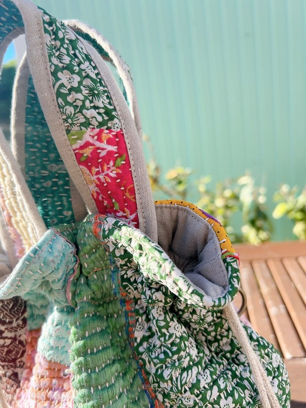 一点もののヴィンテージラリーキルトの巾着バッグ。カラフルなパッチワーク柄と可愛らしいサイズ感が魅力です。
