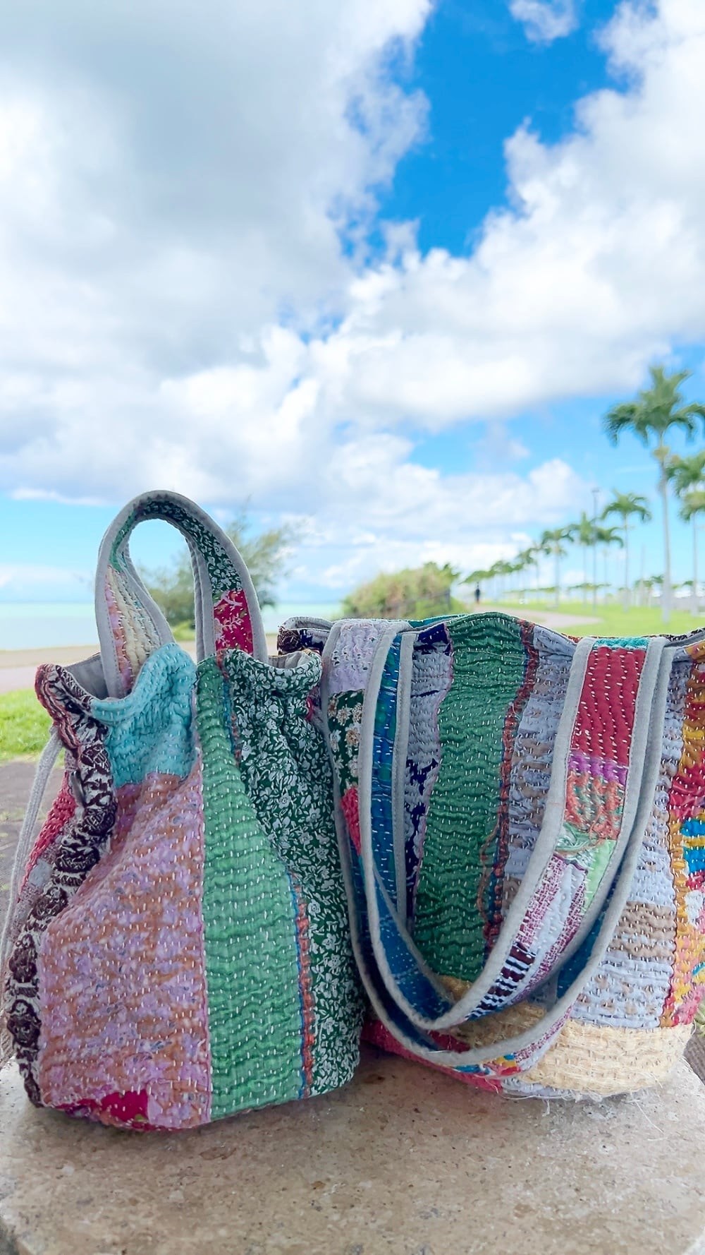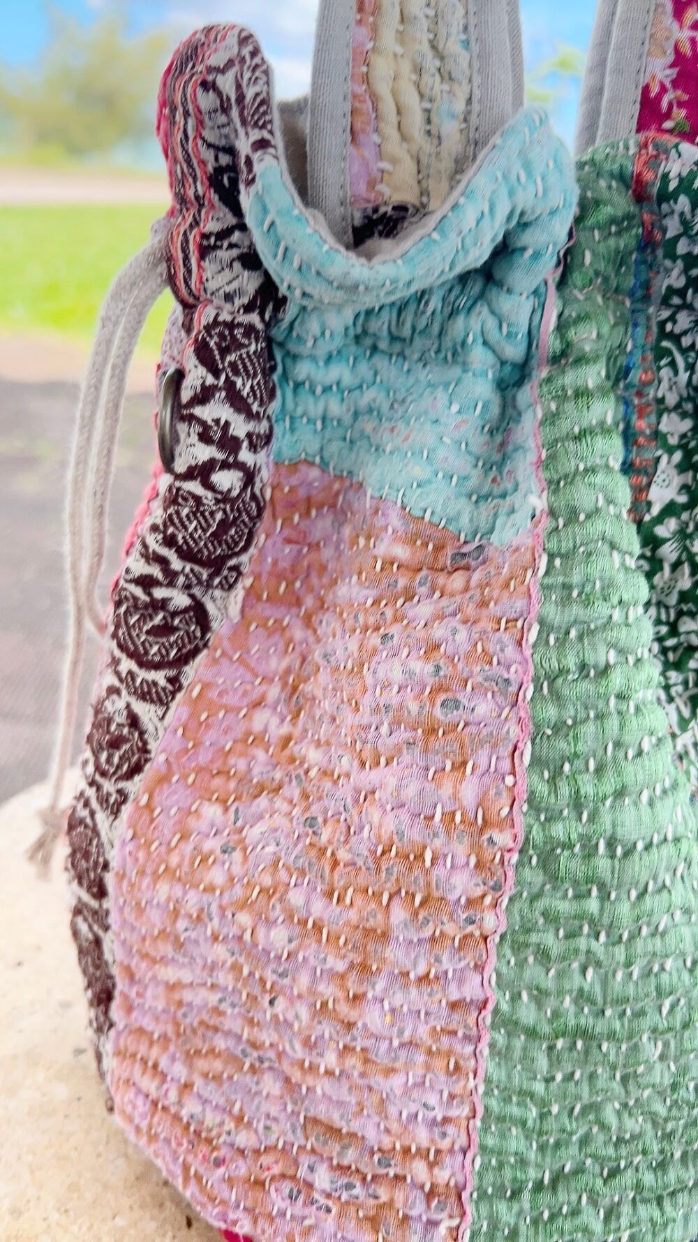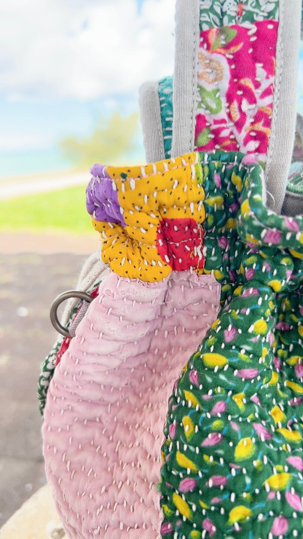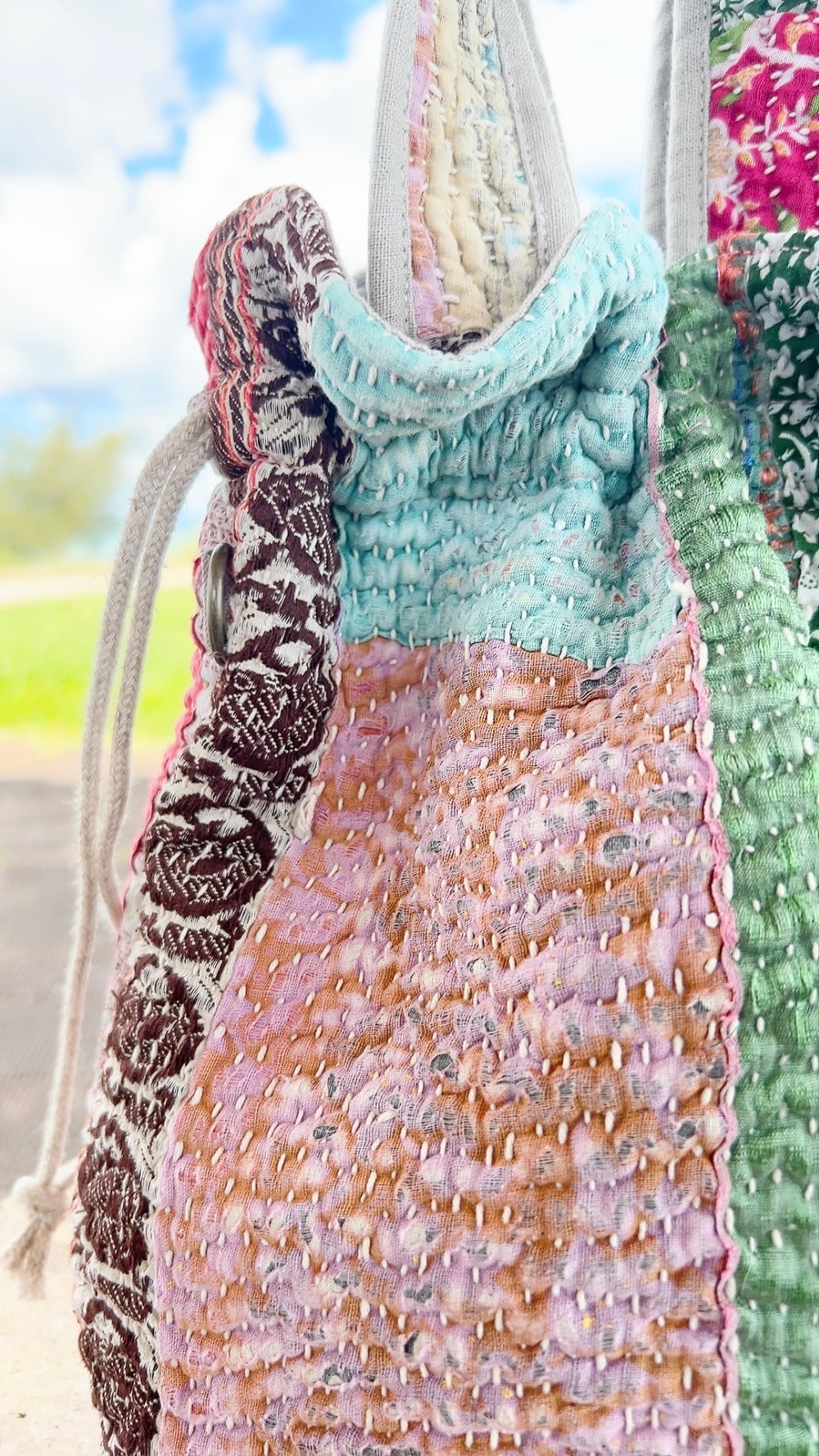 一点もののヴィンテージラリーキルトの巾着バッグ。カラフルなパッチワーク柄と可愛らしいサイズ感が魅力です。