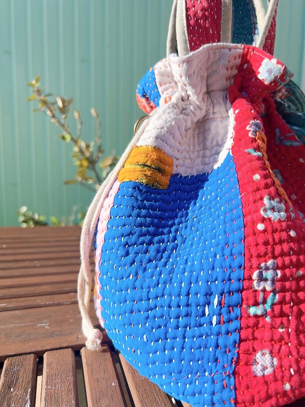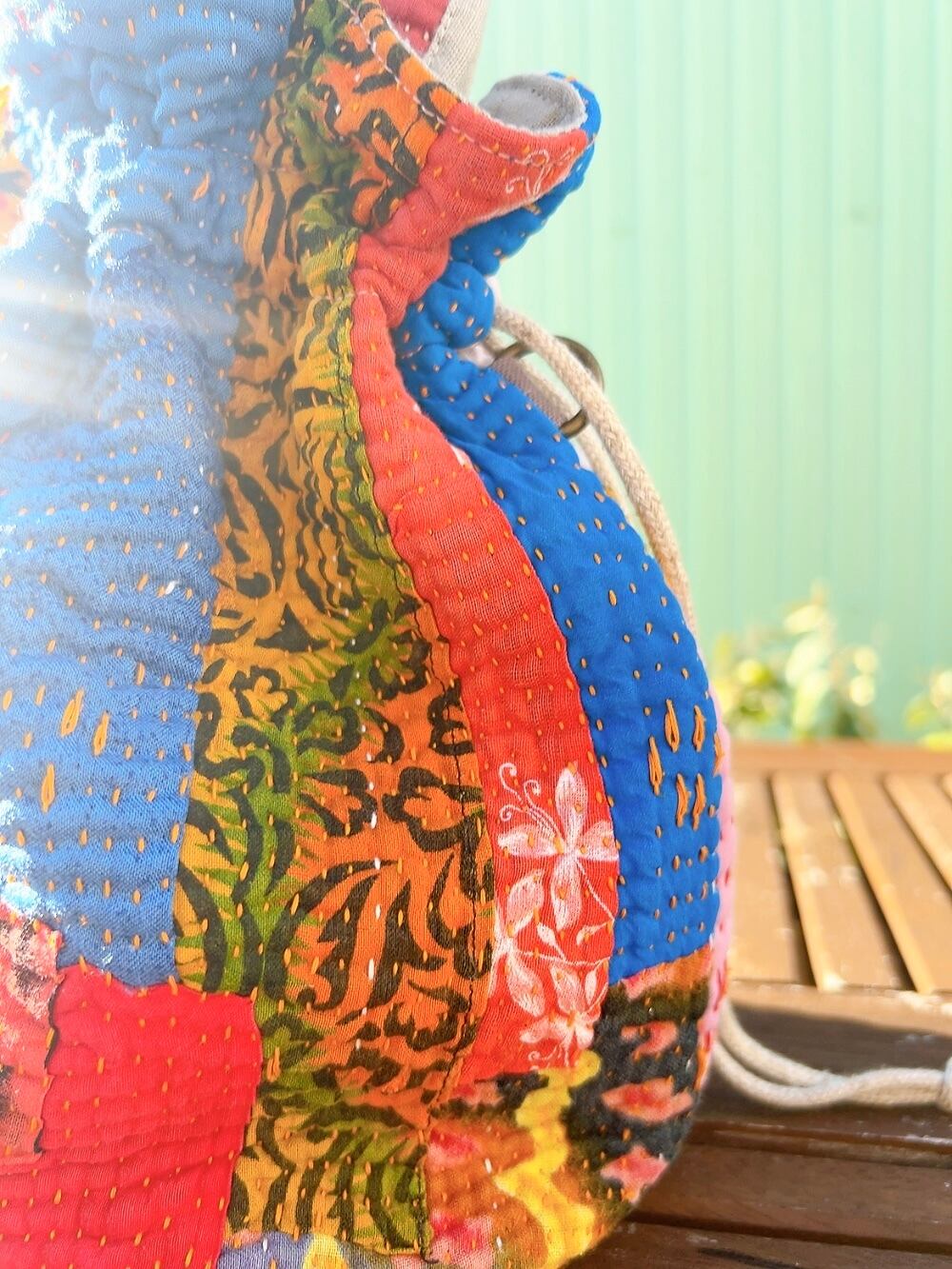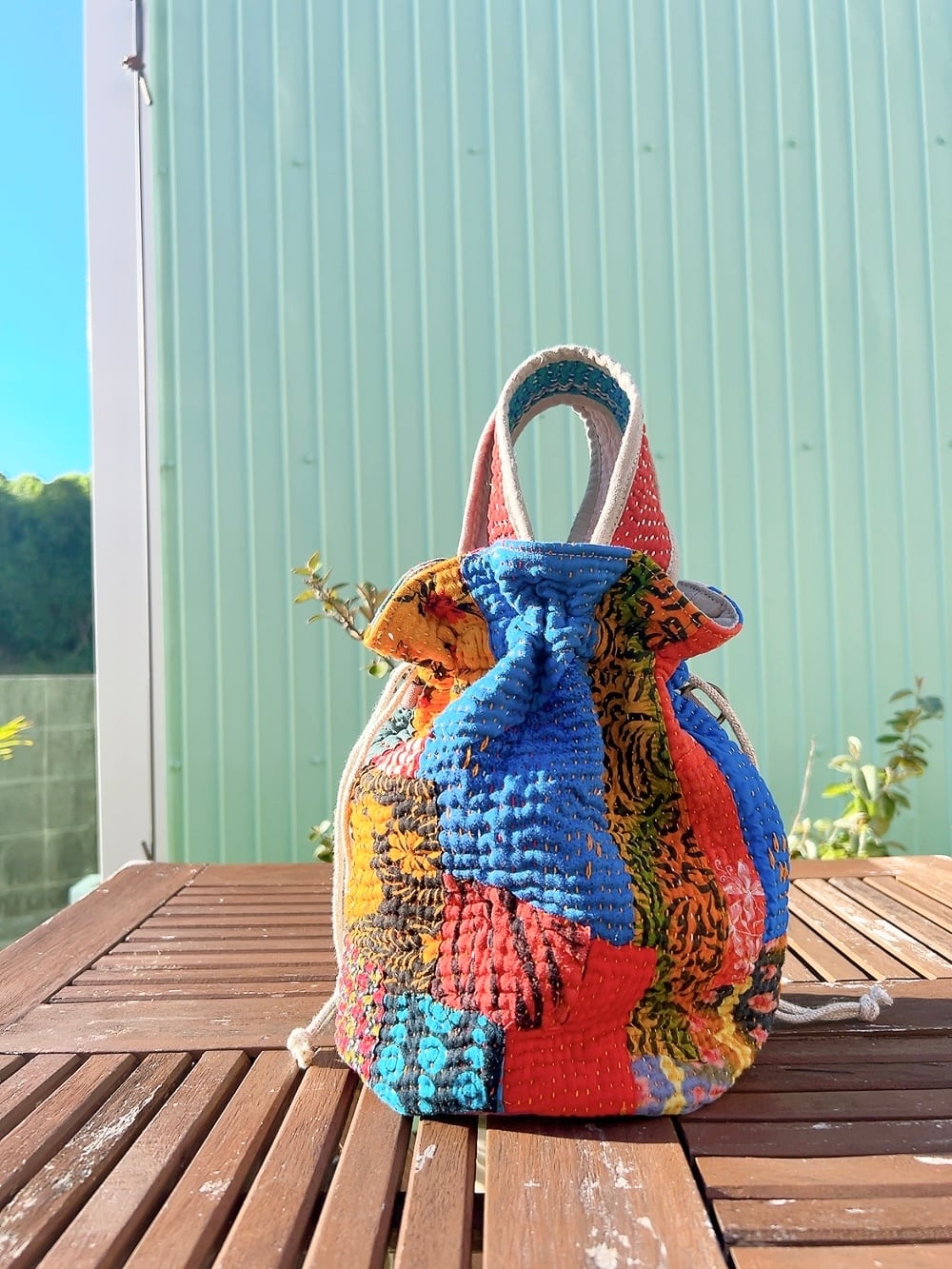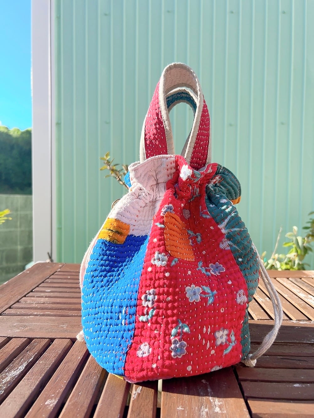 一点もののヴィンテージラリーキルトの巾着バッグ。カラフルなパッチワーク柄と可愛らしいサイズ感が魅力です。