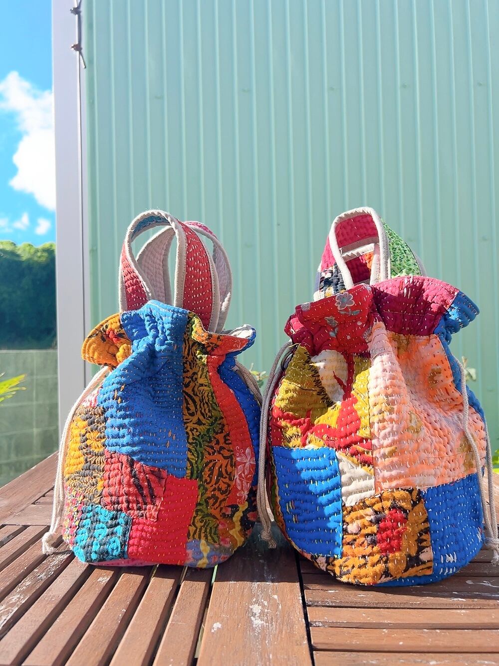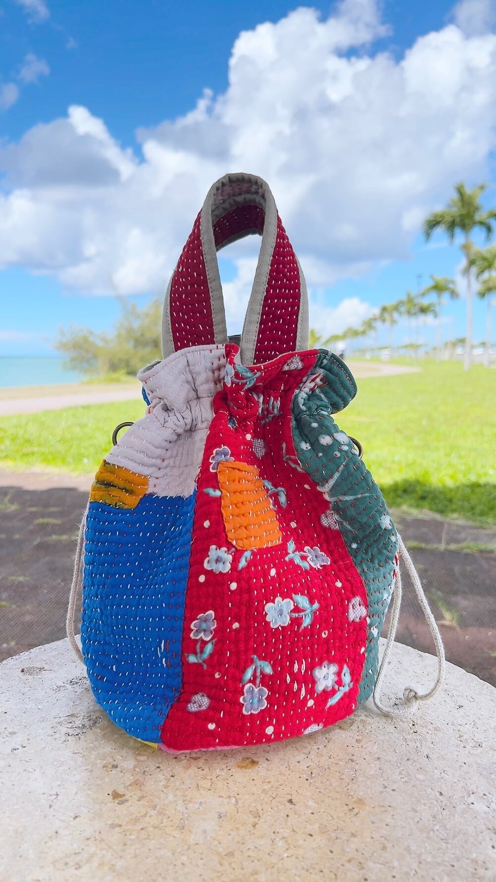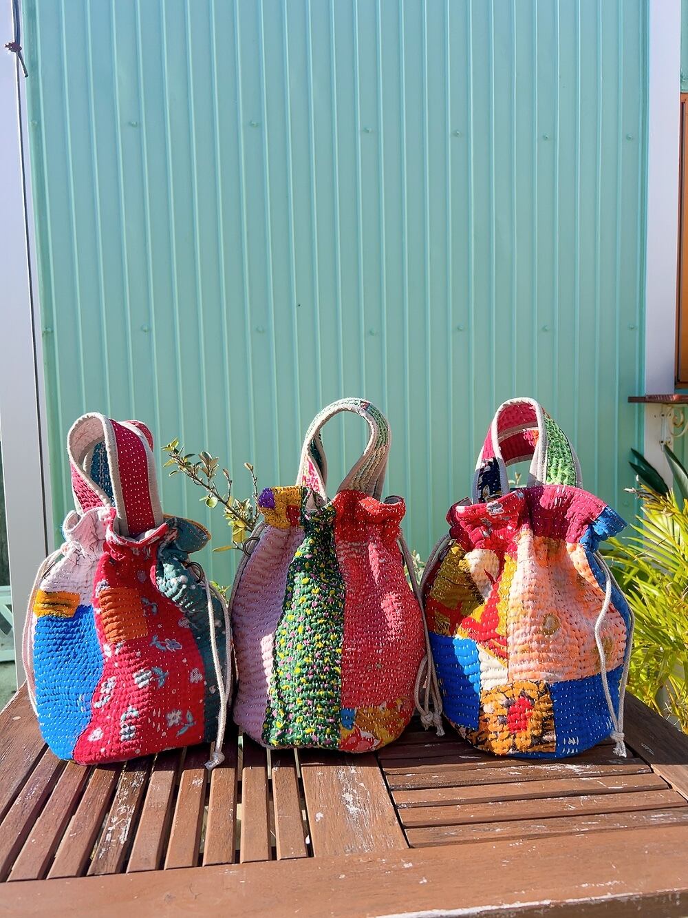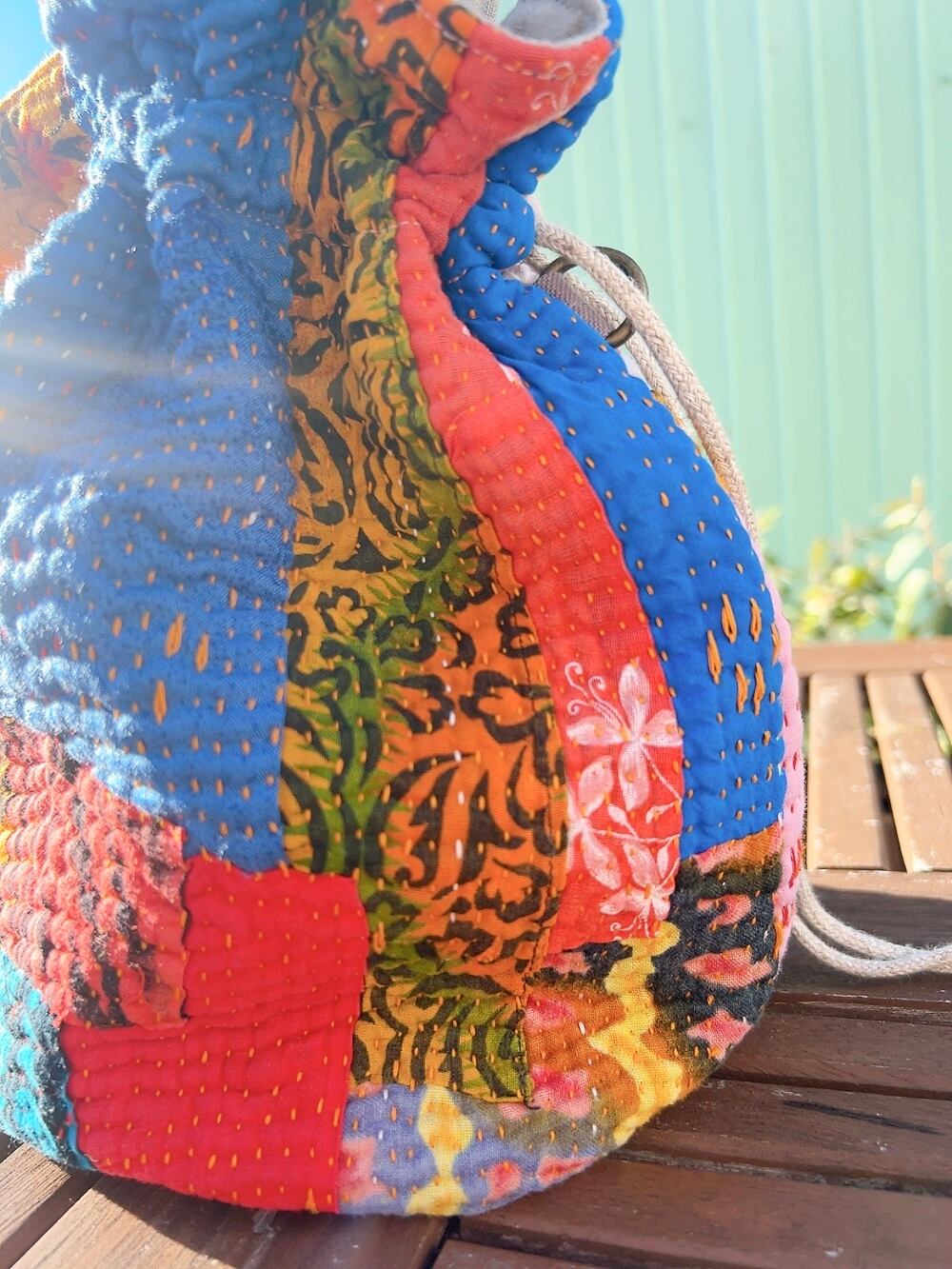 一点もののヴィンテージラリーキルトの巾着バッグ。カラフルなパッチワーク柄と可愛らしいサイズ感が魅力です。