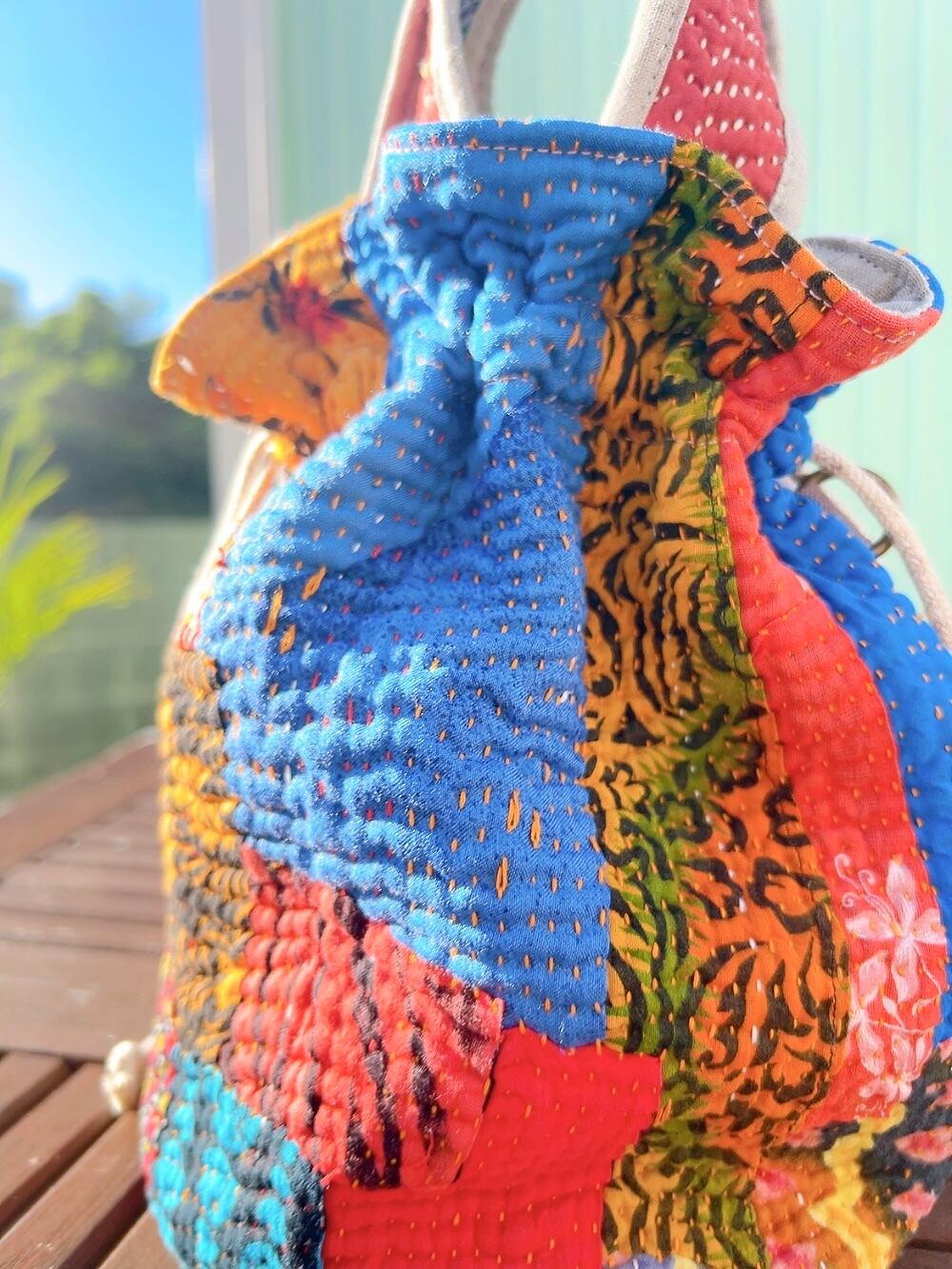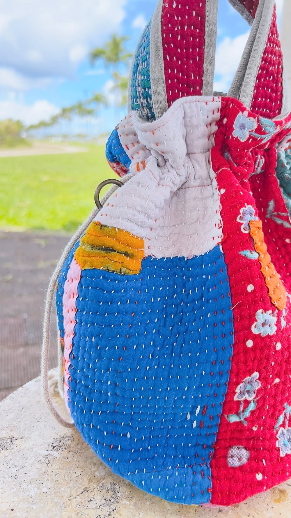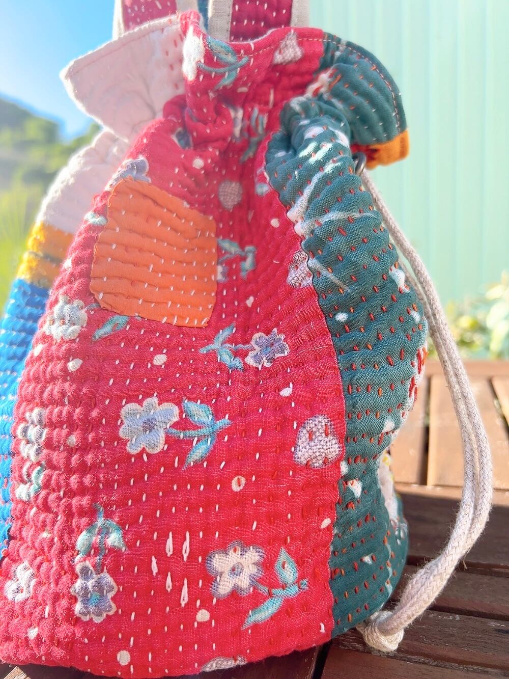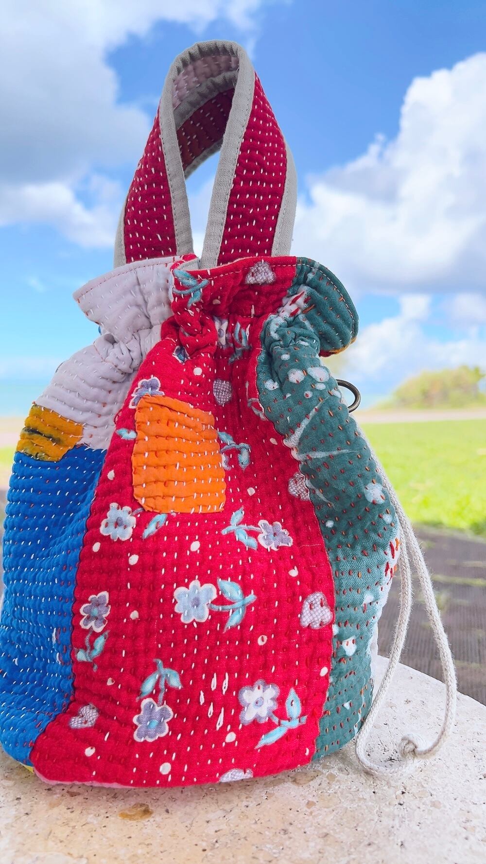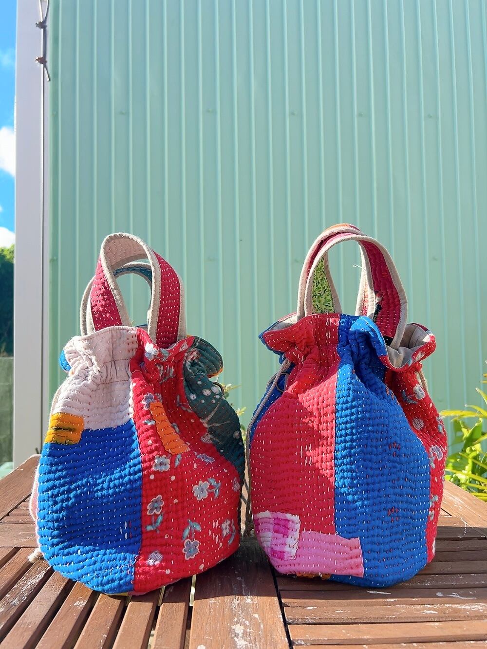 一点もののヴィンテージラリーキルトの巾着バッグ。カラフルなパッチワーク柄と可愛らしいサイズ感が魅力です。