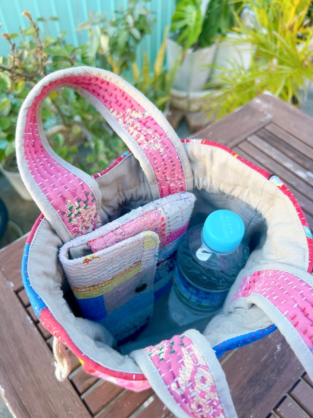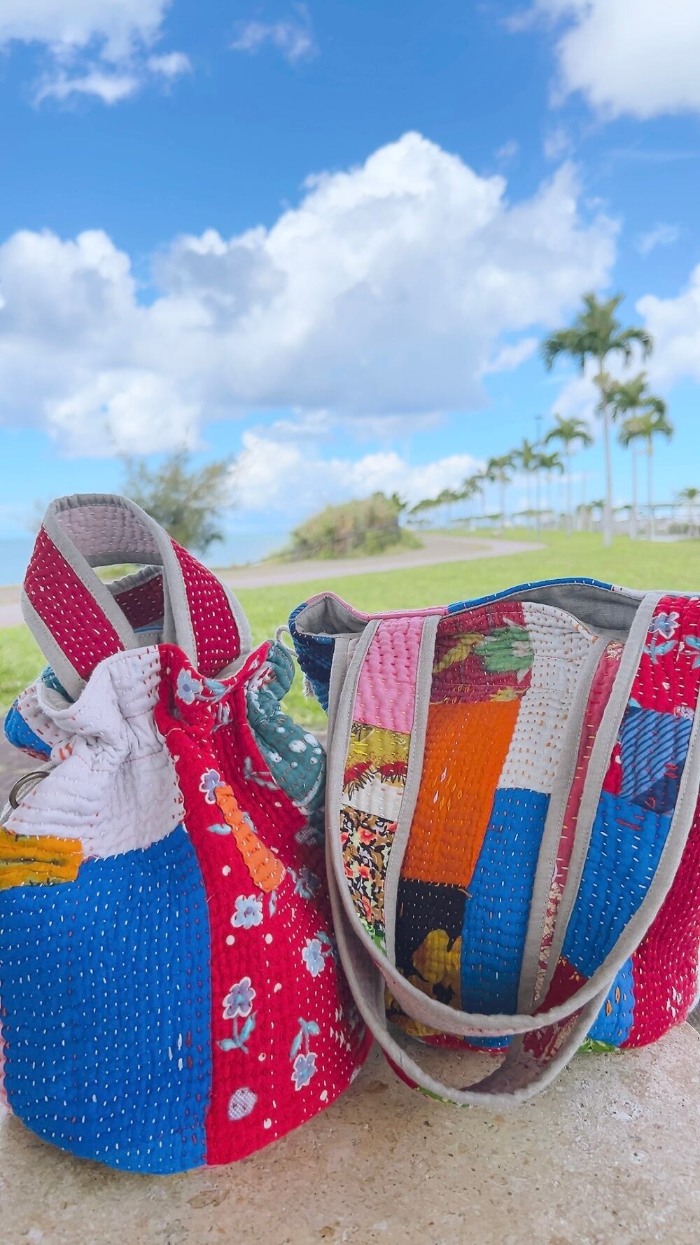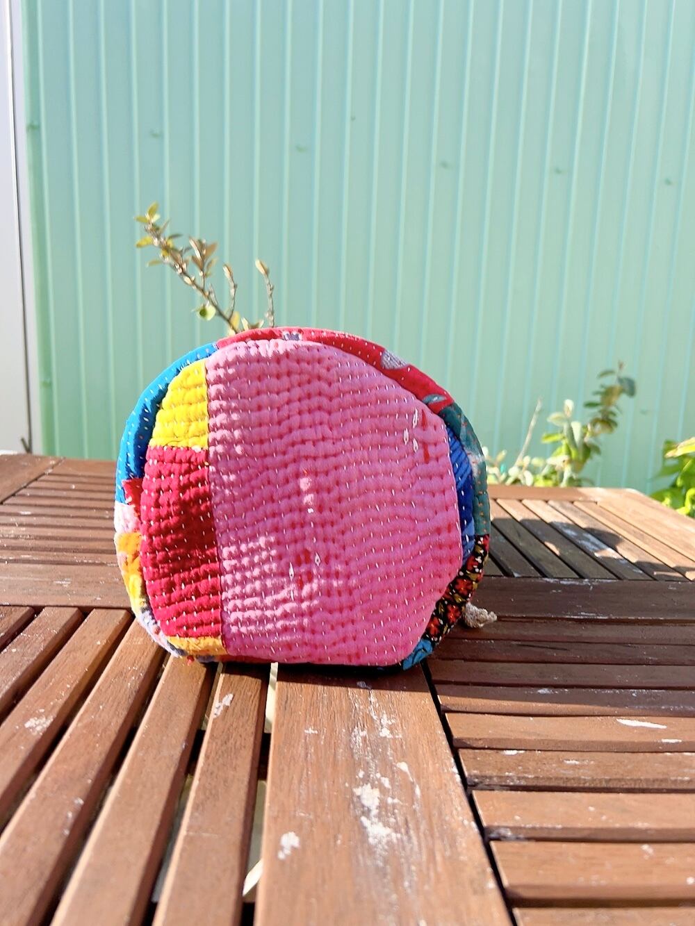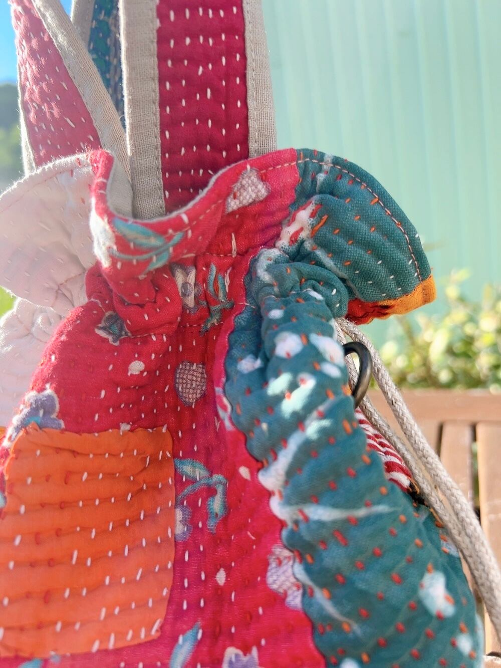 一点もののヴィンテージラリーキルトの巾着バッグ。カラフルなパッチワーク柄と可愛らしいサイズ感が魅力です。