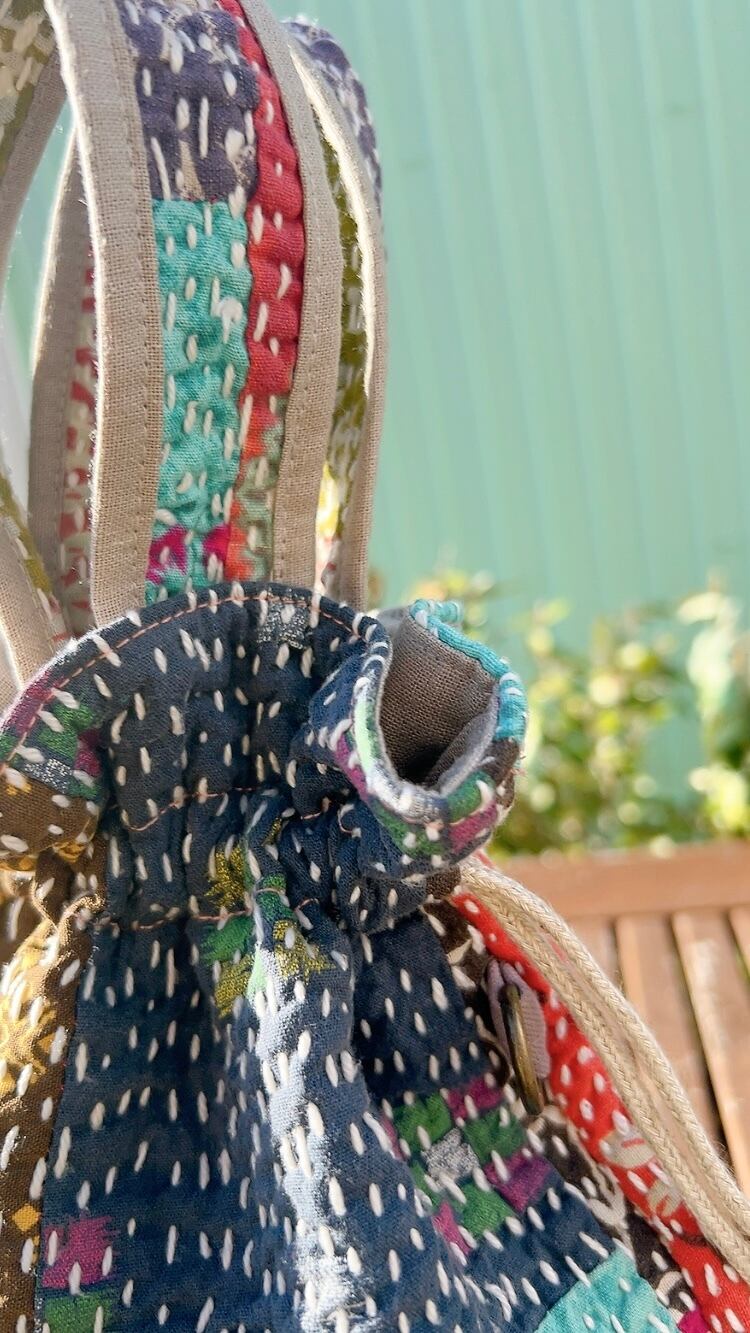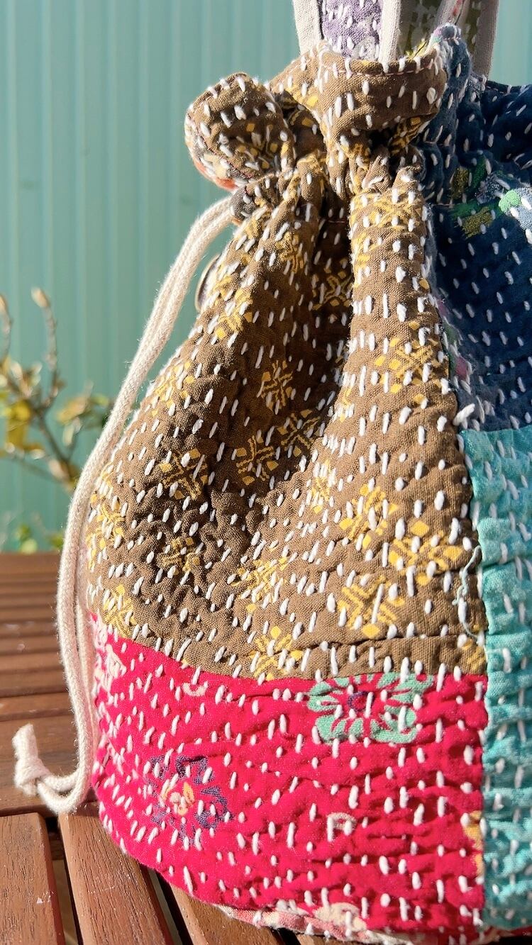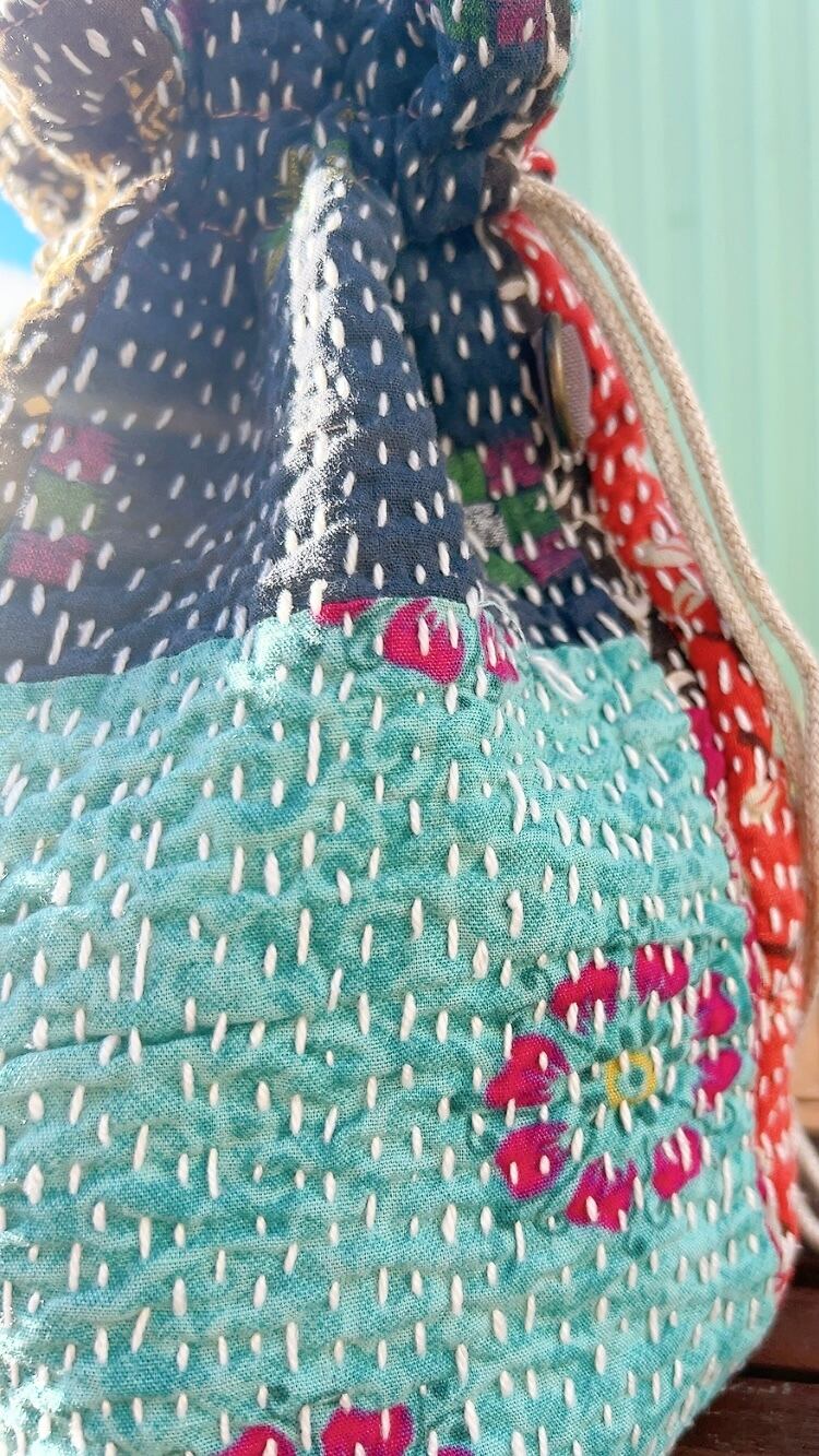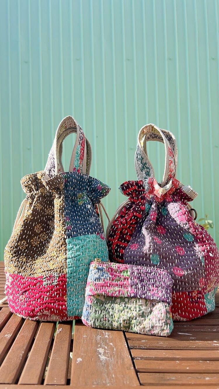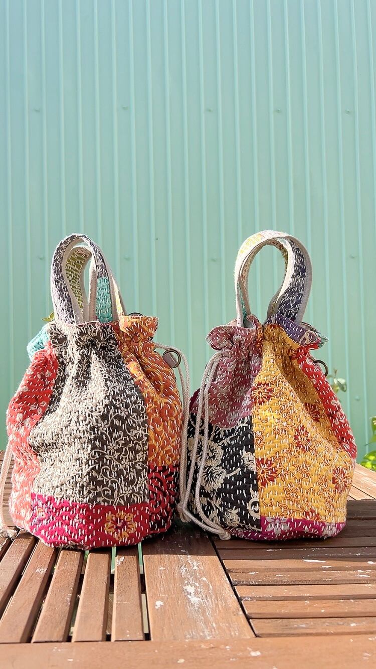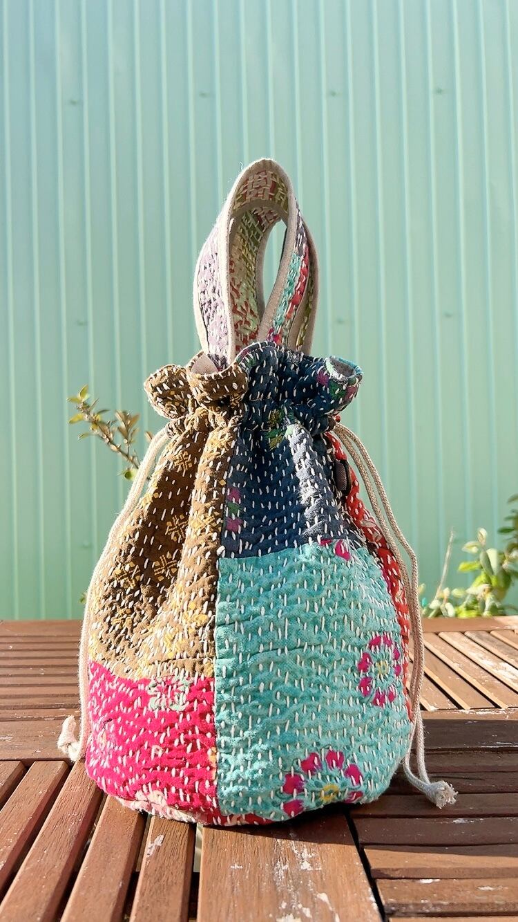 一点もののヴィンテージラリーキルトの巾着バッグ。カラフルなパッチワーク柄と可愛らしいサイズ感が魅力です。