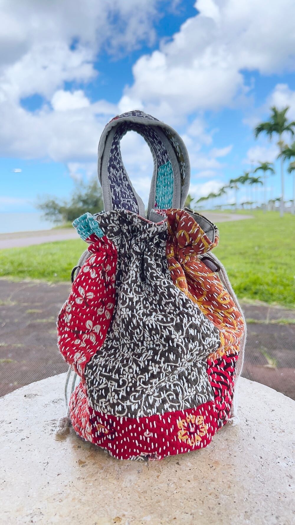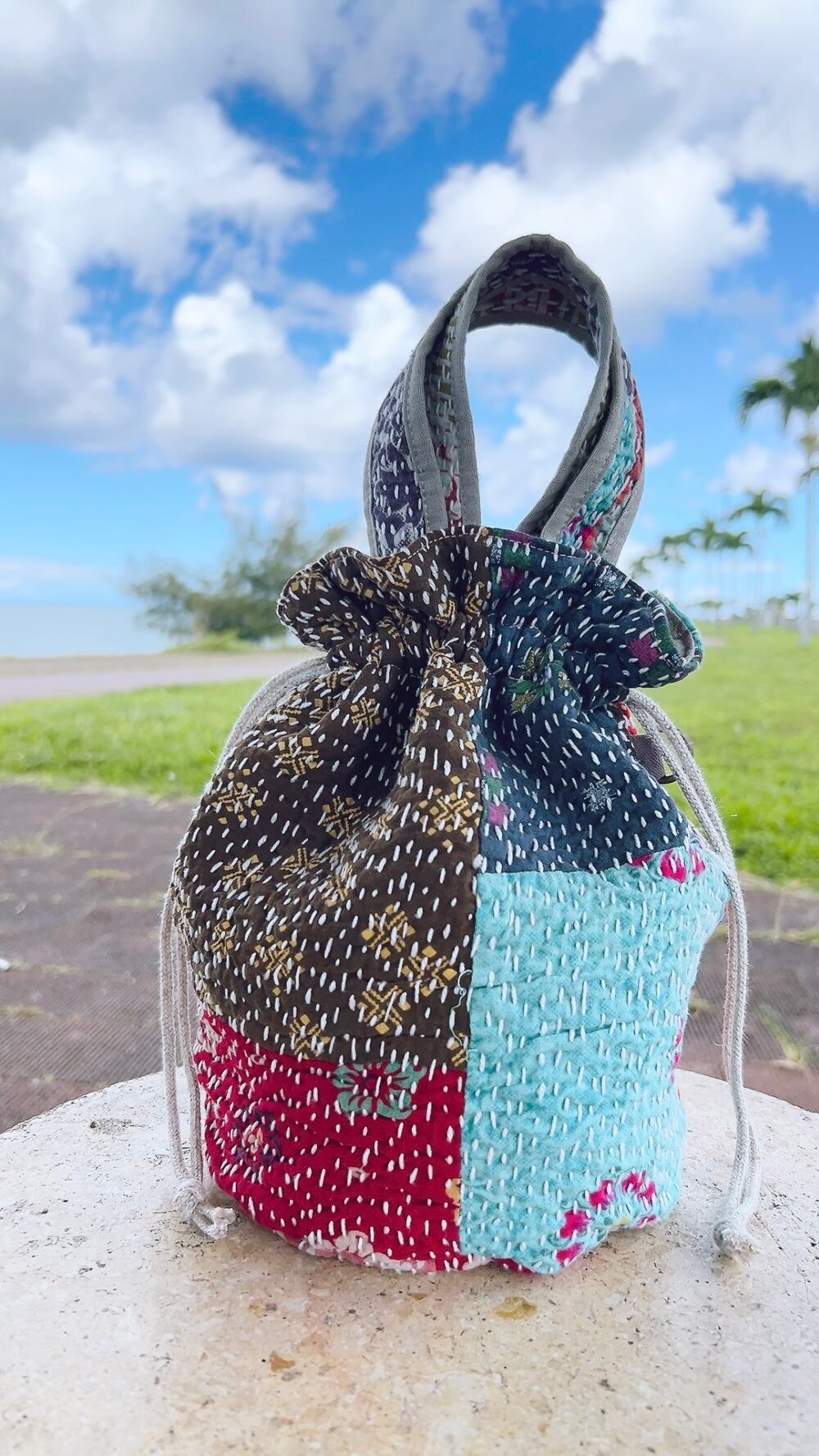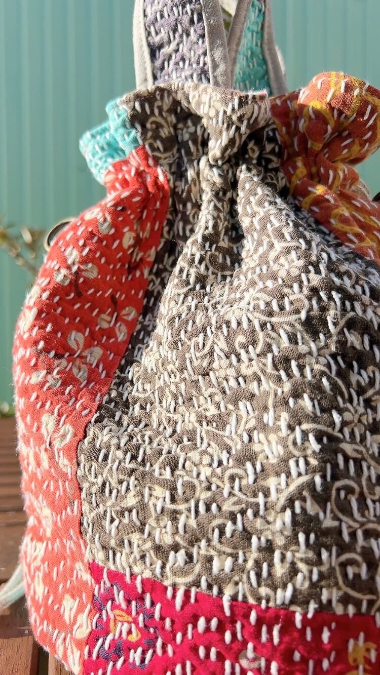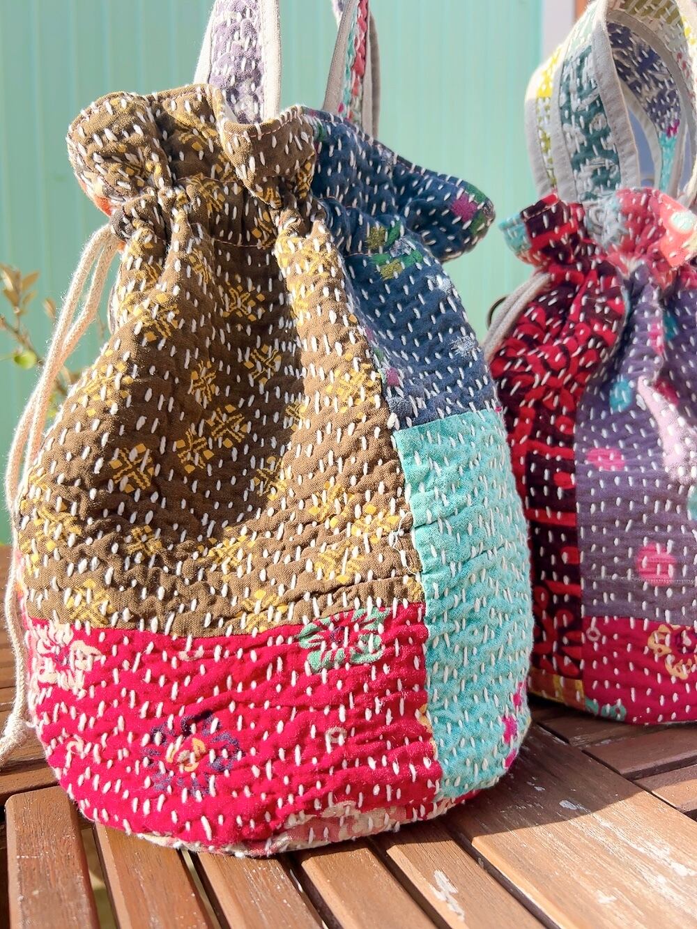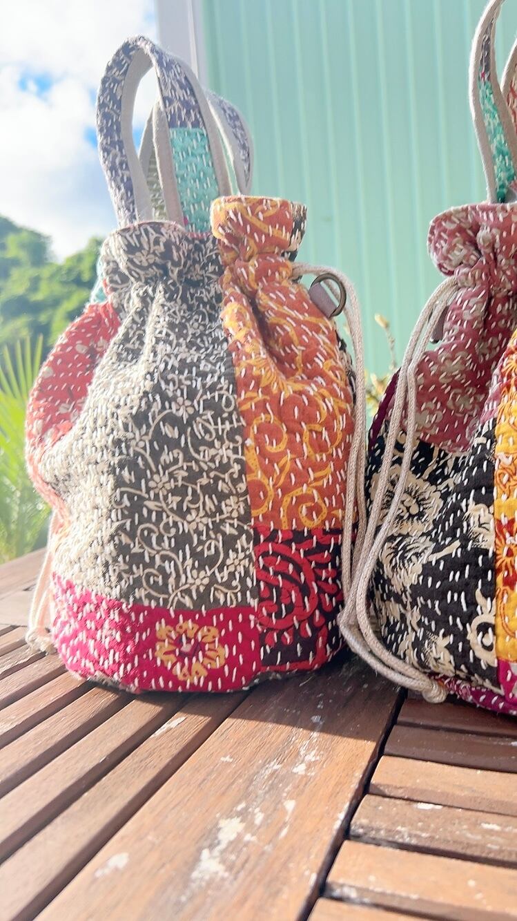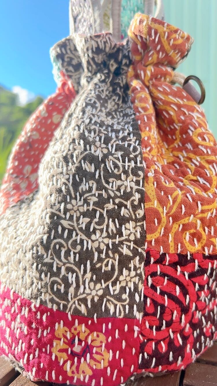 一点もののヴィンテージラリーキルトの巾着バッグ。カラフルなパッチワーク柄と可愛らしいサイズ感が魅力です。