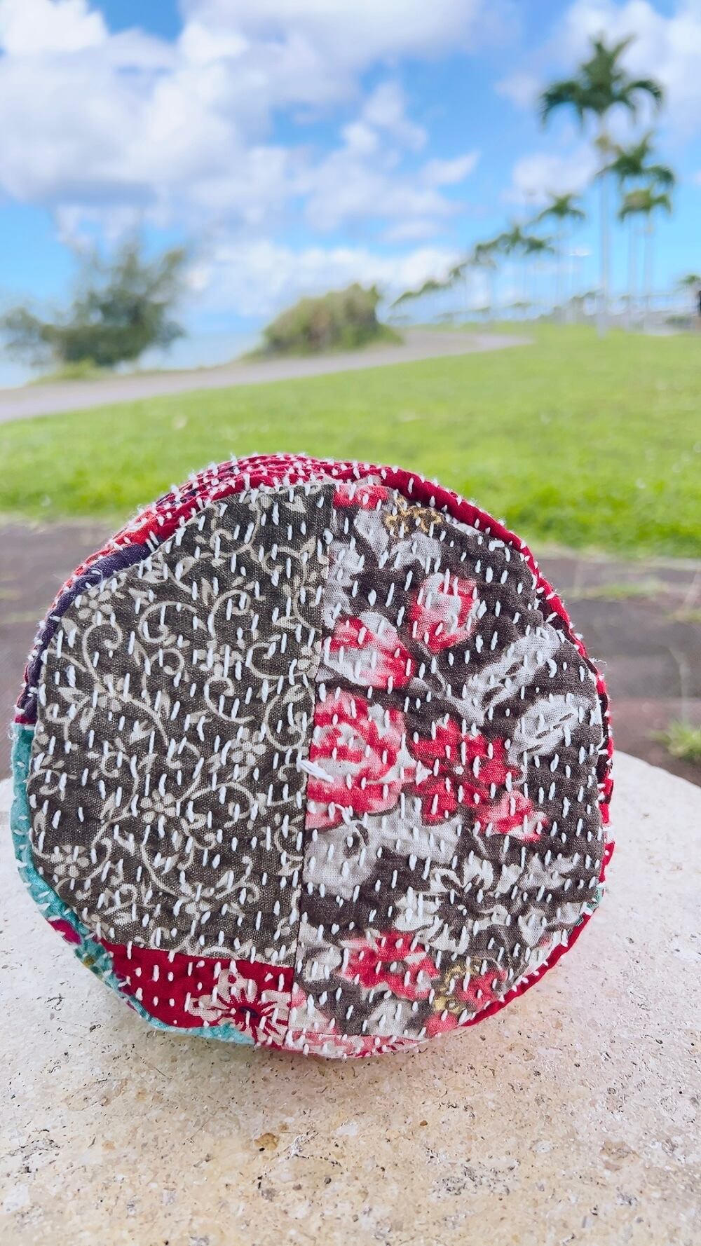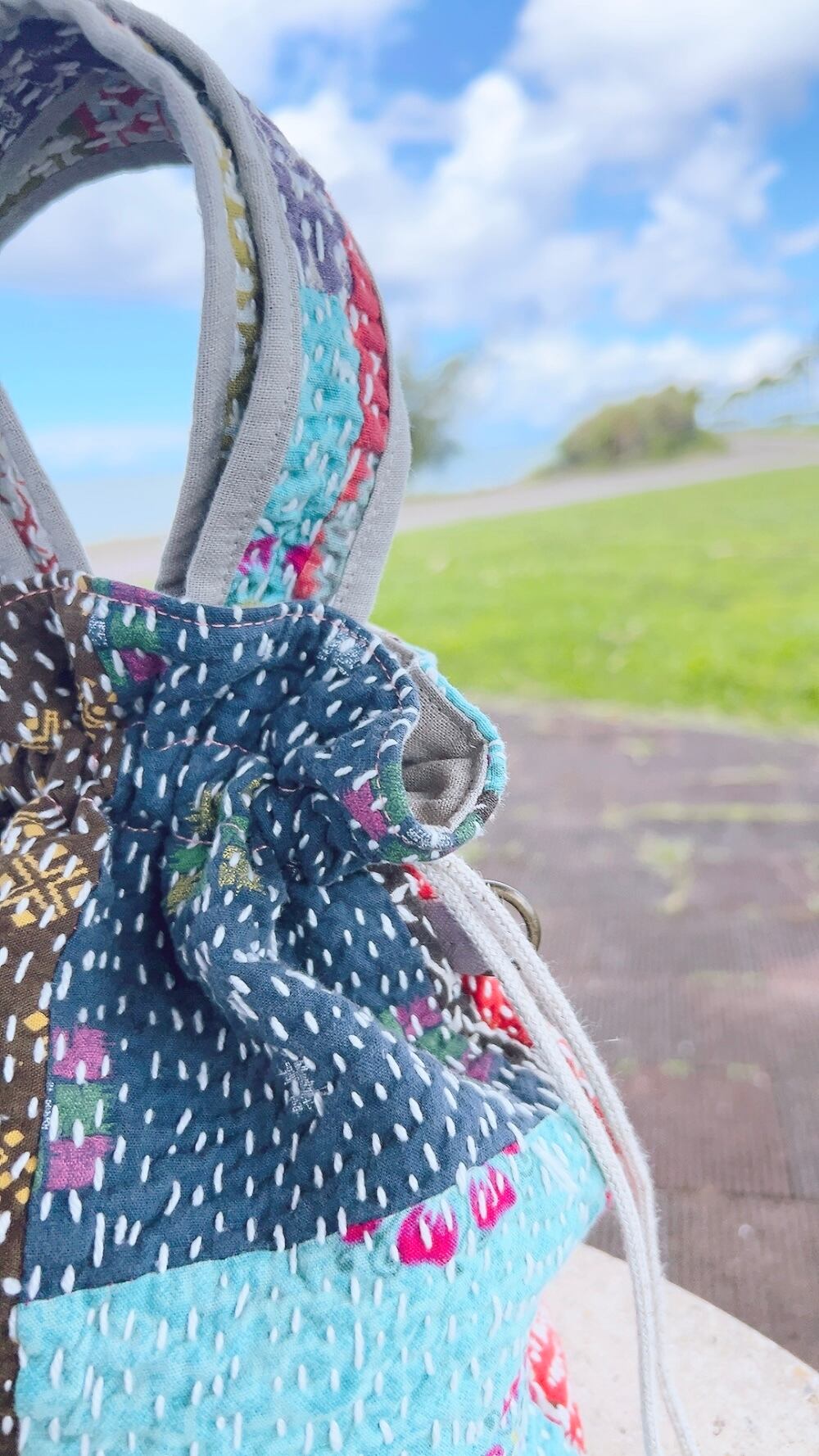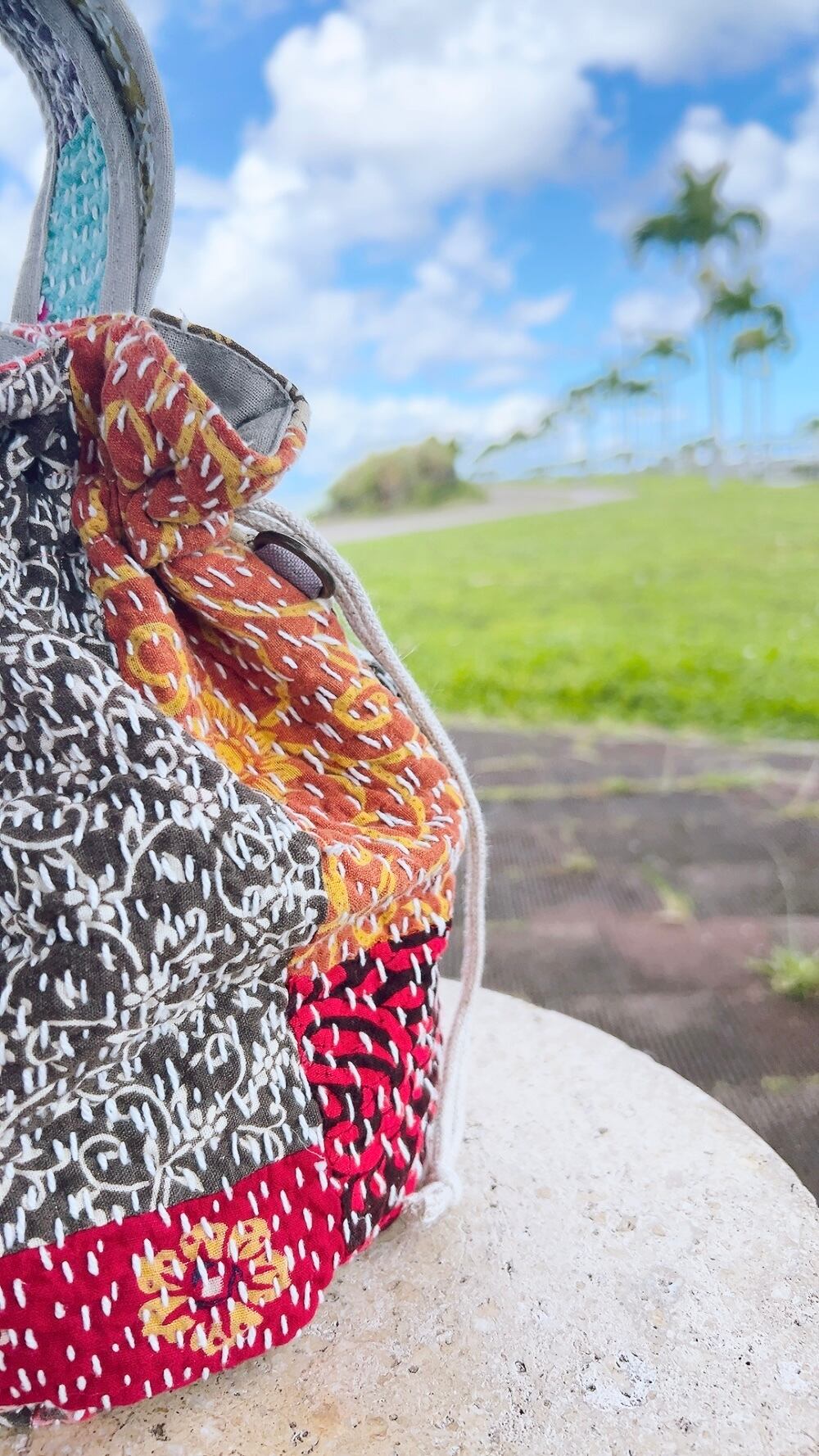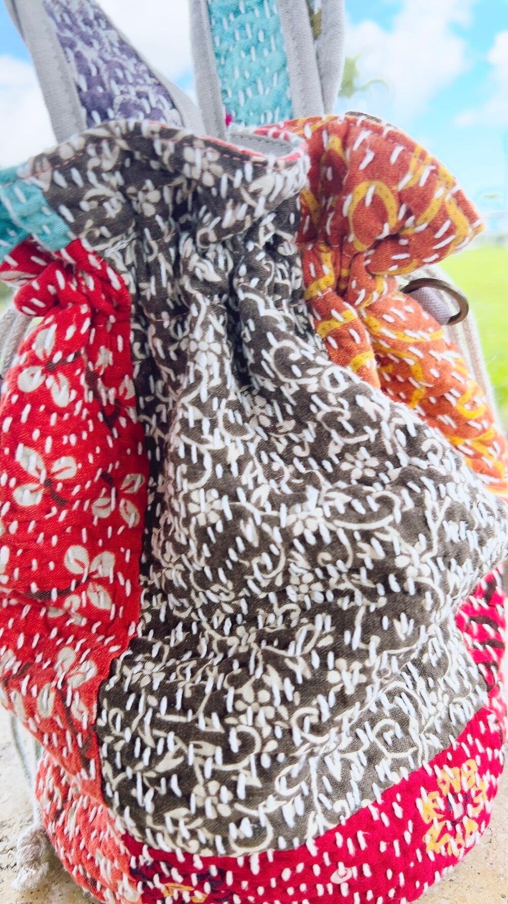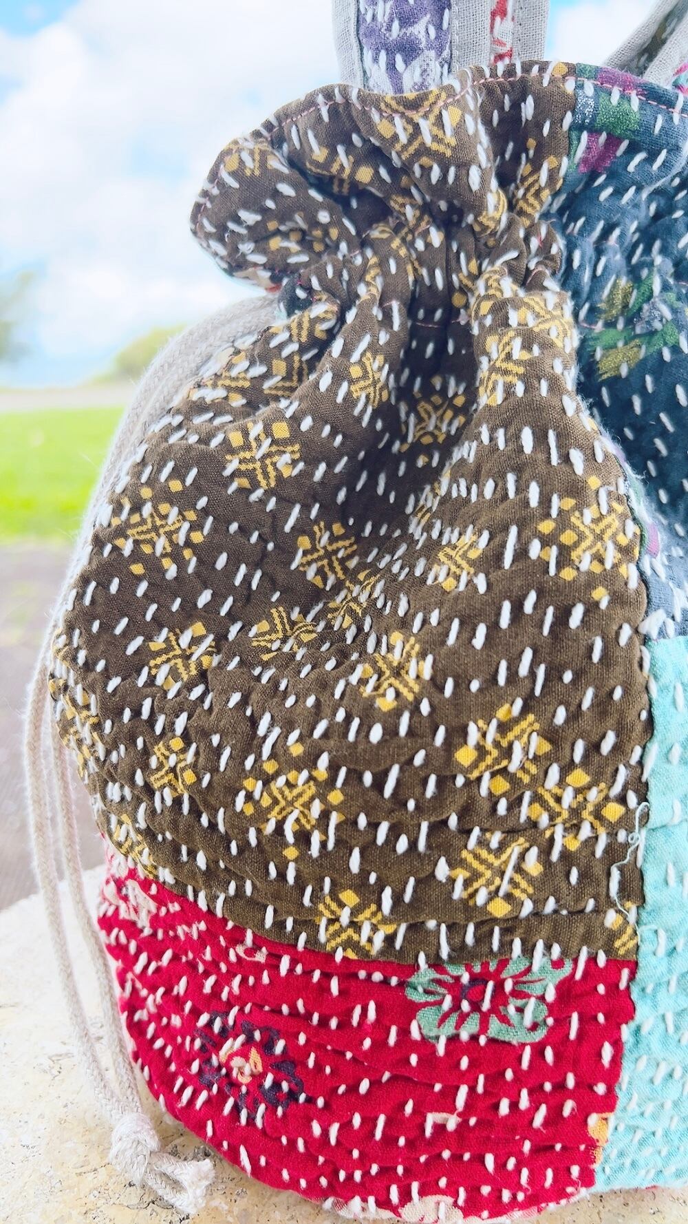 一点もののヴィンテージラリーキルトの巾着バッグ。カラフルなパッチワーク柄と可愛らしいサイズ感が魅力です。