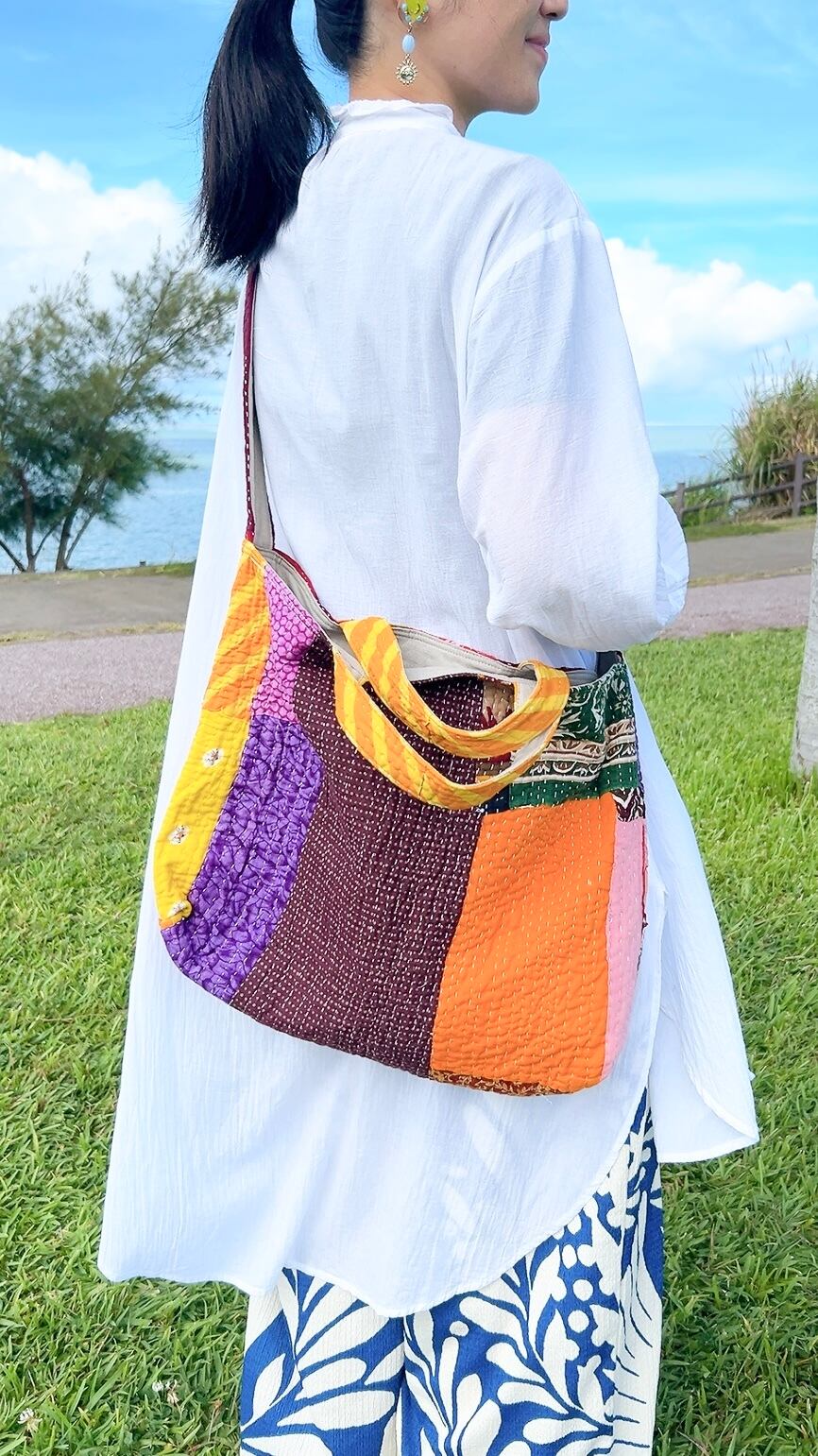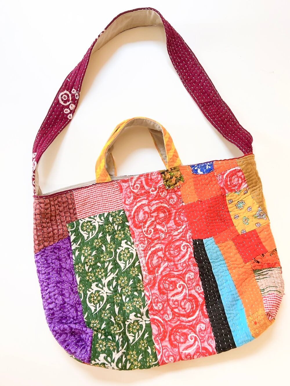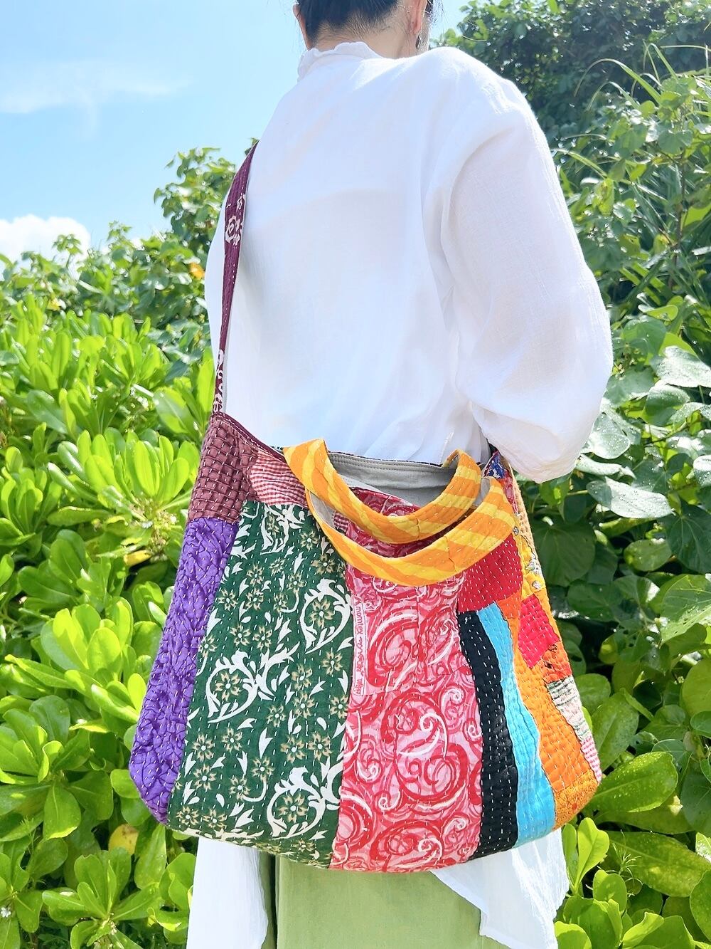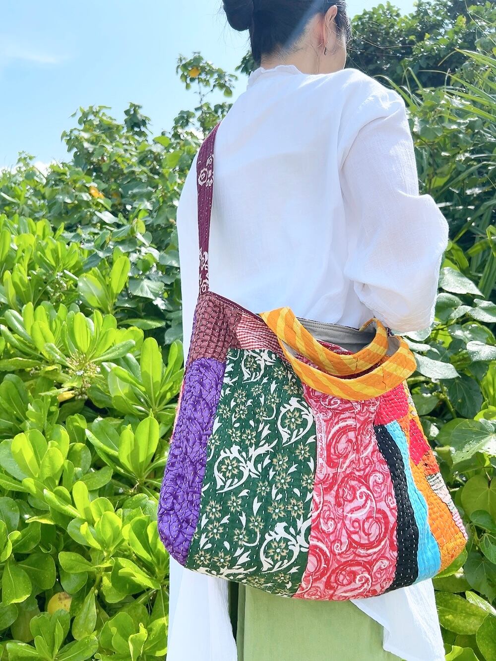 ヴィンテージ感漂うラリーキルトのトートバッグ。荷物もたっぷり入るので、大人の女性のおしゃれバッグとして、また普段のお買い物にもぴったりです。
