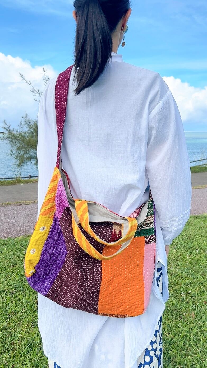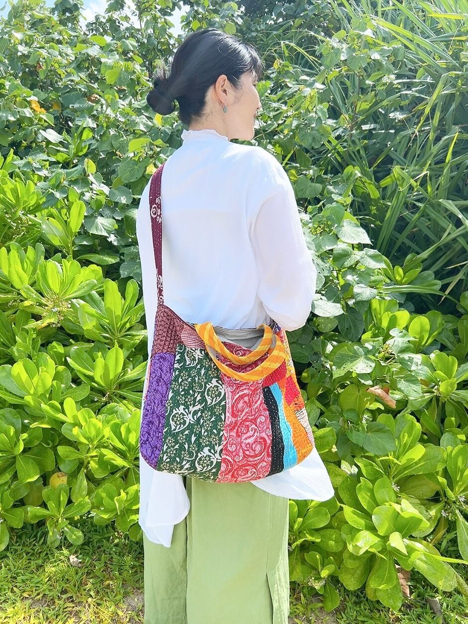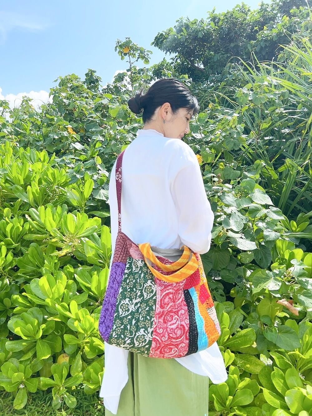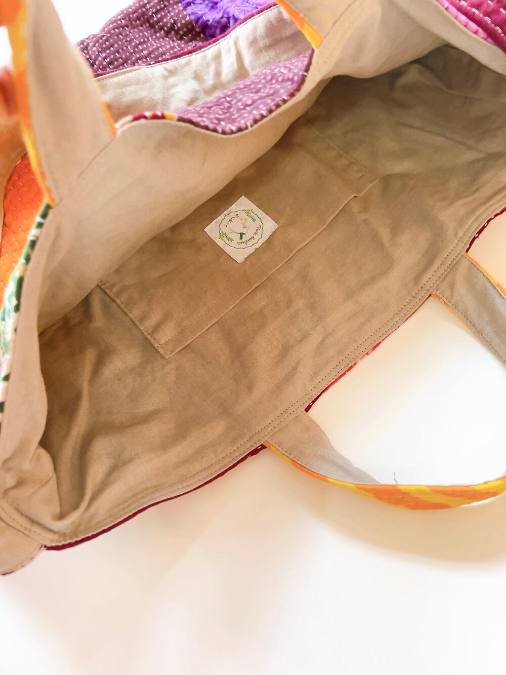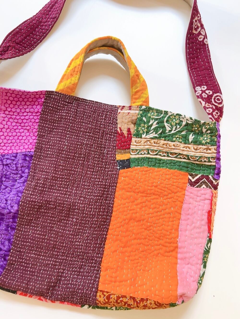 ヴィンテージ感漂うラリーキルトのトートバッグ。荷物もたっぷり入るので、大人の女性のおしゃれバッグとして、また普段のお買い物にもぴったりです。