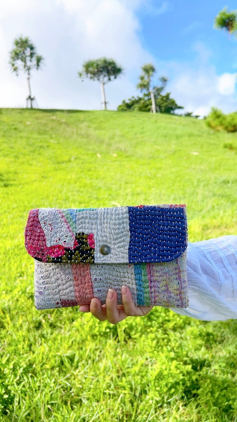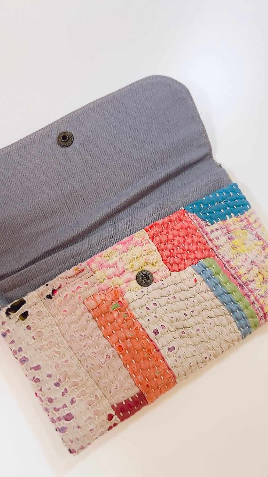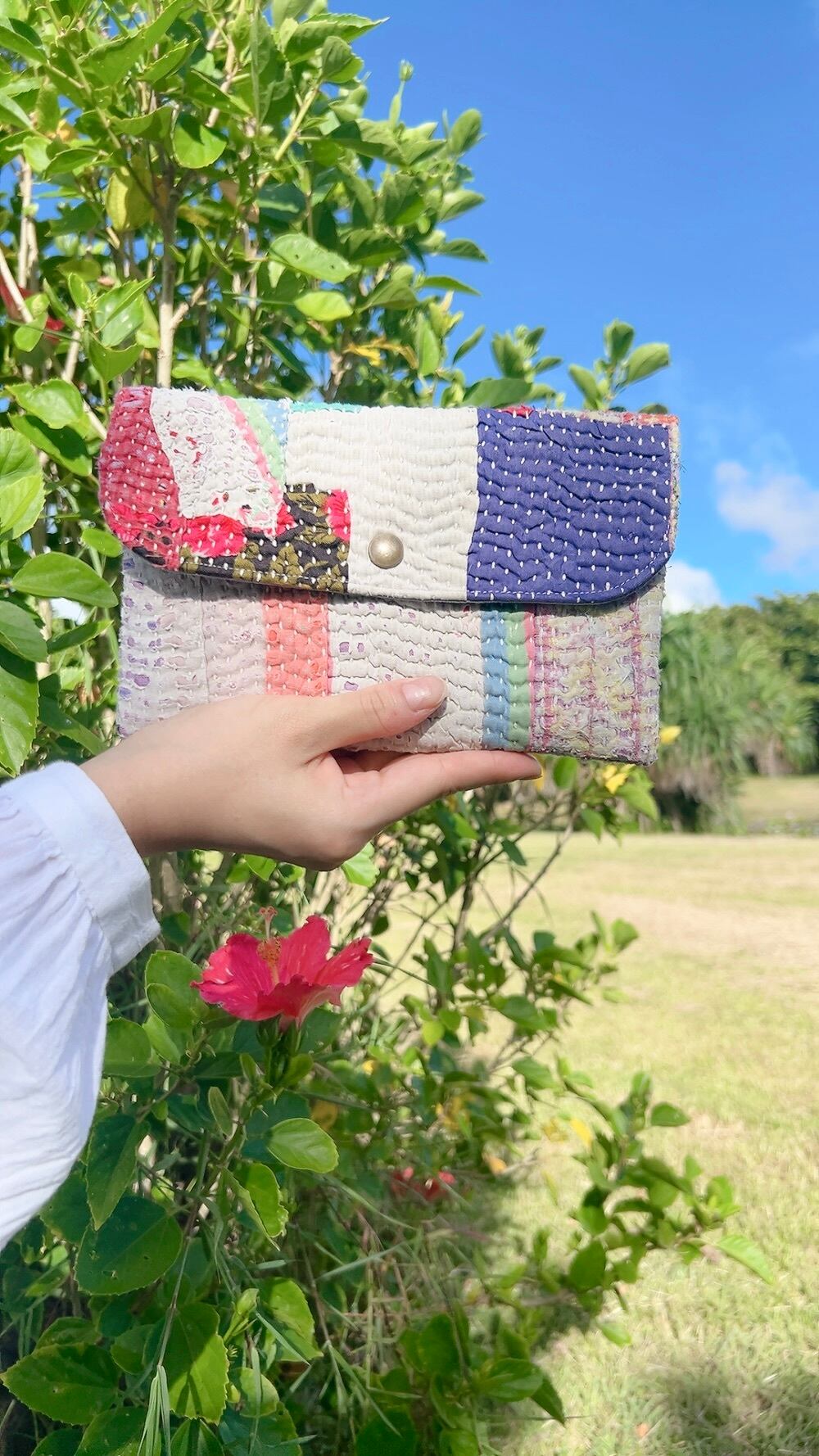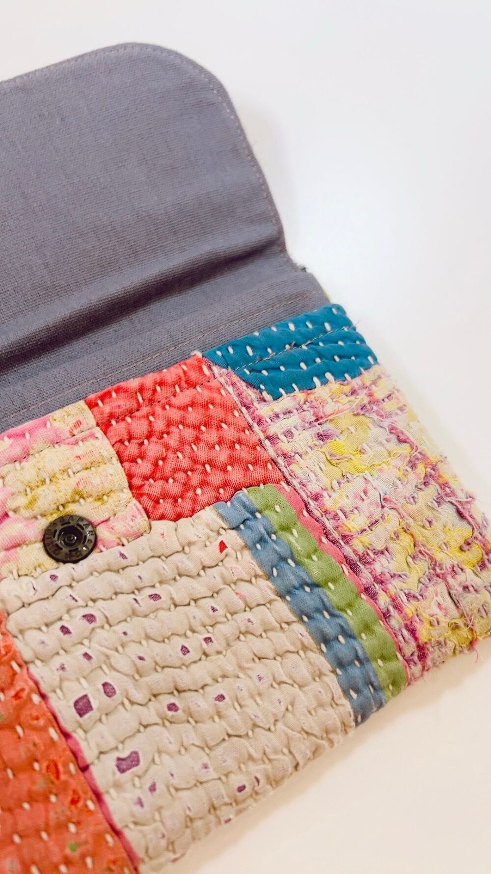 ヴィンテージラリーキルトから作られたフラットポーチです。コンパクトなサイズ感で、通帳や小物入れとしても便利にお使いいただけます。