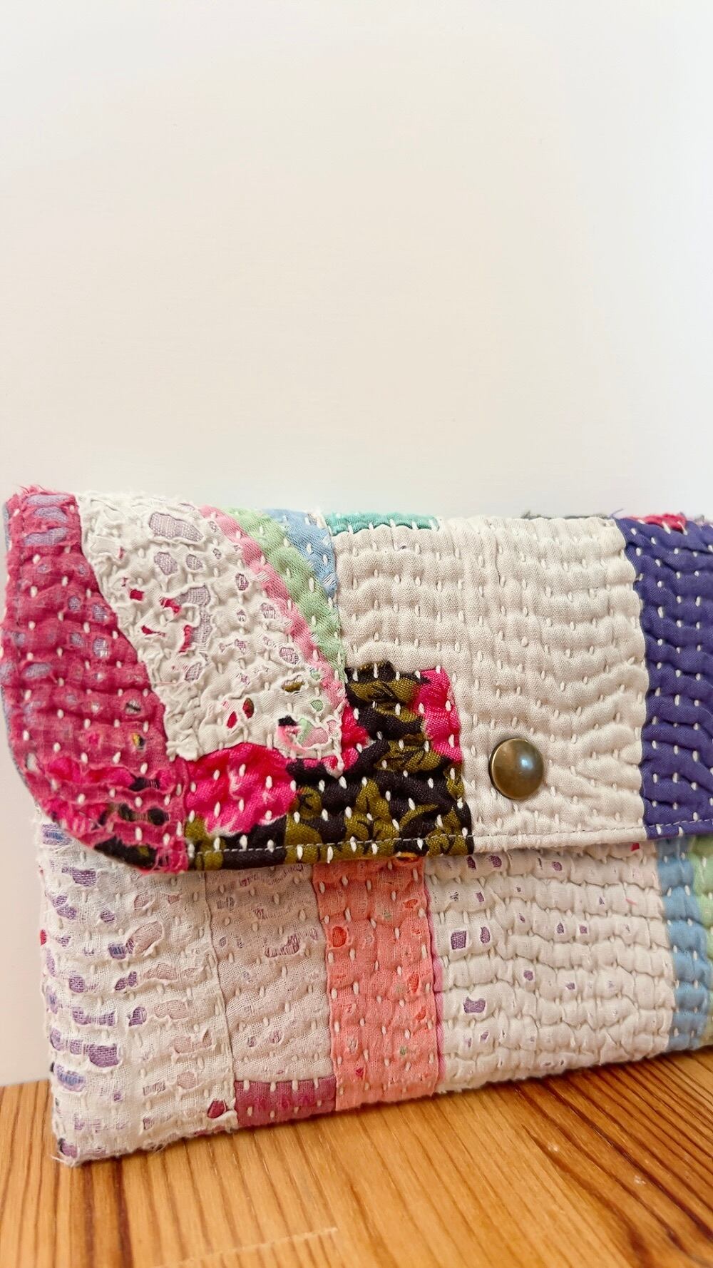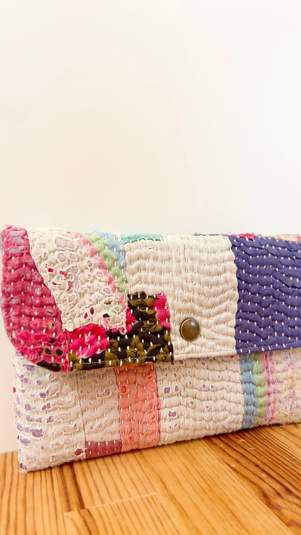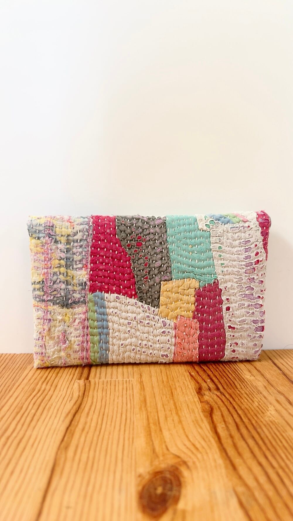 ヴィンテージラリーキルトから作られたフラットポーチです。コンパクトなサイズ感で、通帳や小物入れとしても便利にお使いいただけます。