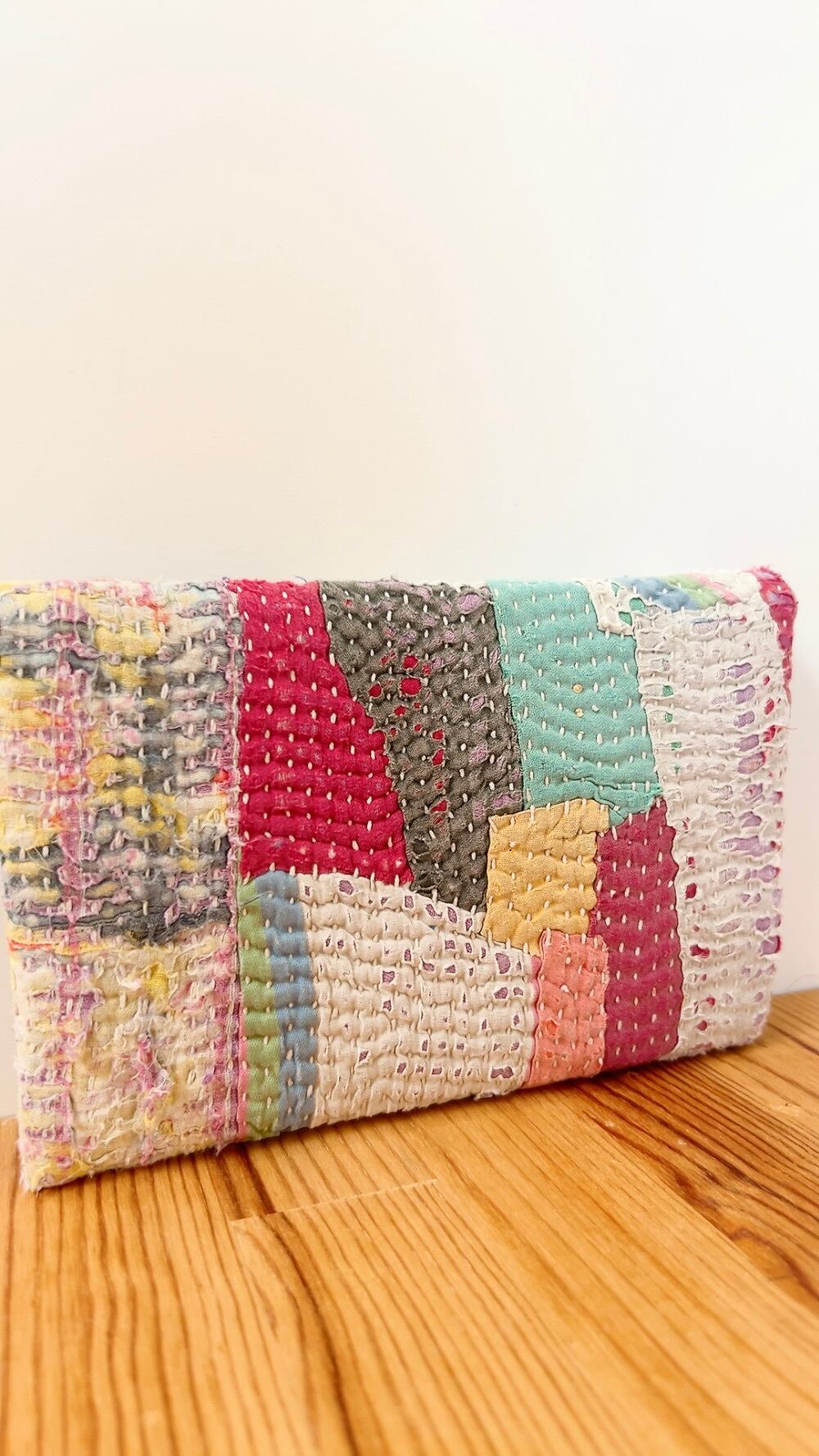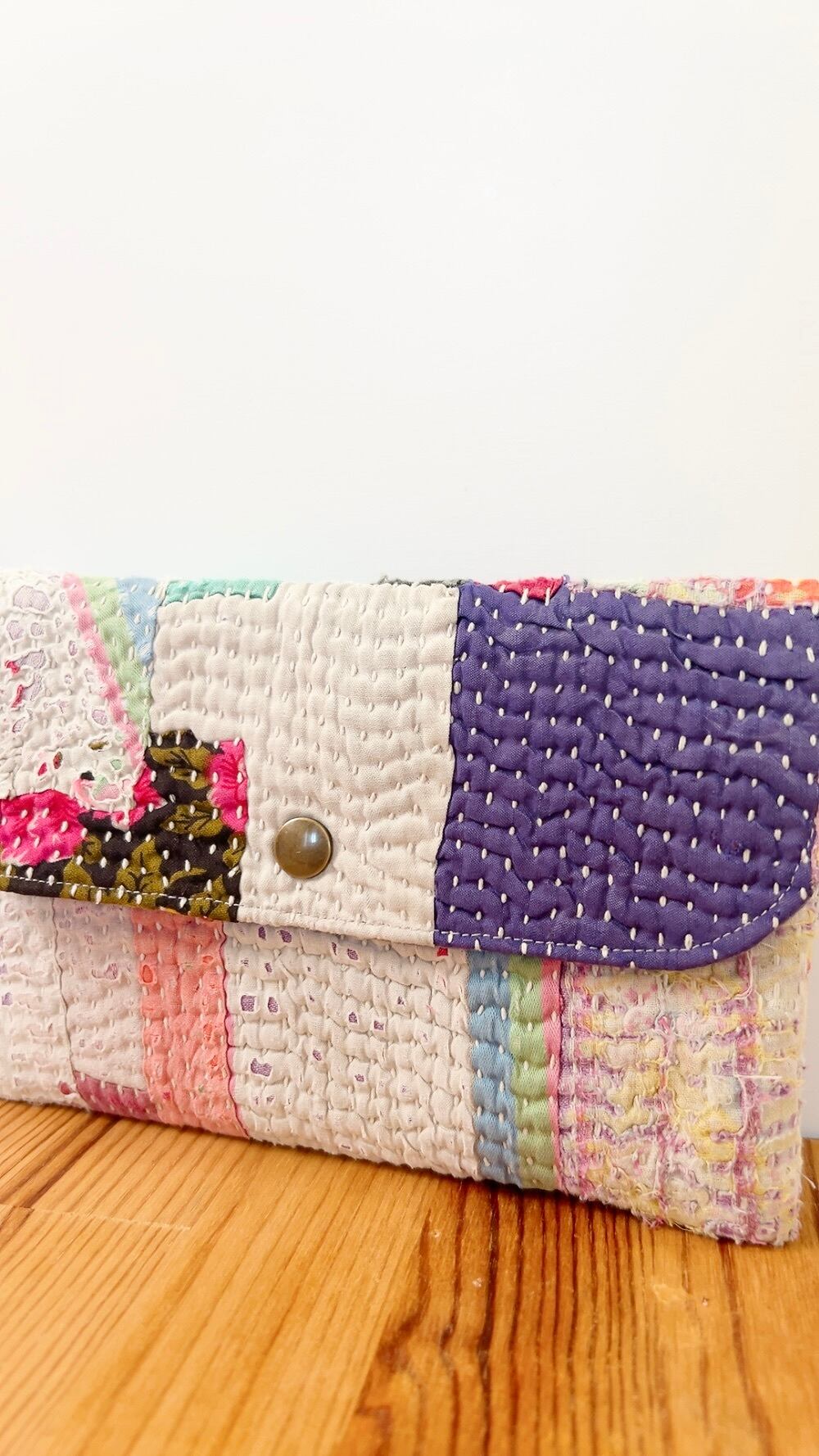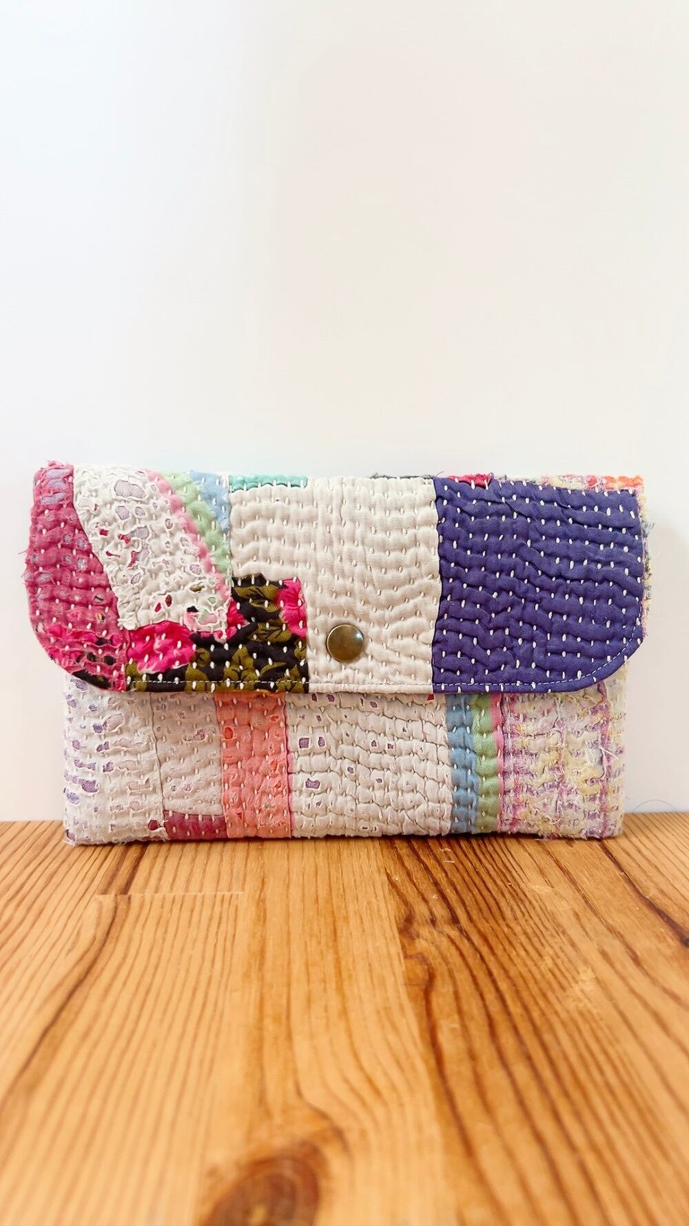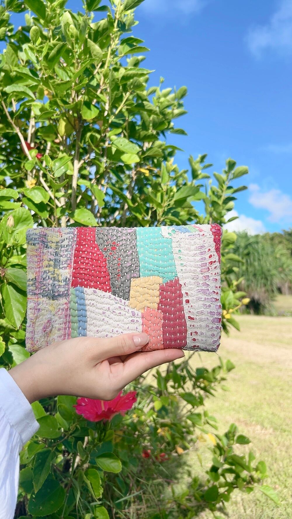 ヴィンテージラリーキルトから作られたフラットポーチです。コンパクトなサイズ感で、通帳や小物入れとしても便利にお使いいただけます。