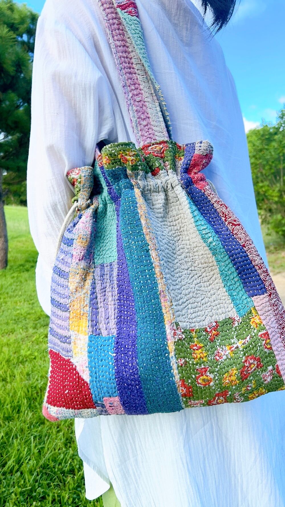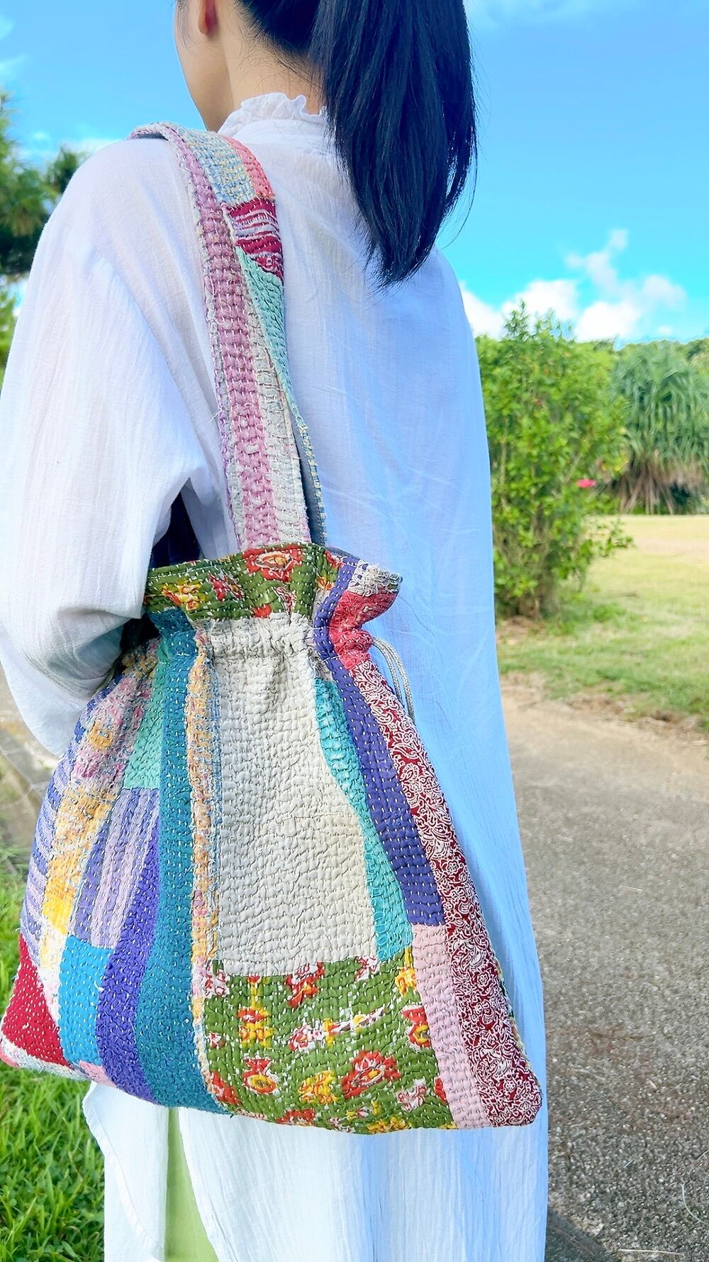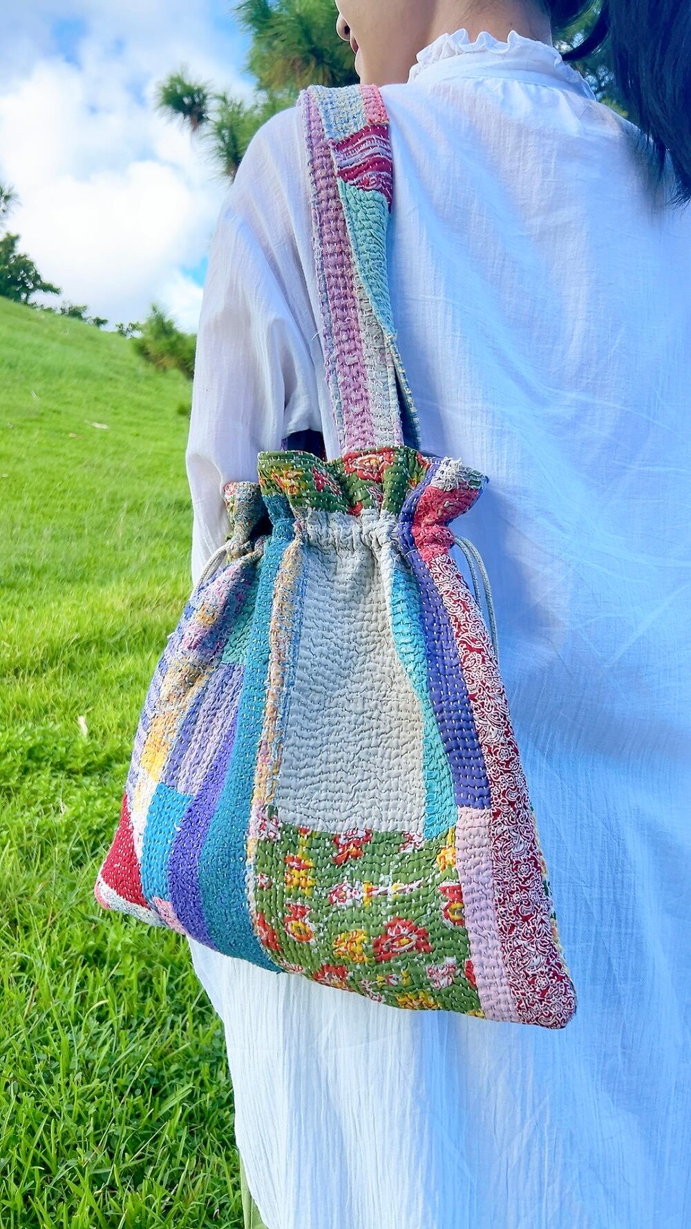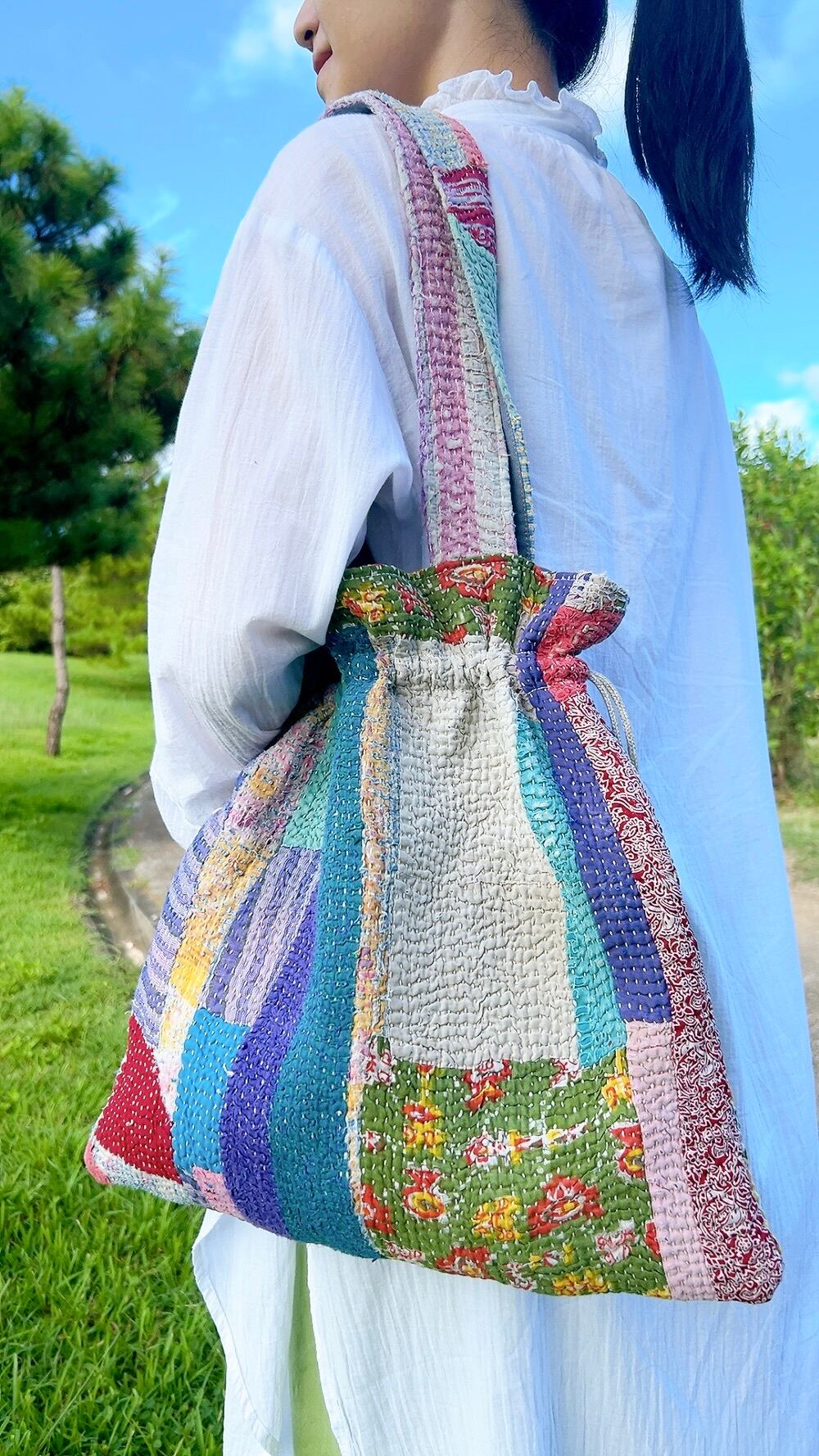 大きめ巾着トートバッグは、ヴィンテージ感あふれるラリーキルトを使用したおしゃれなアイテムです。風合い豊かな生地と独特のデザインが魅力で、日常使いから特別なお出かけシーンまで幅広く活躍します。