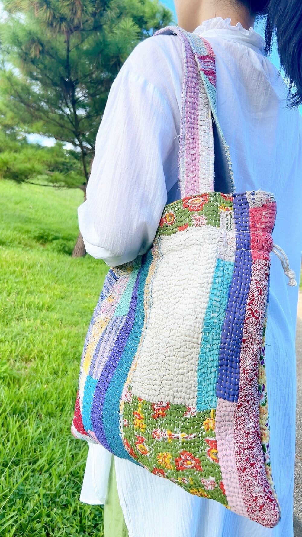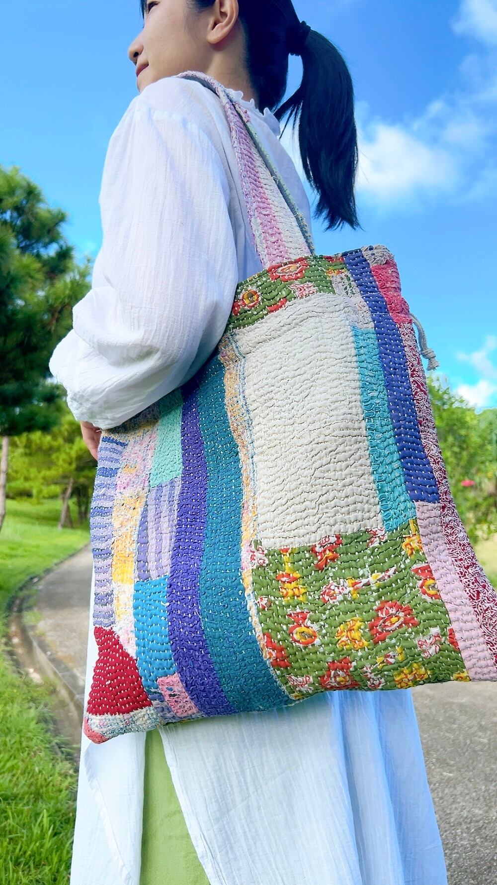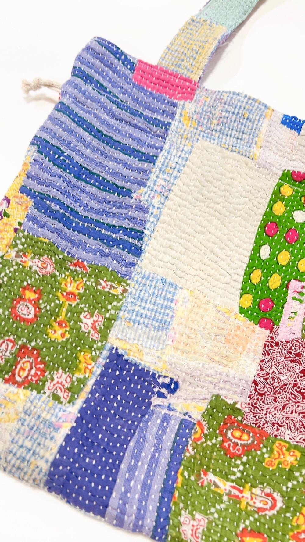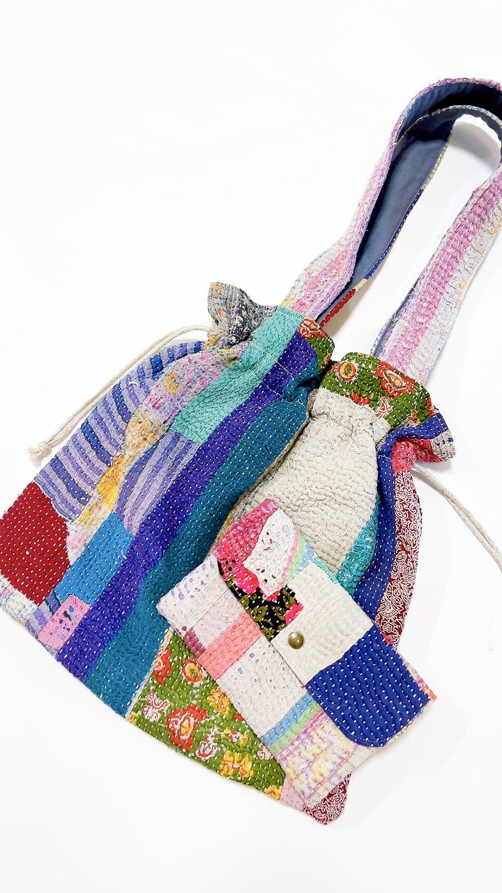 大きめ巾着トートバッグは、ヴィンテージ感あふれるラリーキルトを使用したおしゃれなアイテムです。風合い豊かな生地と独特のデザインが魅力で、日常使いから特別なお出かけシーンまで幅広く活躍します。