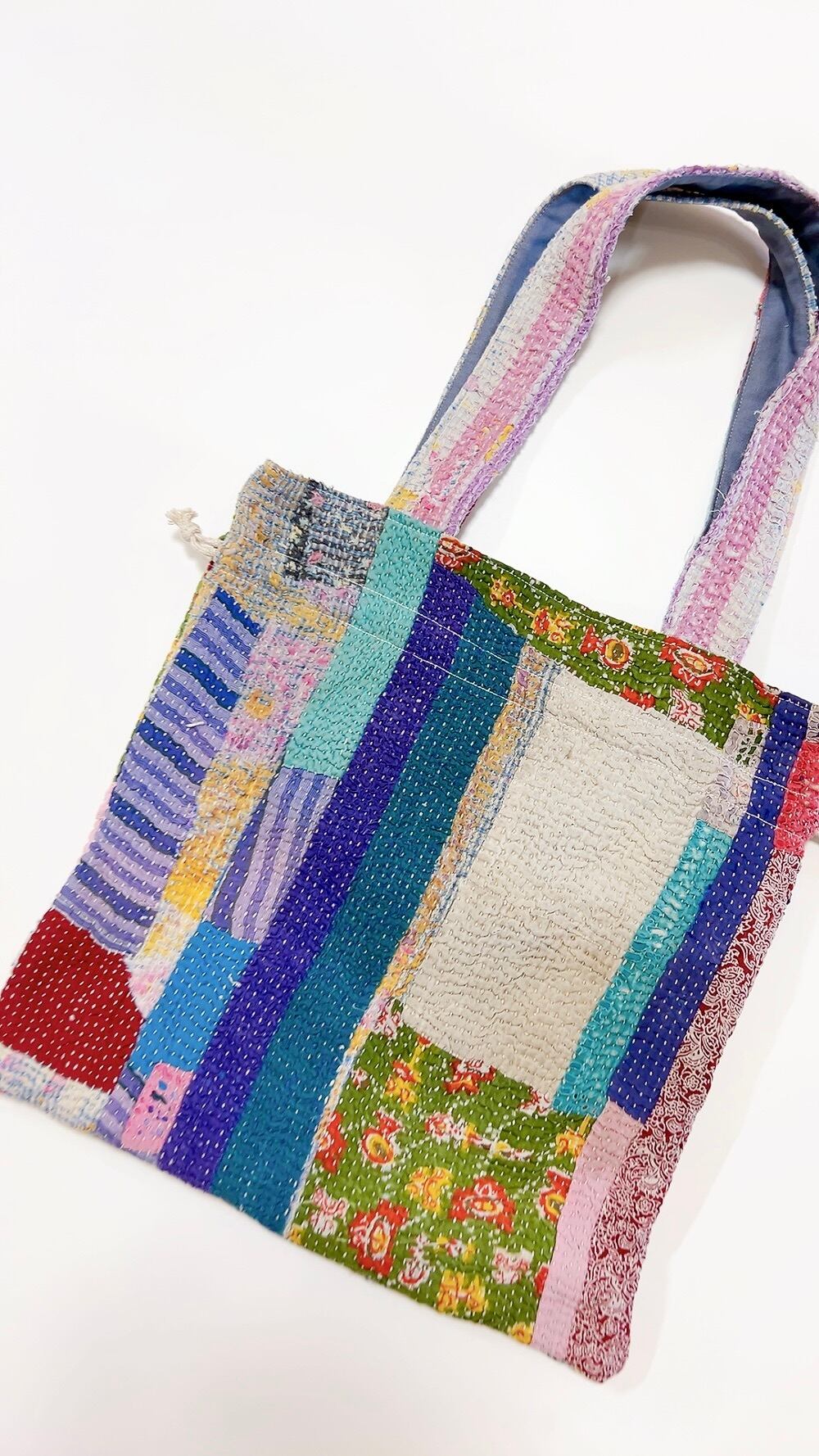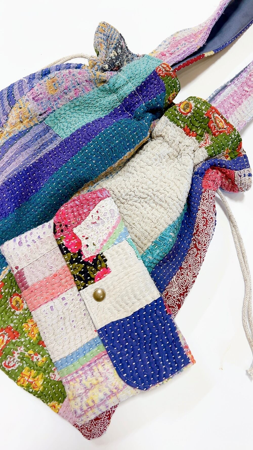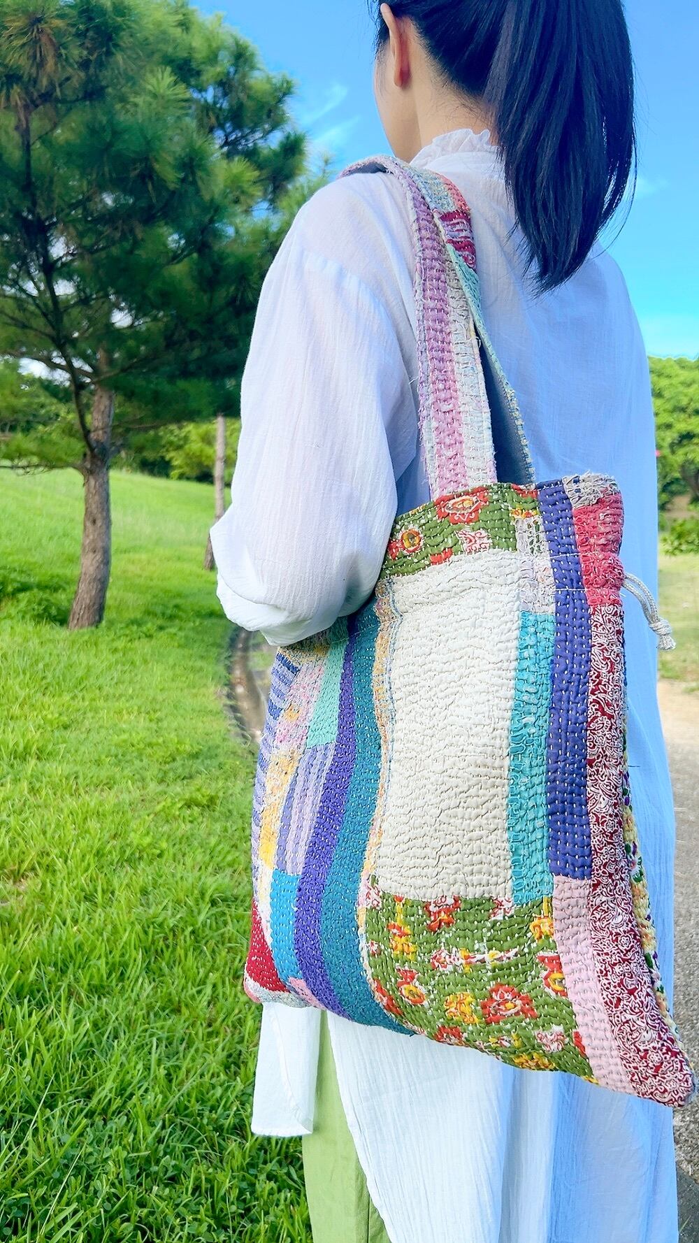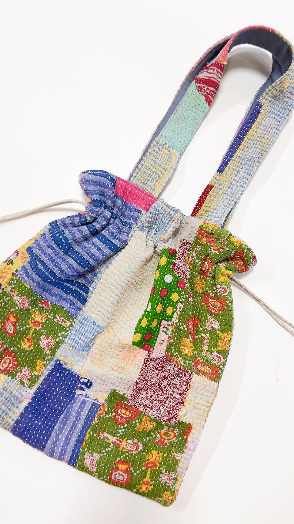大きめ巾着トートバッグは、ヴィンテージ感あふれるラリーキルトを使用したおしゃれなアイテムです。風合い豊かな生地と独特のデザインが魅力で、日常使いから特別なお出かけシーンまで幅広く活躍します。